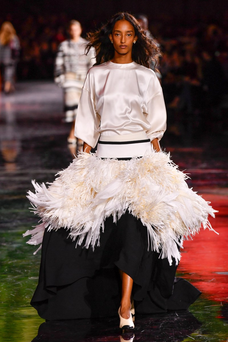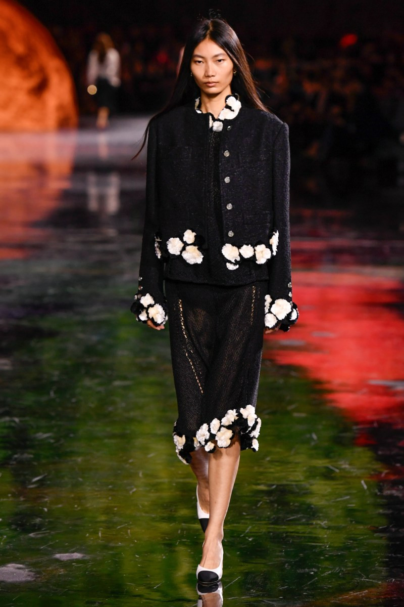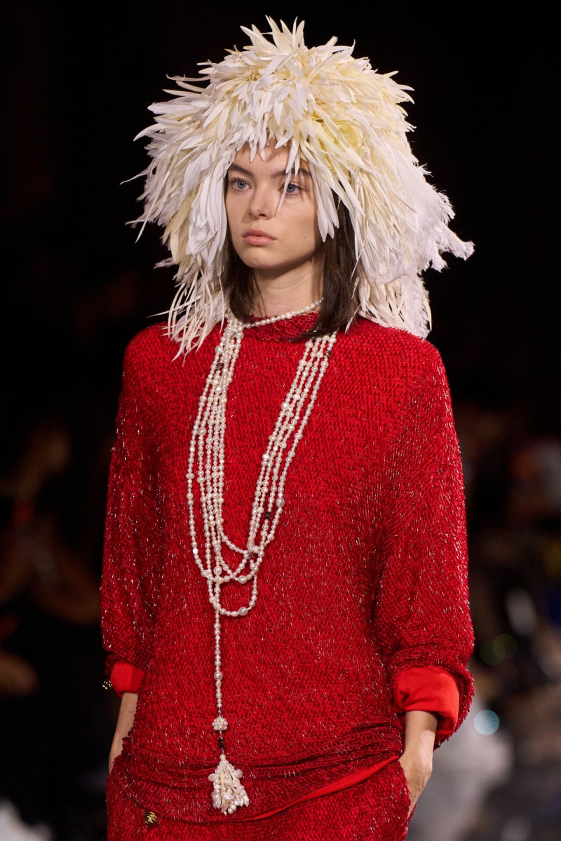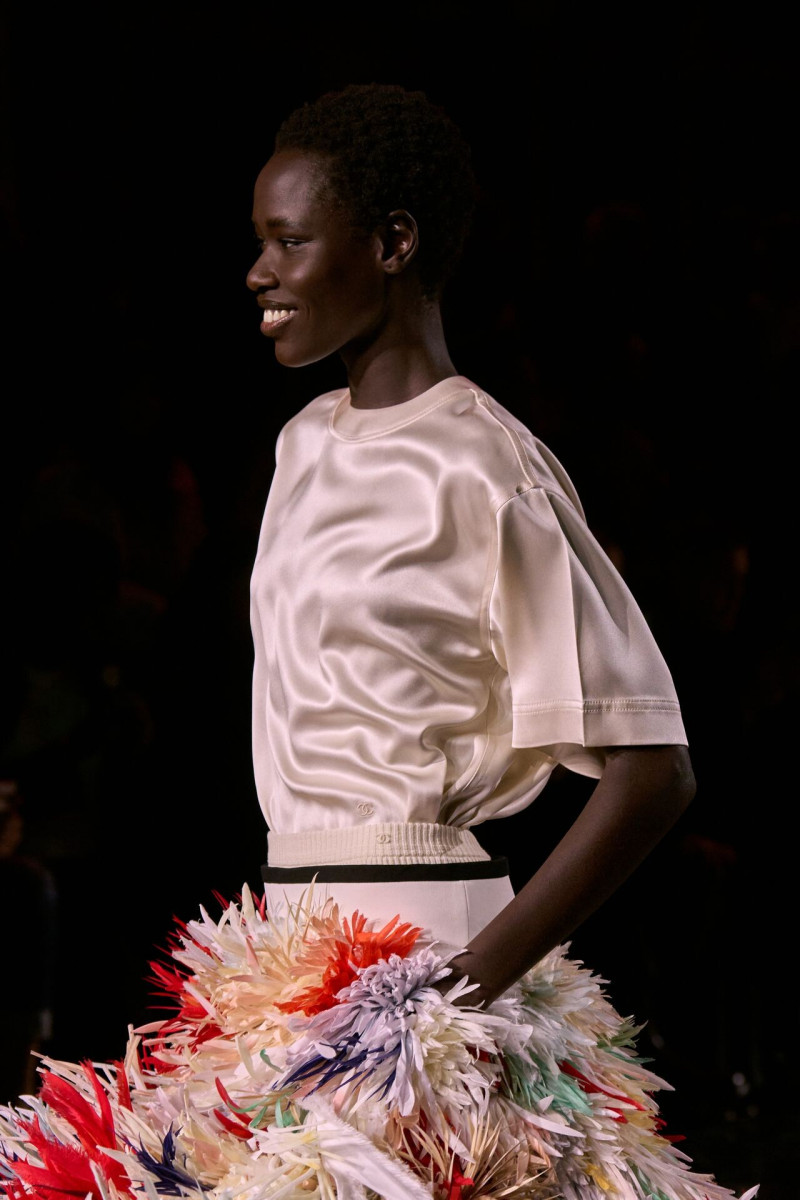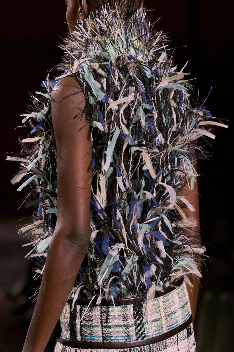 Помимо «очень Chanel» несколько образов на подиуме были «очень Блази». Дизайнеру позволили эту креативную вольность, как когда-то позволяли Карлу Лагерфельду. Мы увидели почерк дизайнера в образах с юбками-фламенко, головными уборами, похожими на «соломенные» парики, цветочных мотивах, выполненных из перьев.