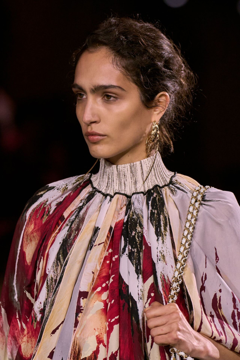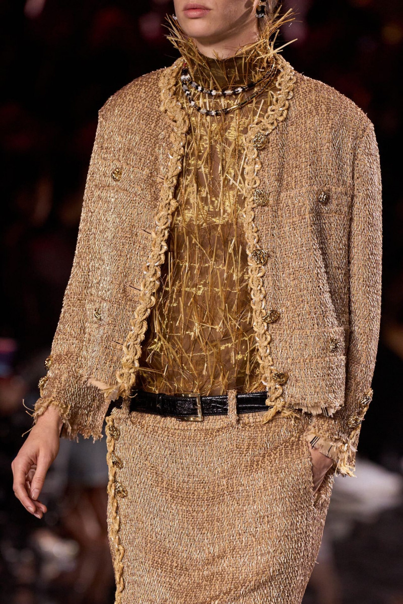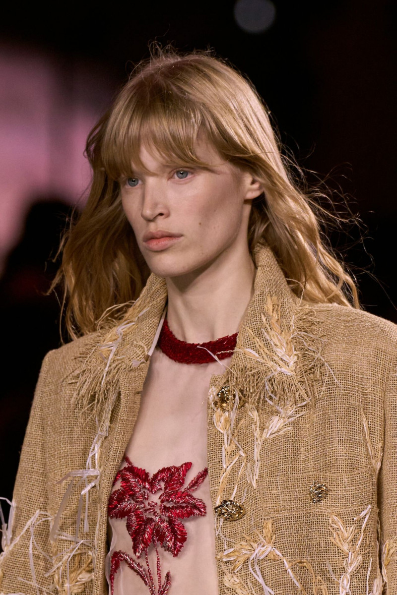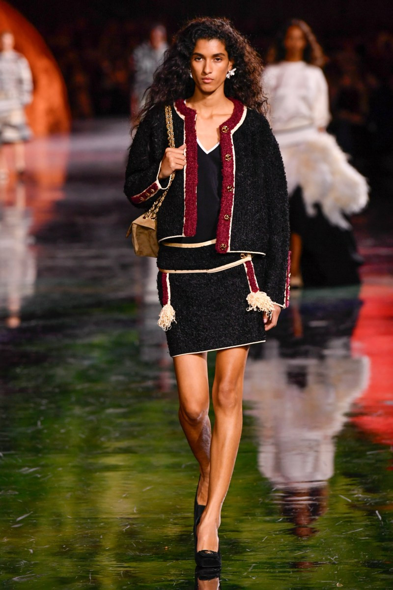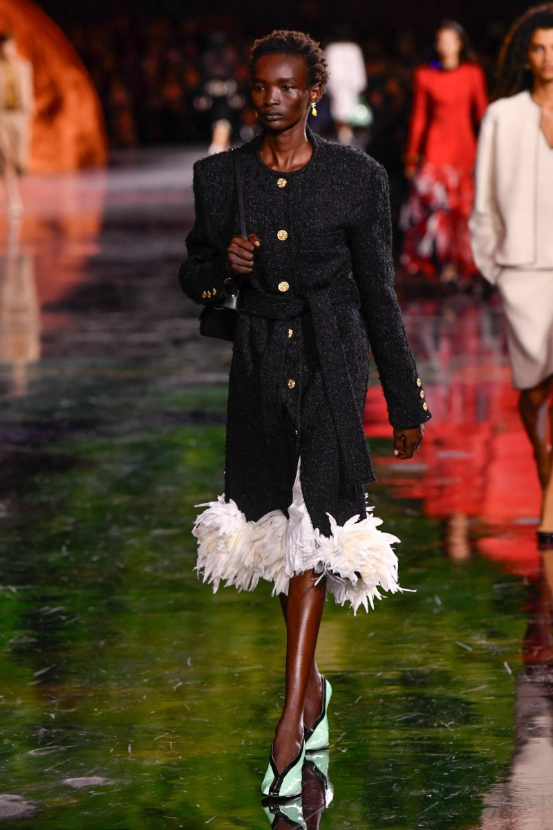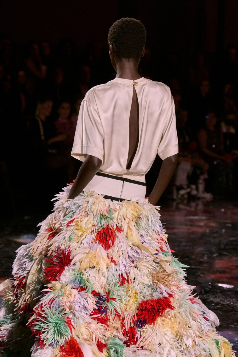 Помимо «очень Chanel» несколько образов на подиуме были «очень Блази». Дизайнеру позволили эту креативную вольность, как когда-то позволяли Карлу Лагерфельду. Мы увидели почерк дизайнера в образах с юбками-фламенко, головными уборами, похожими на «соломенные» парики, цветочных мотивах, выполненных из перьев.