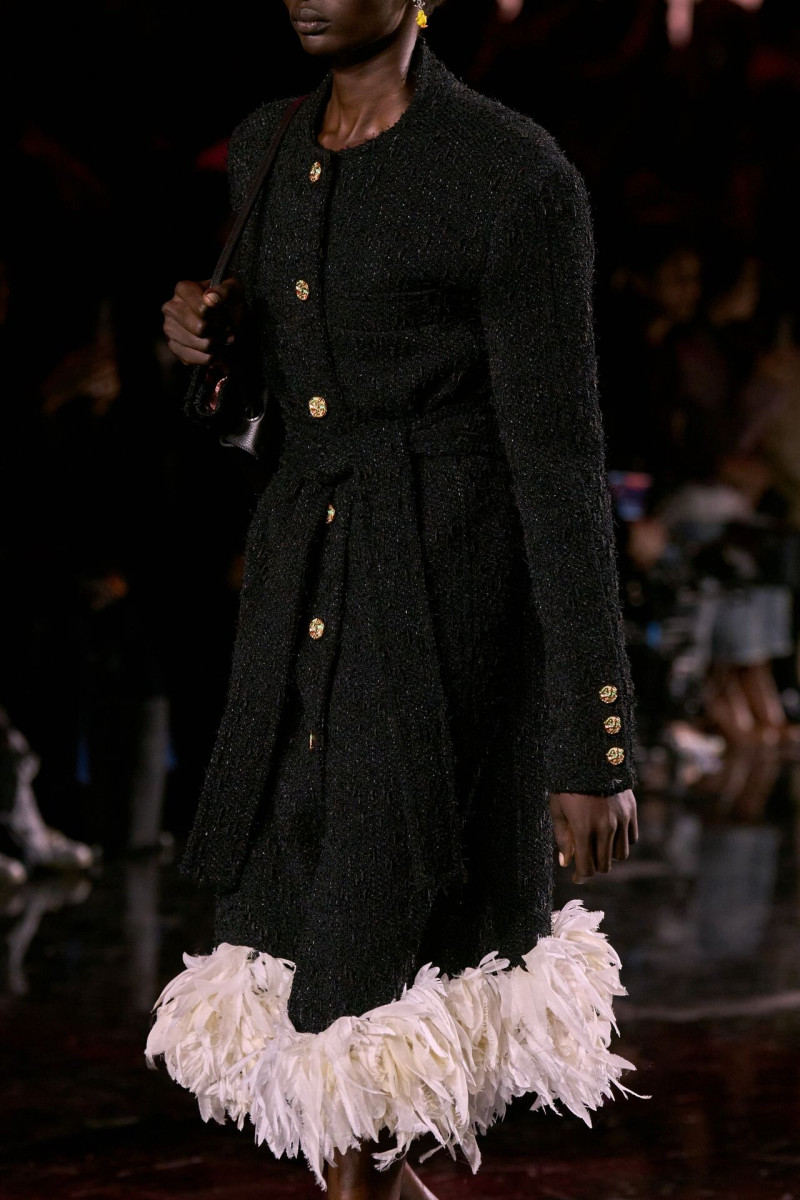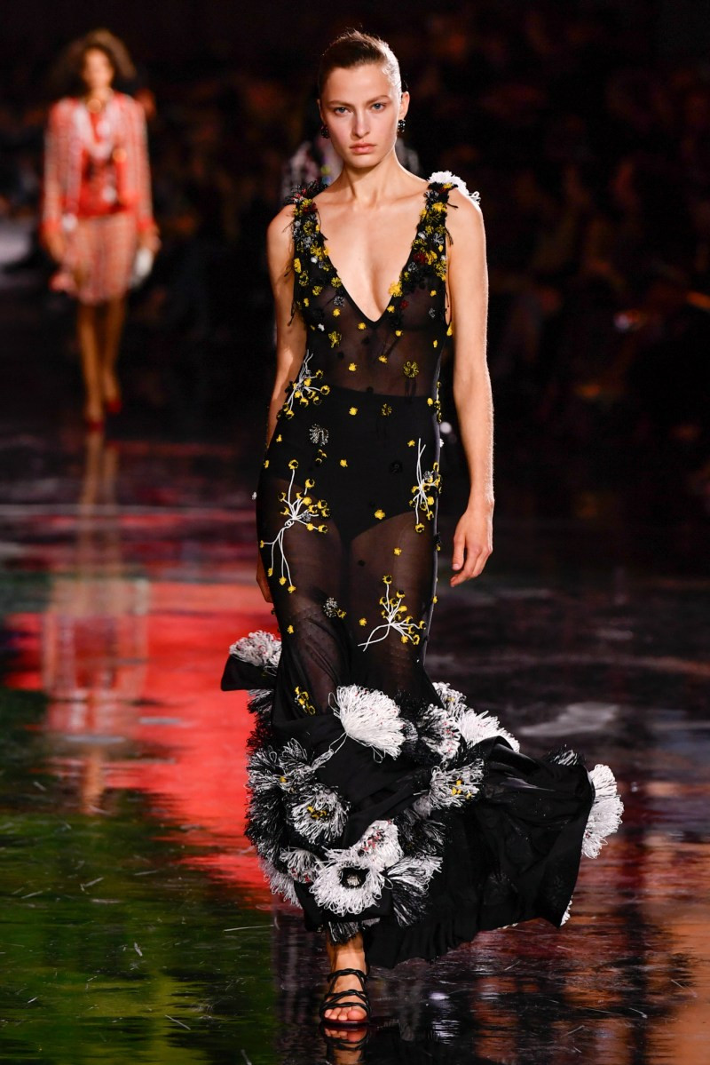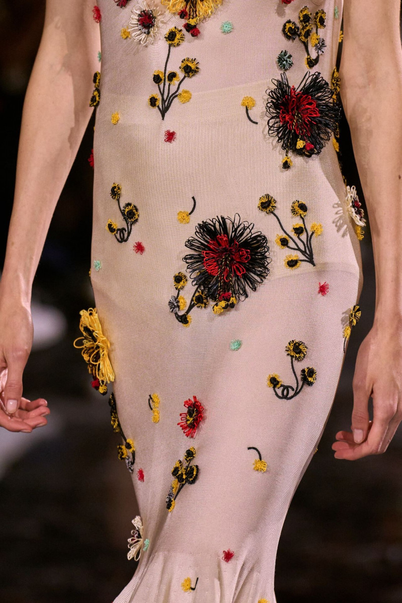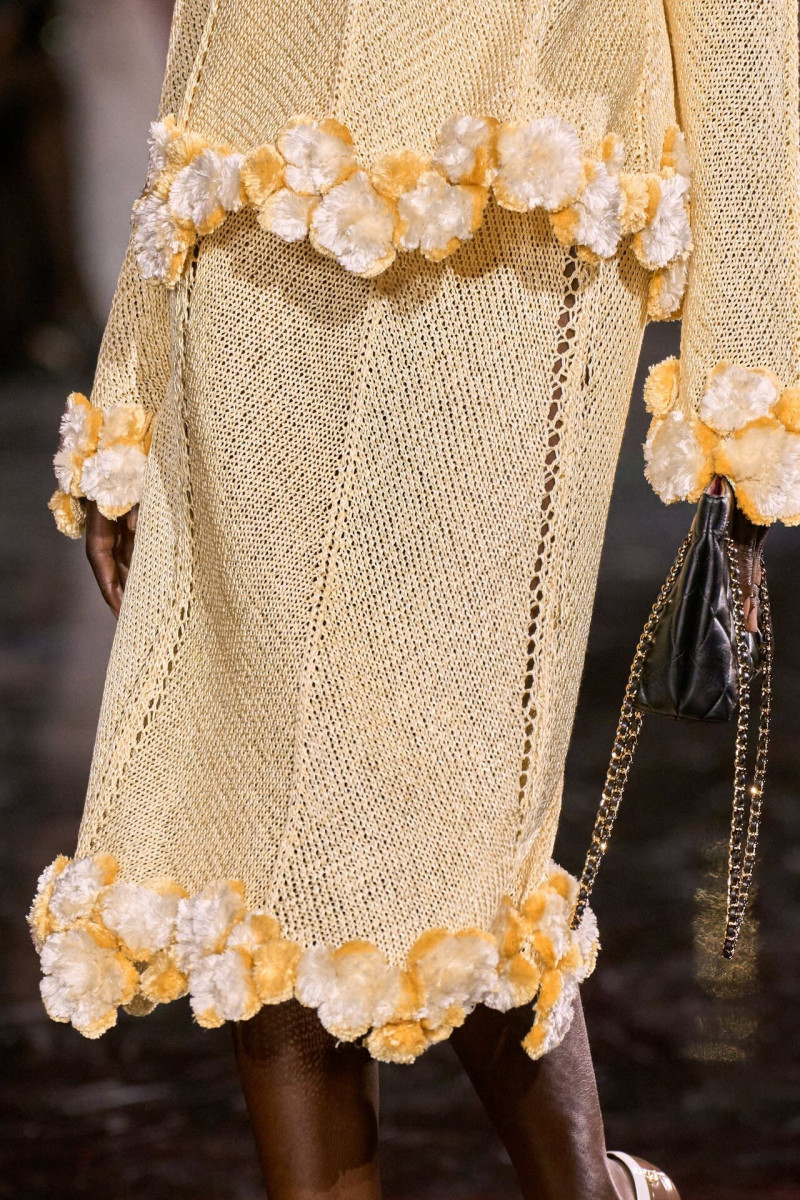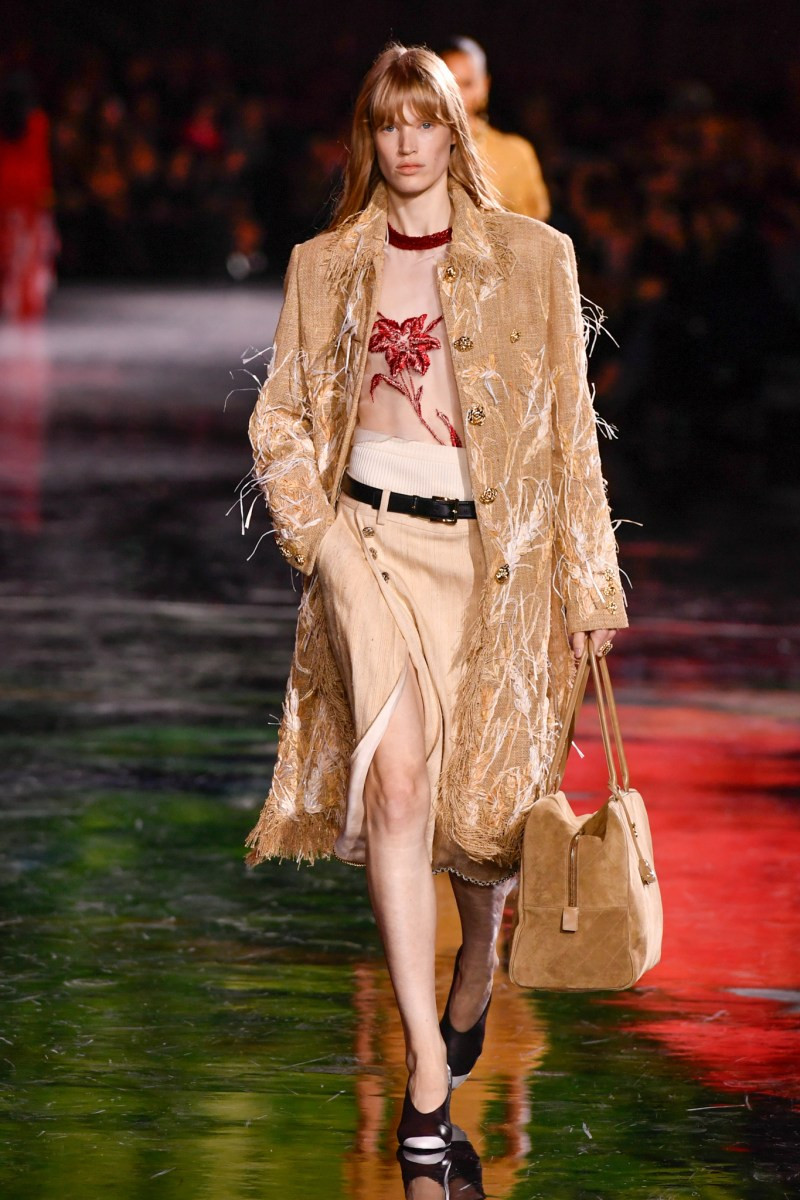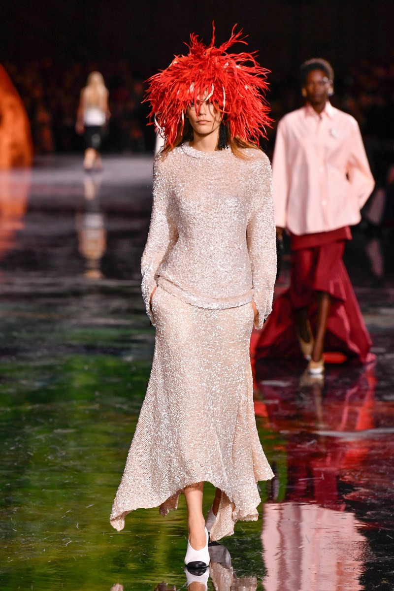 Помимо «очень Chanel» несколько образов на подиуме были «очень Блази». Дизайнеру позволили эту креативную вольность, как когда-то позволяли Карлу Лагерфельду. Мы увидели почерк дизайнера в образах с юбками-фламенко, головными уборами, похожими на «соломенные» парики, цветочных мотивах, выполненных из перьев.
