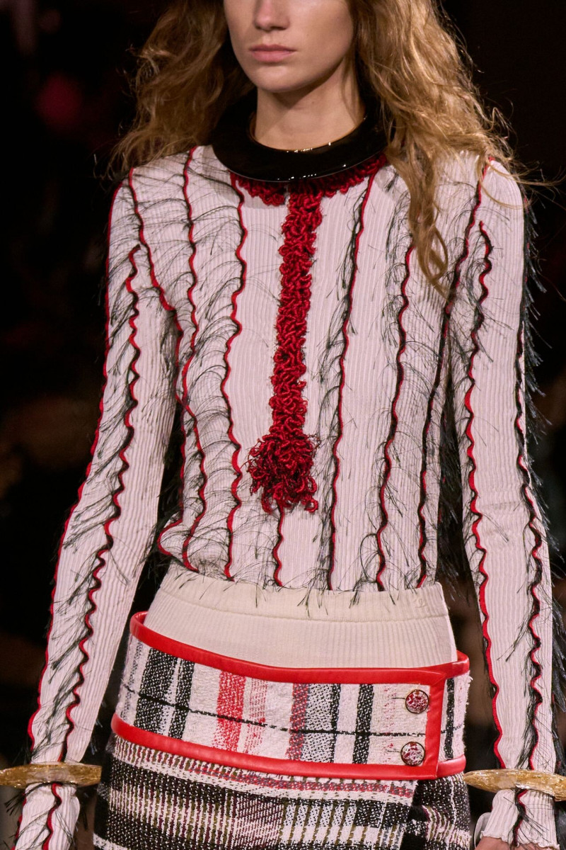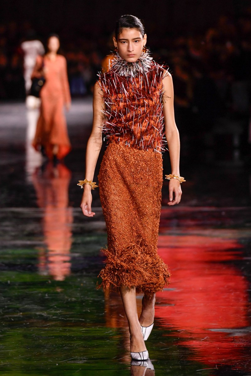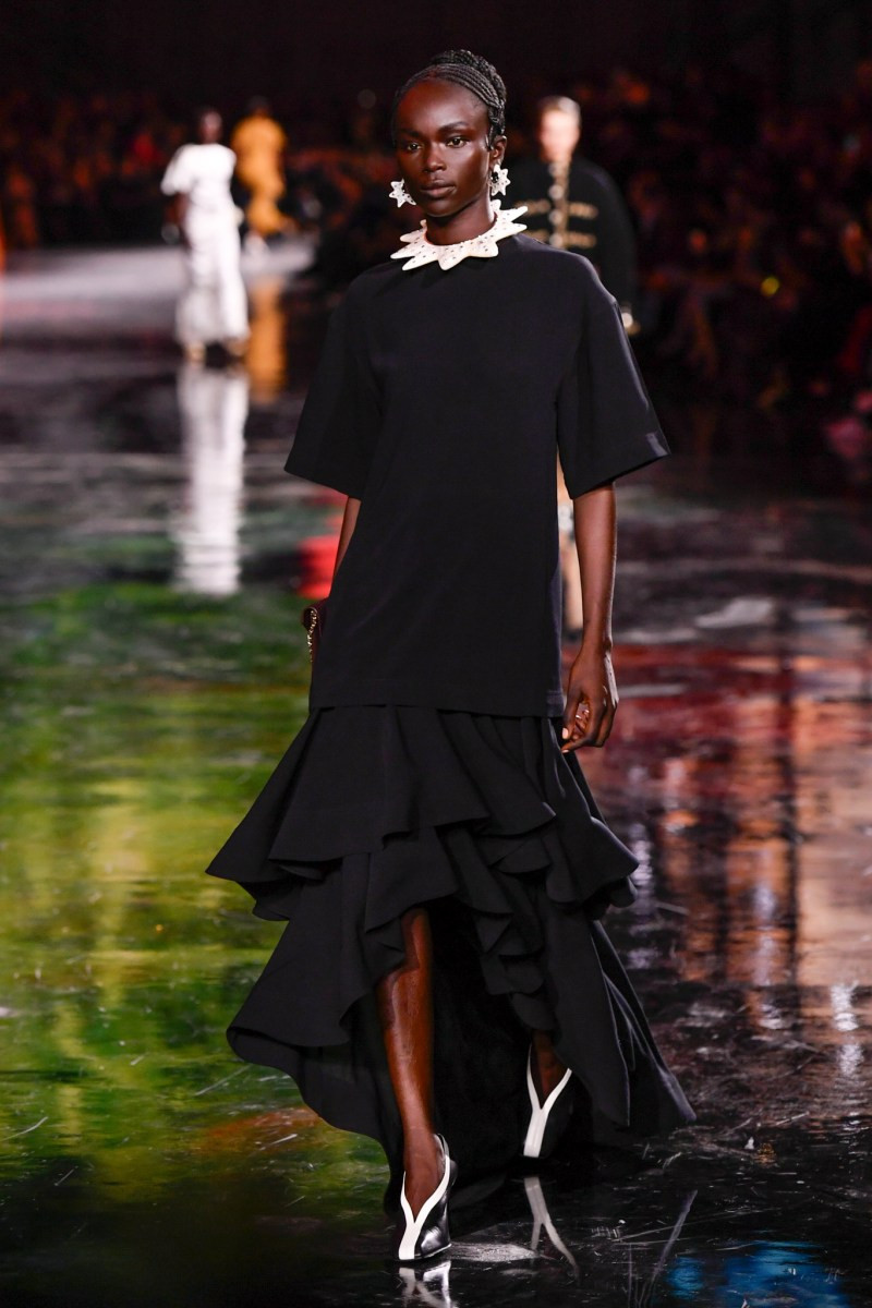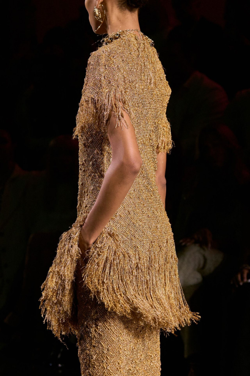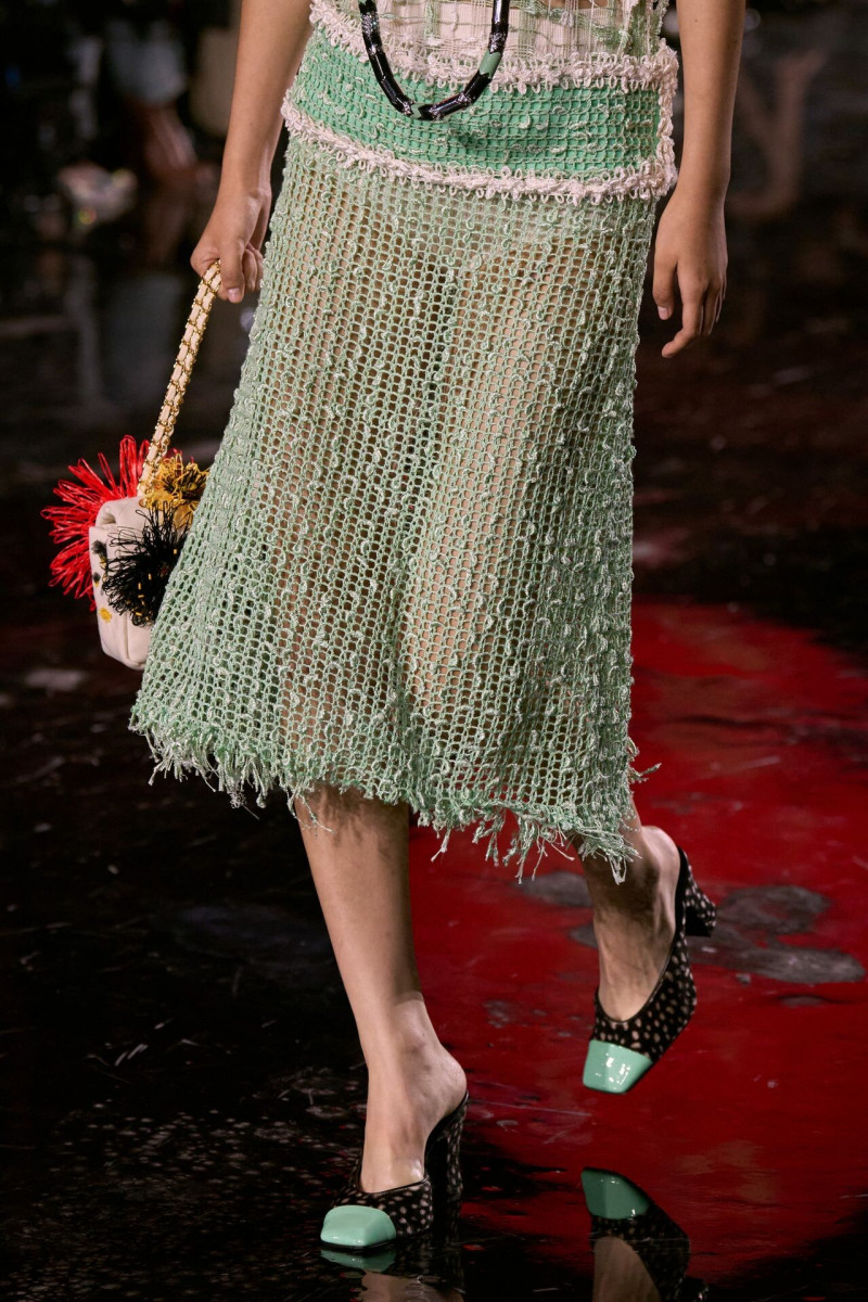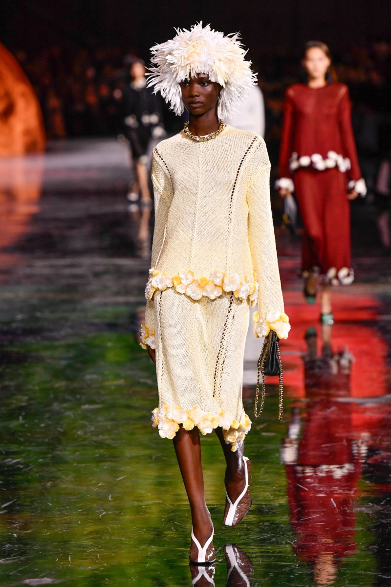 Помимо «очень Chanel» несколько образов на подиуме были «очень Блази». Дизайнеру позволили эту креативную вольность, как когда-то позволяли Карлу Лагерфельду. Мы увидели почерк дизайнера в образах с юбками-фламенко, головными уборами, похожими на «соломенные» парики, цветочных мотивах, выполненных из перьев.
