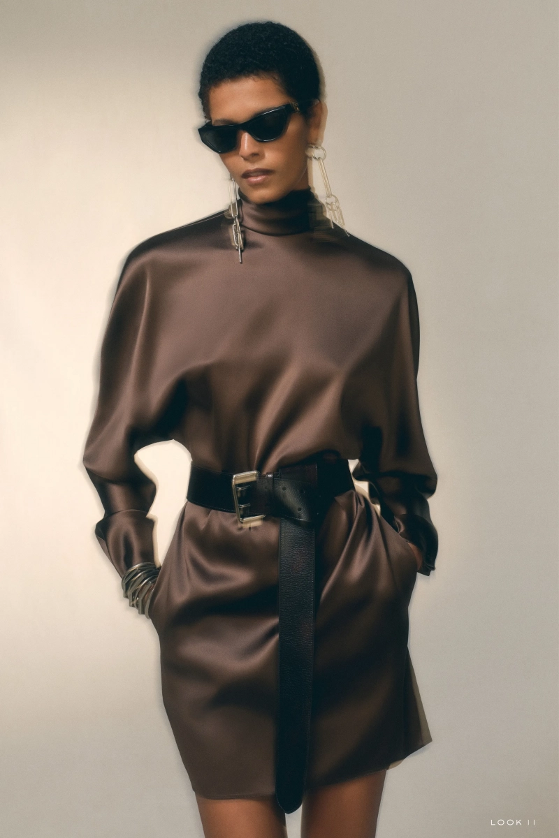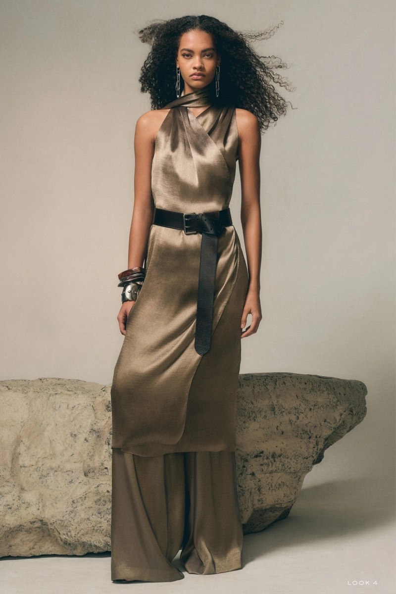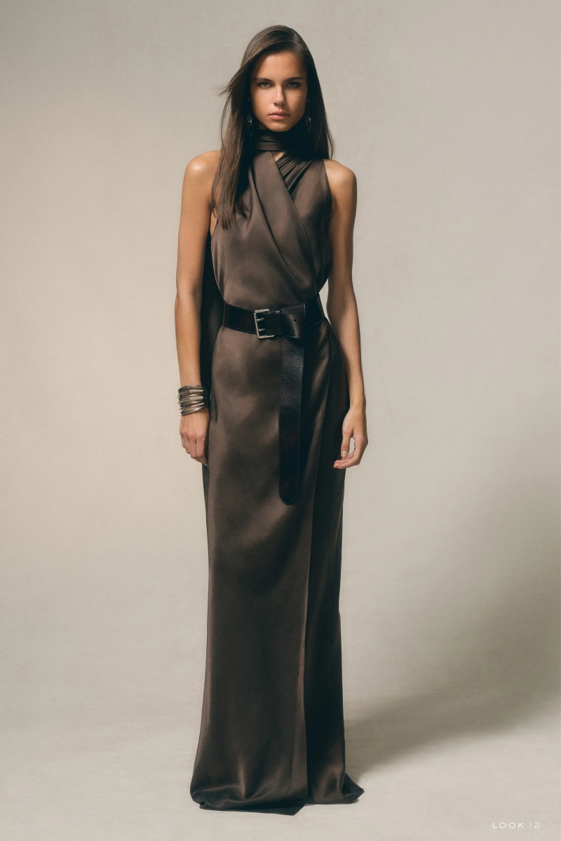 Текстура — это определяющий язык сезона. Кожаная юбка, оживлённая разноцветными бахромами, созданная после десятков часов ручной нарезки, задаёт тон коллекции, в которой ценятся терпение и точность. В другом месте открытая замшевая куртка, тщательно связаная на машинке и доведённая до мягкого блеска, демонстрирует способность Лорен превратить деревенские мотивы в изысканные решения. Платья и комплектные наряды далее исследуют поверхность и отделку: от безрукавного бронзового платья с драпировкой в стиле Фортуни до комплектов из рифлёного трикотажа, обработанных до глянцевого блеска и облегающих тело с контролируемой чувственностью.