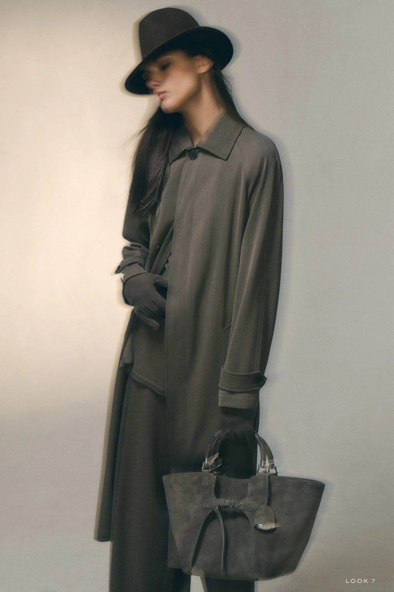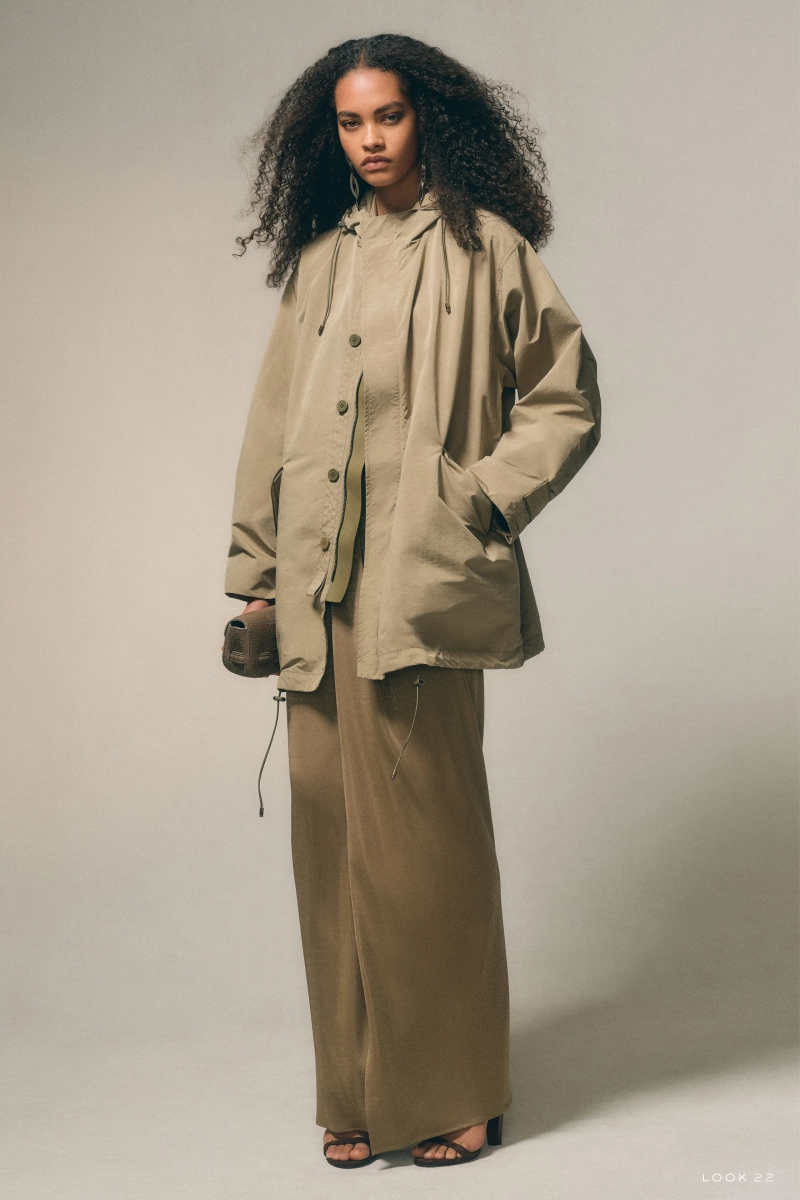 Двубортный твидовый жакет, созданный по образцу собственного дизайна модельера, выделяется в сочетании с брюками из хлопка свободного кроя, зауженными к щиколотке и фиксируемыми прочным ремнем. Образ отражает баланс между структурой и легкостью, традицией и личным выражением. Внешняя одежда продолжает эту концепцию, обогащенную ненавязчивыми техническими новшествами. Пальто-балмакааны из классических шерстяных тканей и куртки с молнией из ультратонкого шелка имеют подкладку из легких мембран, что делает их полностью водоотталкивающими, не ущемляя при этом их элегантность.