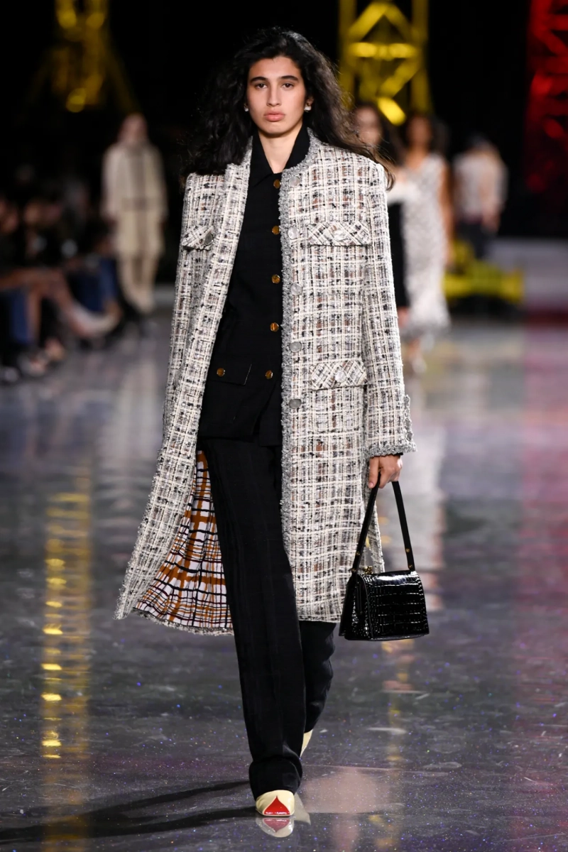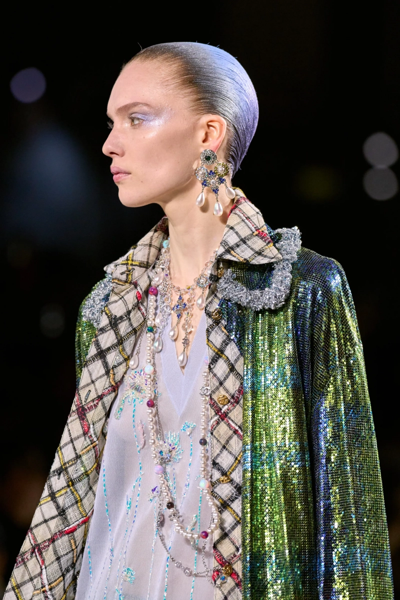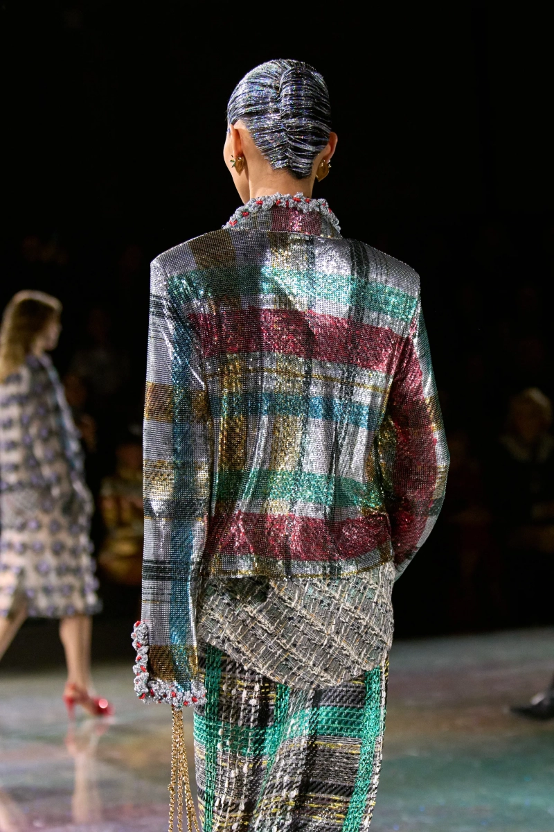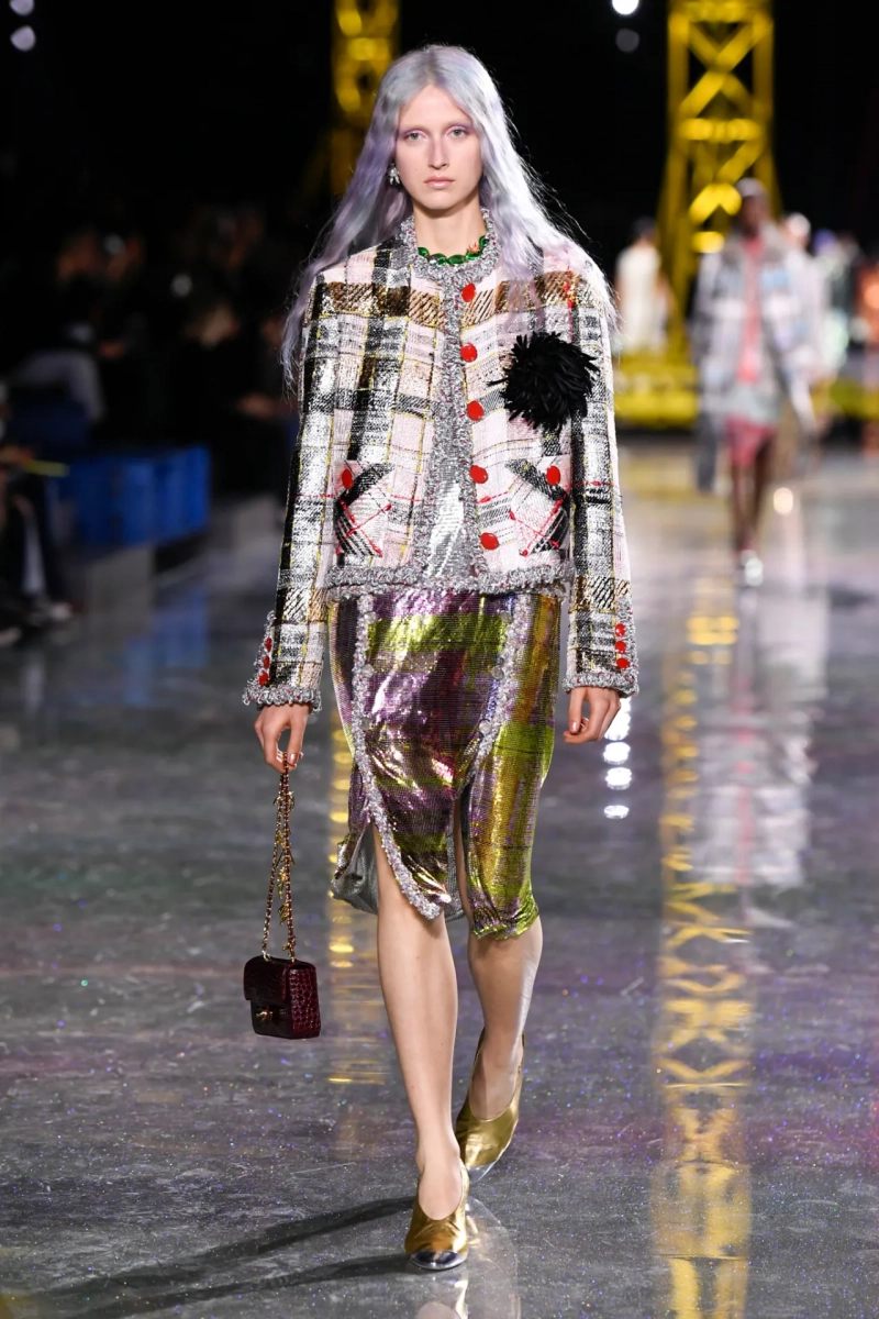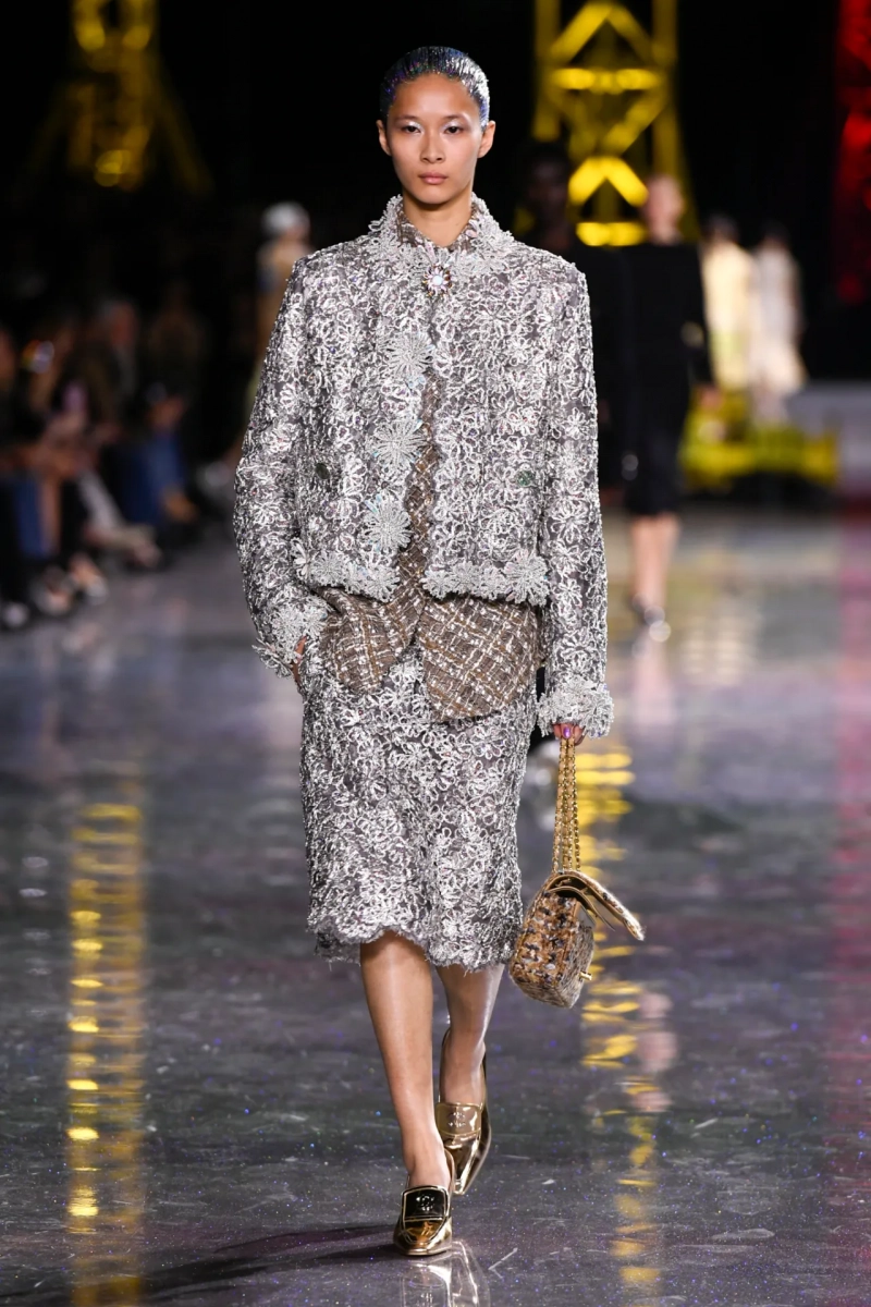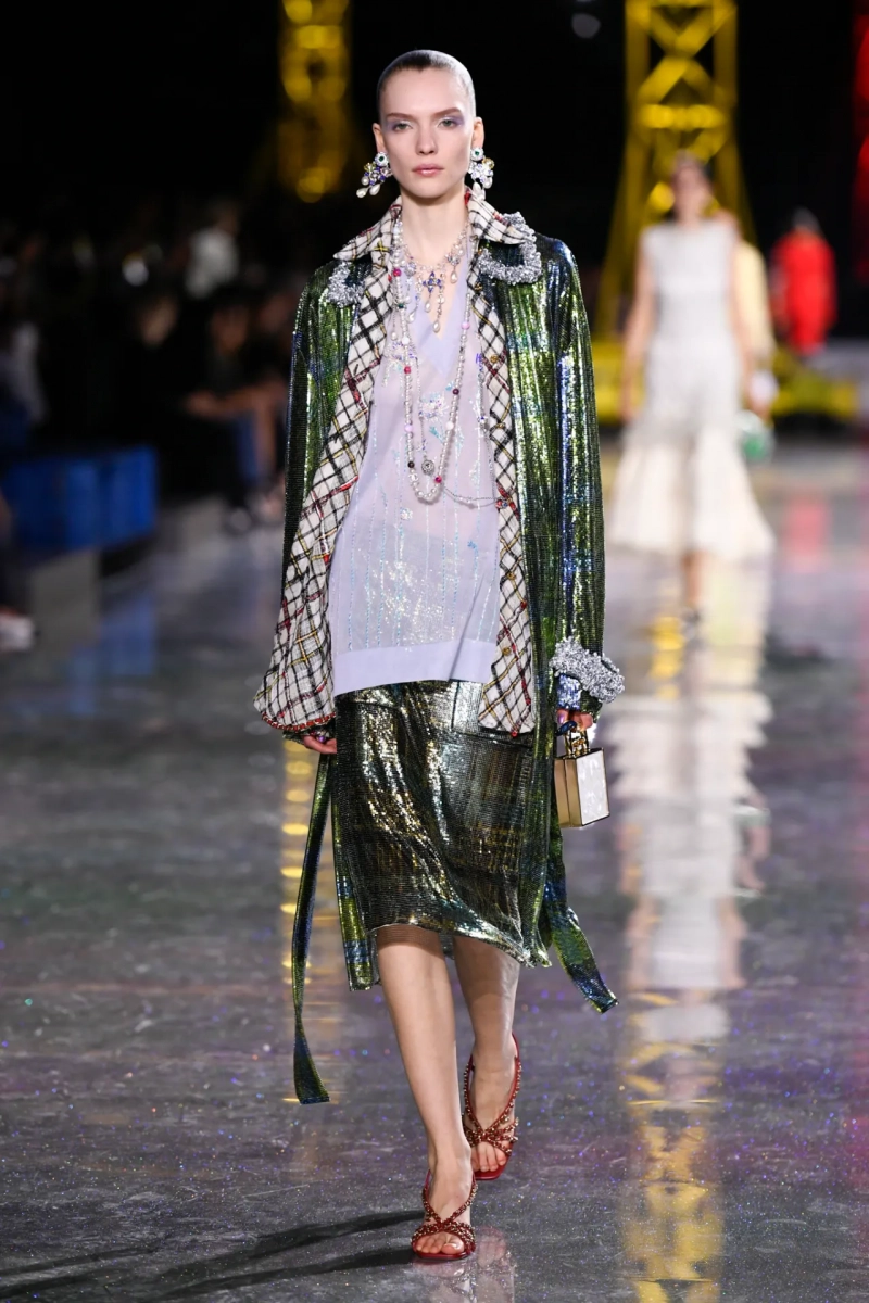 Постепенно показ переходит к более фантазийным вещам — переливающимся платьям из принтованной кольчуги, твиду trompe-l’oeil — ткани, которая лишь имитирует классический твид, — и материалам с металлическим блеском. Блази обращается к силуэту 1920-х с заниженной талией. В этом можно увидеть ответ на укороченные Bar-жакеты Джонатана Андерсона для Dior — только здесь пропорция движется в противоположную сторону, вытягивая силуэт вниз.