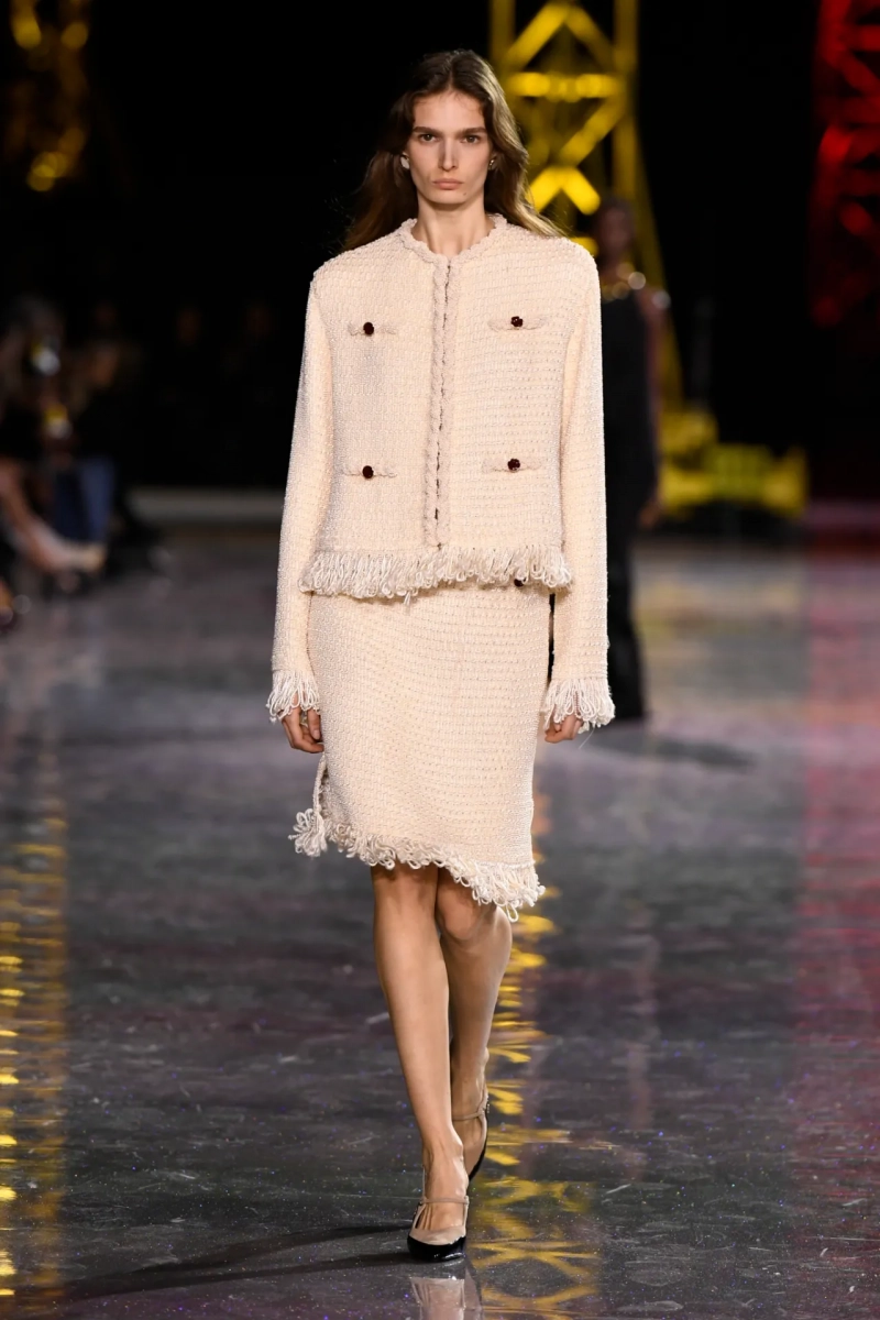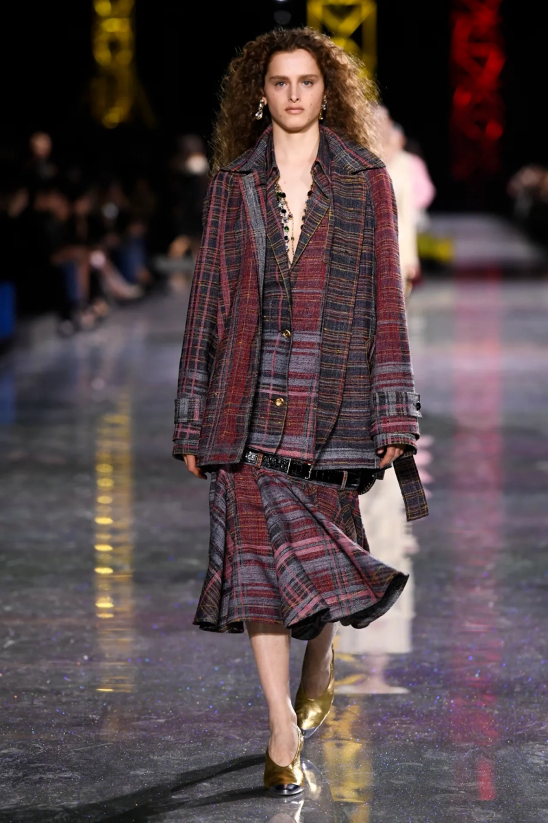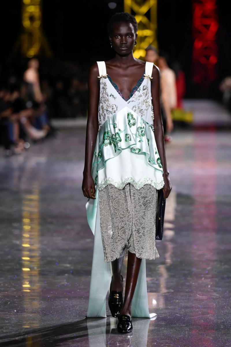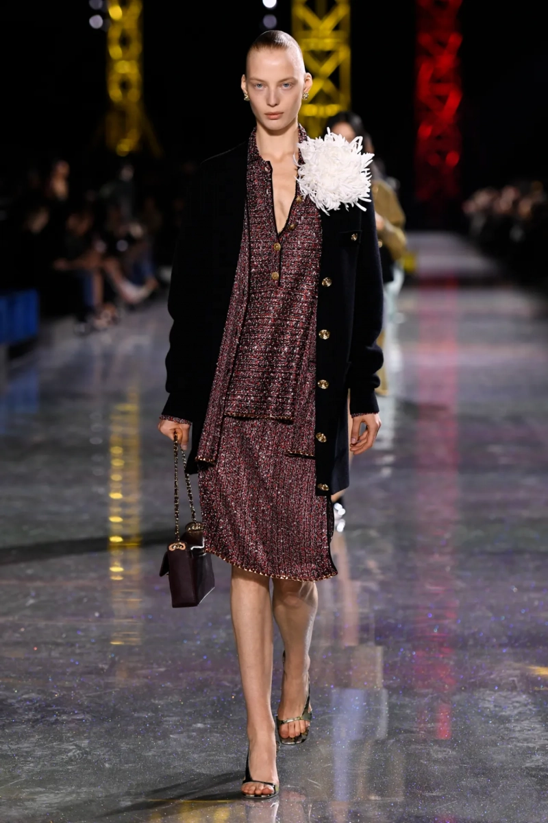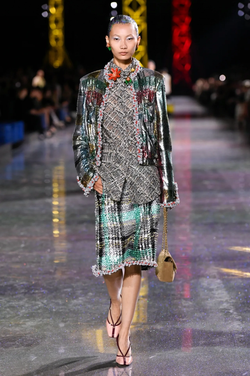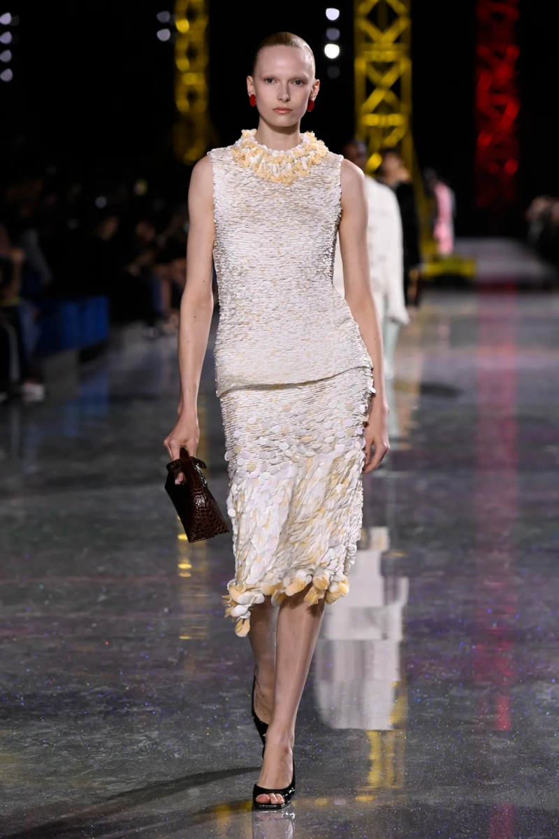 Постепенно показ переходит к более фантазийным вещам — переливающимся платьям из принтованной кольчуги, твиду trompe-l’oeil — ткани, которая лишь имитирует классический твид, — и материалам с металлическим блеском. Блази обращается к силуэту 1920-х с заниженной талией. В этом можно увидеть ответ на укороченные Bar-жакеты Джонатана Андерсона для Dior — только здесь пропорция движется в противоположную сторону, вытягивая силуэт вниз.