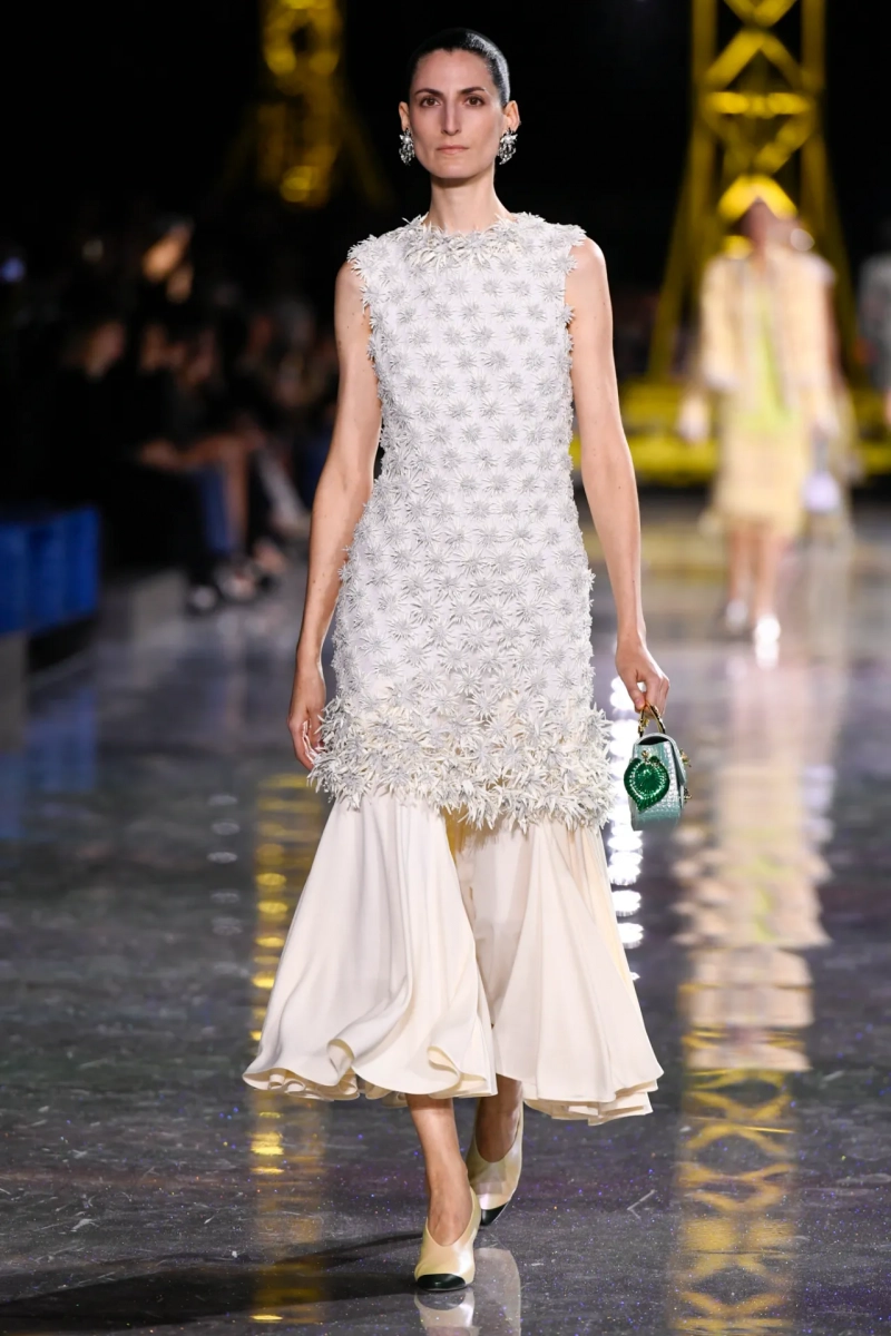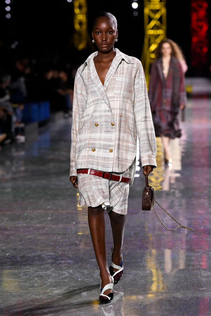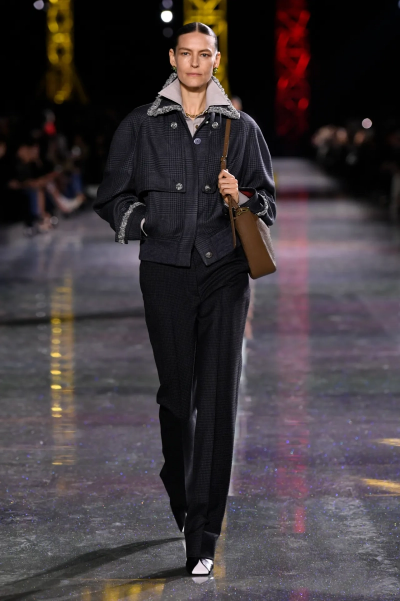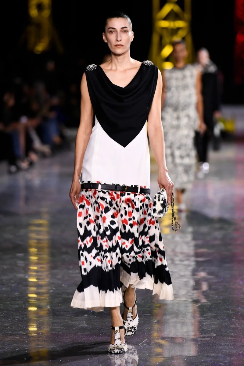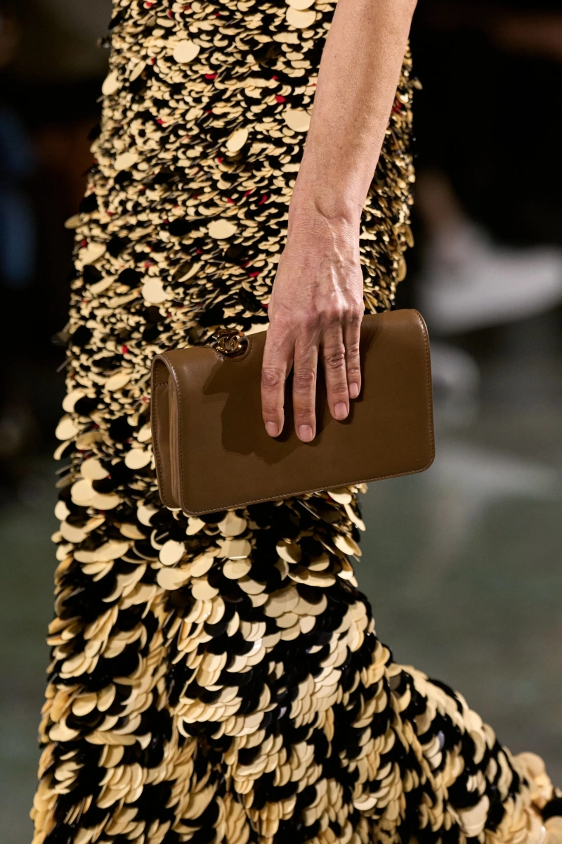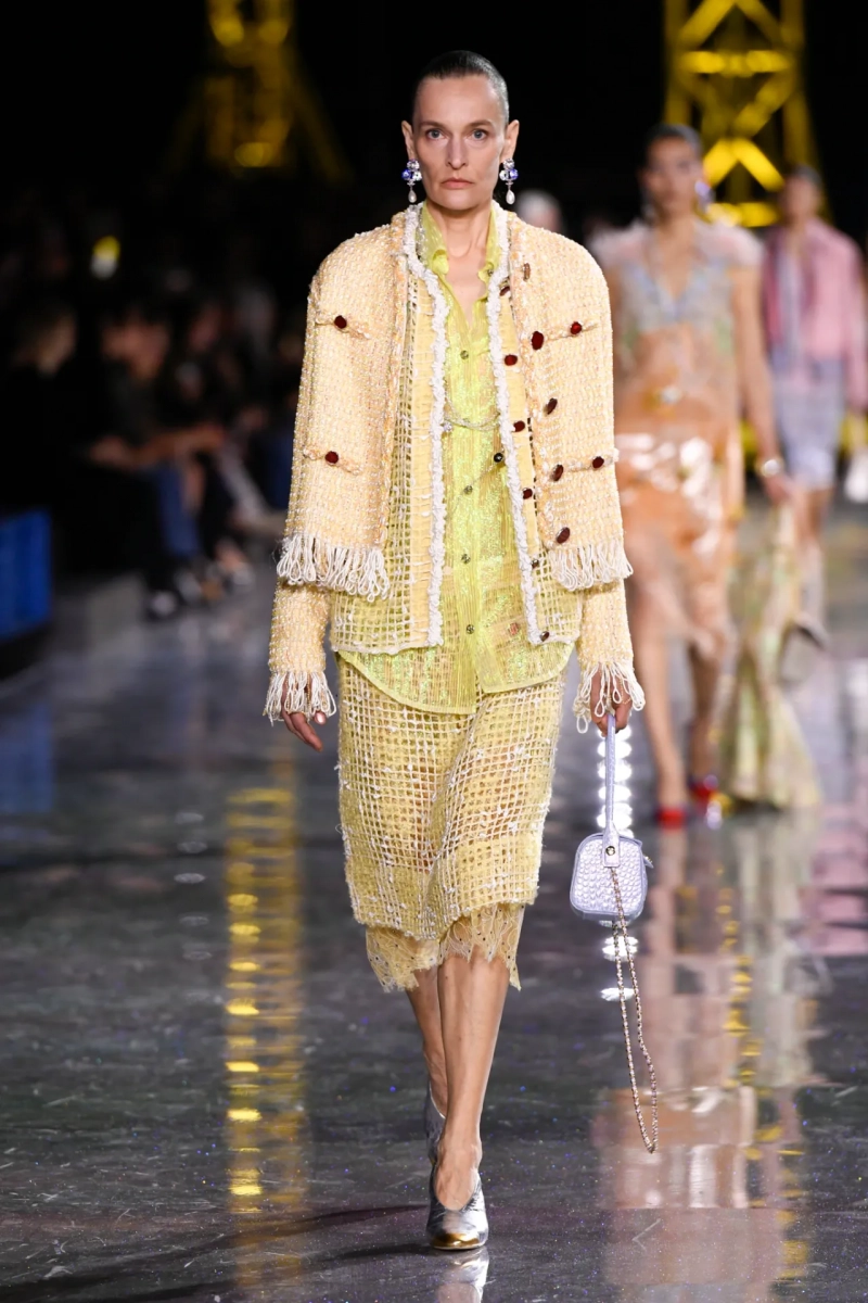 Постепенно показ переходит к более фантазийным вещам — переливающимся платьям из принтованной кольчуги, твиду trompe-l’oeil — ткани, которая лишь имитирует классический твид, — и материалам с металлическим блеском. Блази обращается к силуэту 1920-х с заниженной талией. В этом можно увидеть ответ на укороченные Bar-жакеты Джонатана Андерсона для Dior — только здесь пропорция движется в противоположную сторону, вытягивая силуэт вниз.