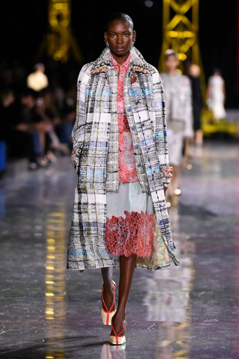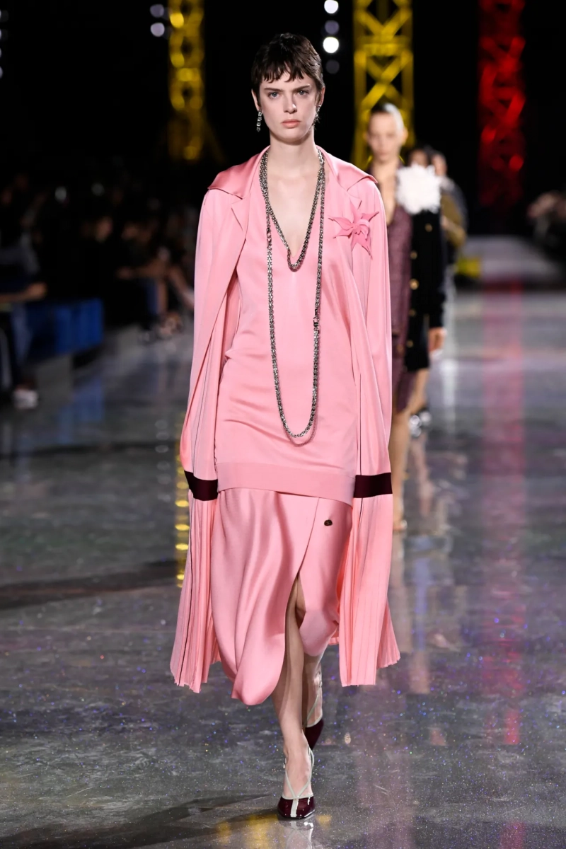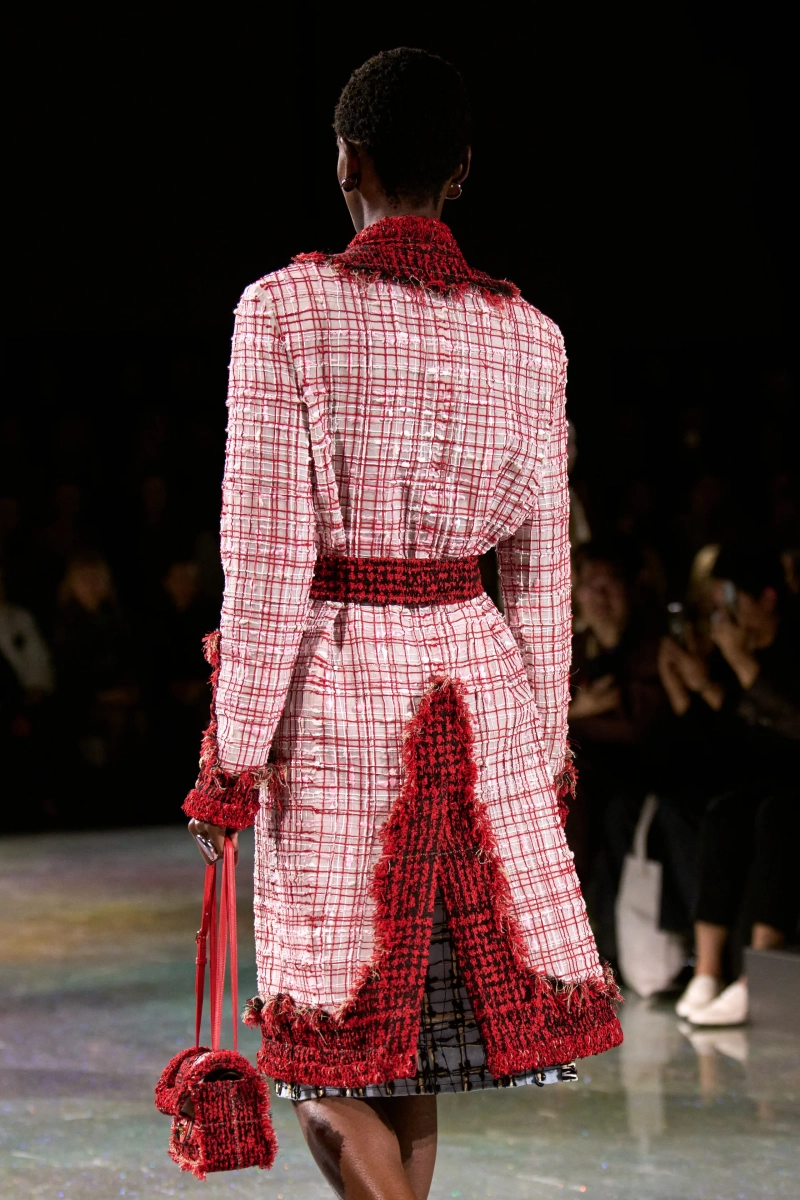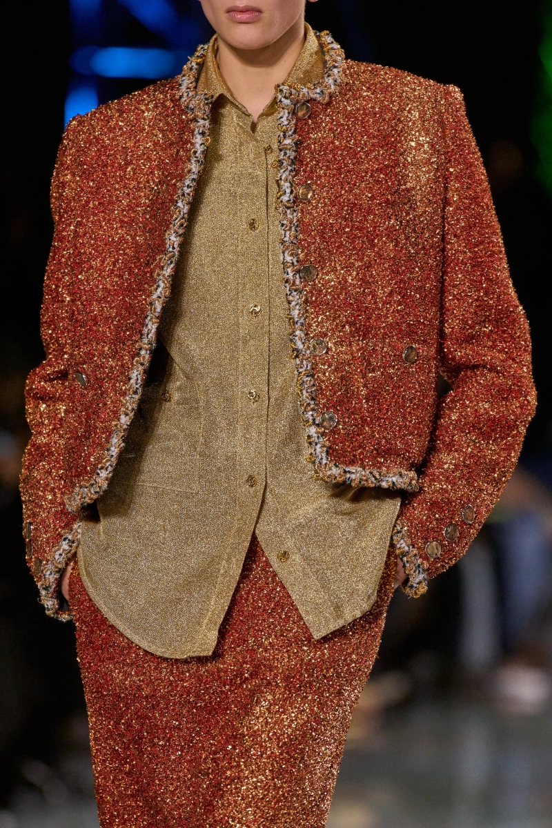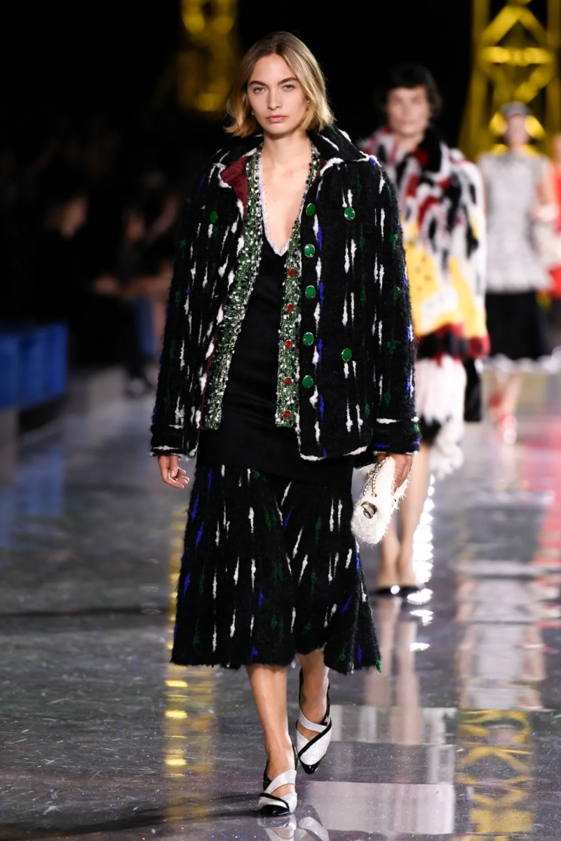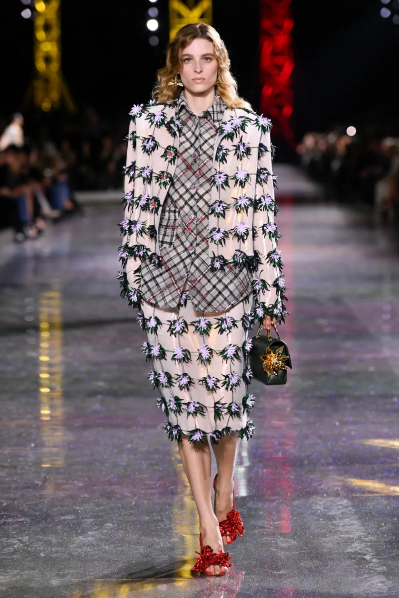 Постепенно показ переходит к более фантазийным вещам — переливающимся платьям из принтованной кольчуги, твиду trompe-l’oeil — ткани, которая лишь имитирует классический твид, — и материалам с металлическим блеском. Блази обращается к силуэту 1920-х с заниженной талией. В этом можно увидеть ответ на укороченные Bar-жакеты Джонатана Андерсона для Dior — только здесь пропорция движется в противоположную сторону, вытягивая силуэт вниз.