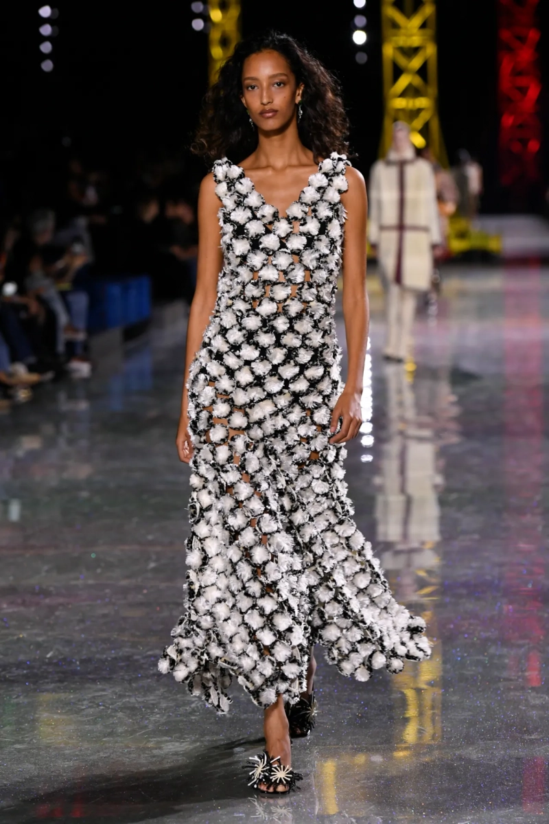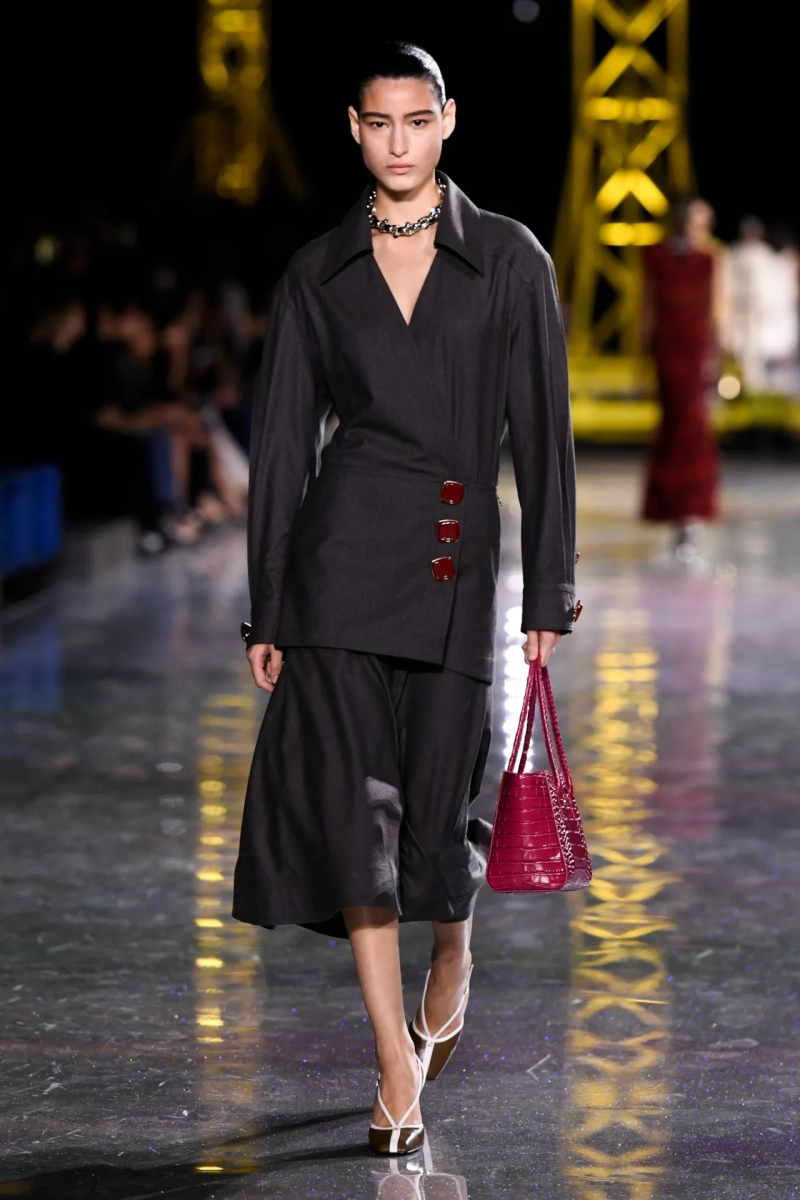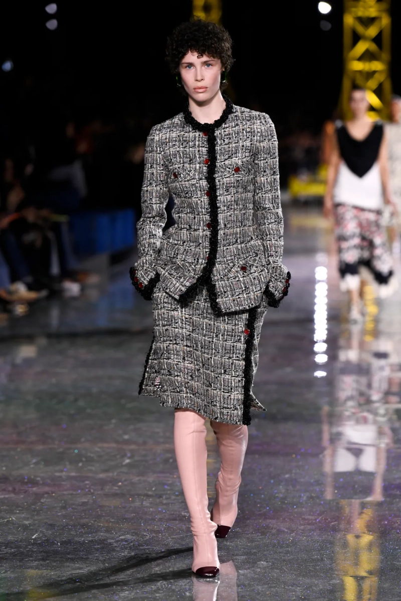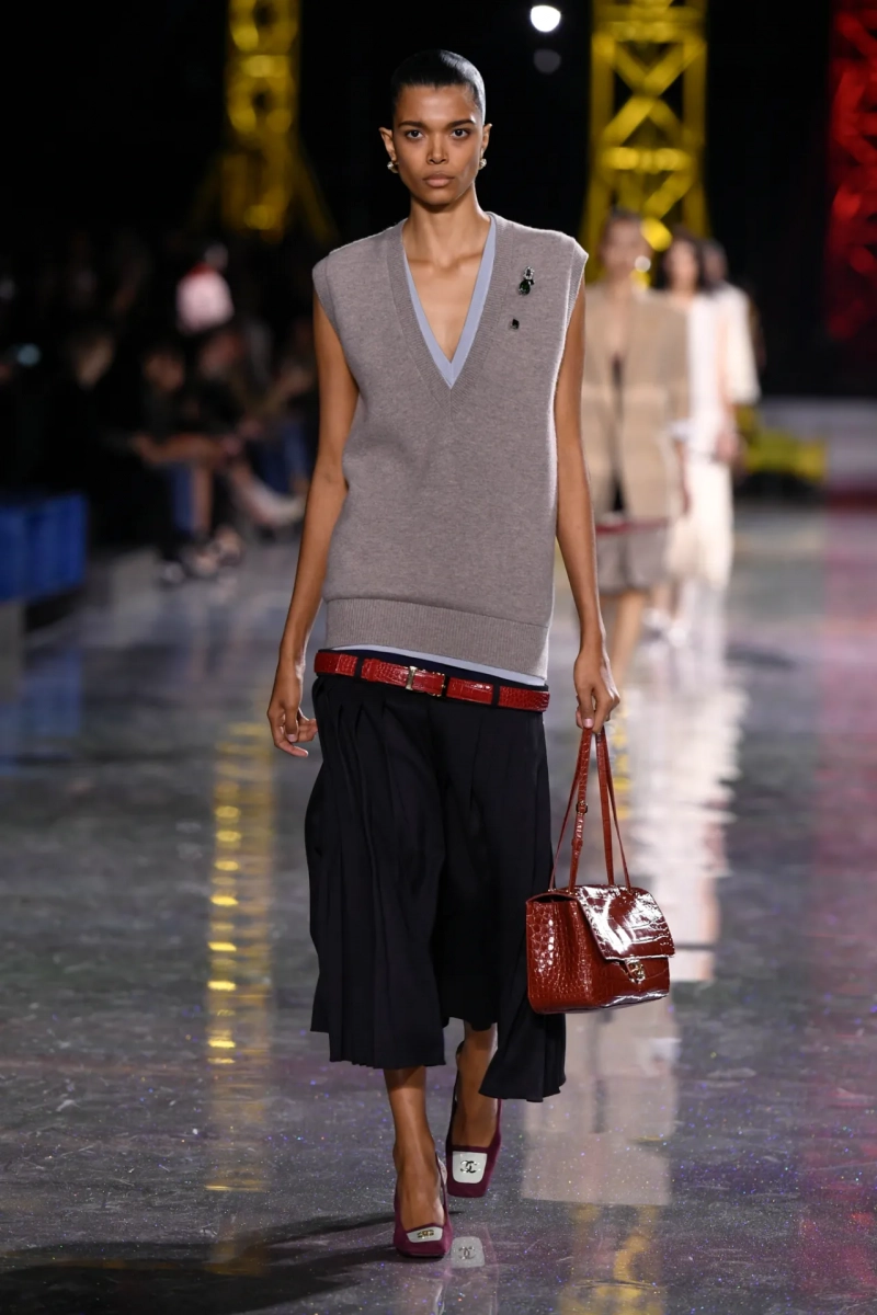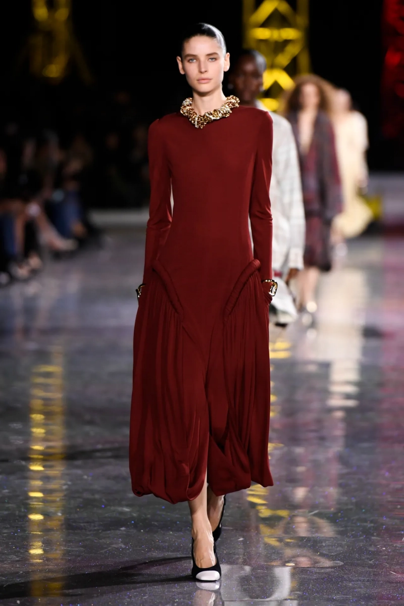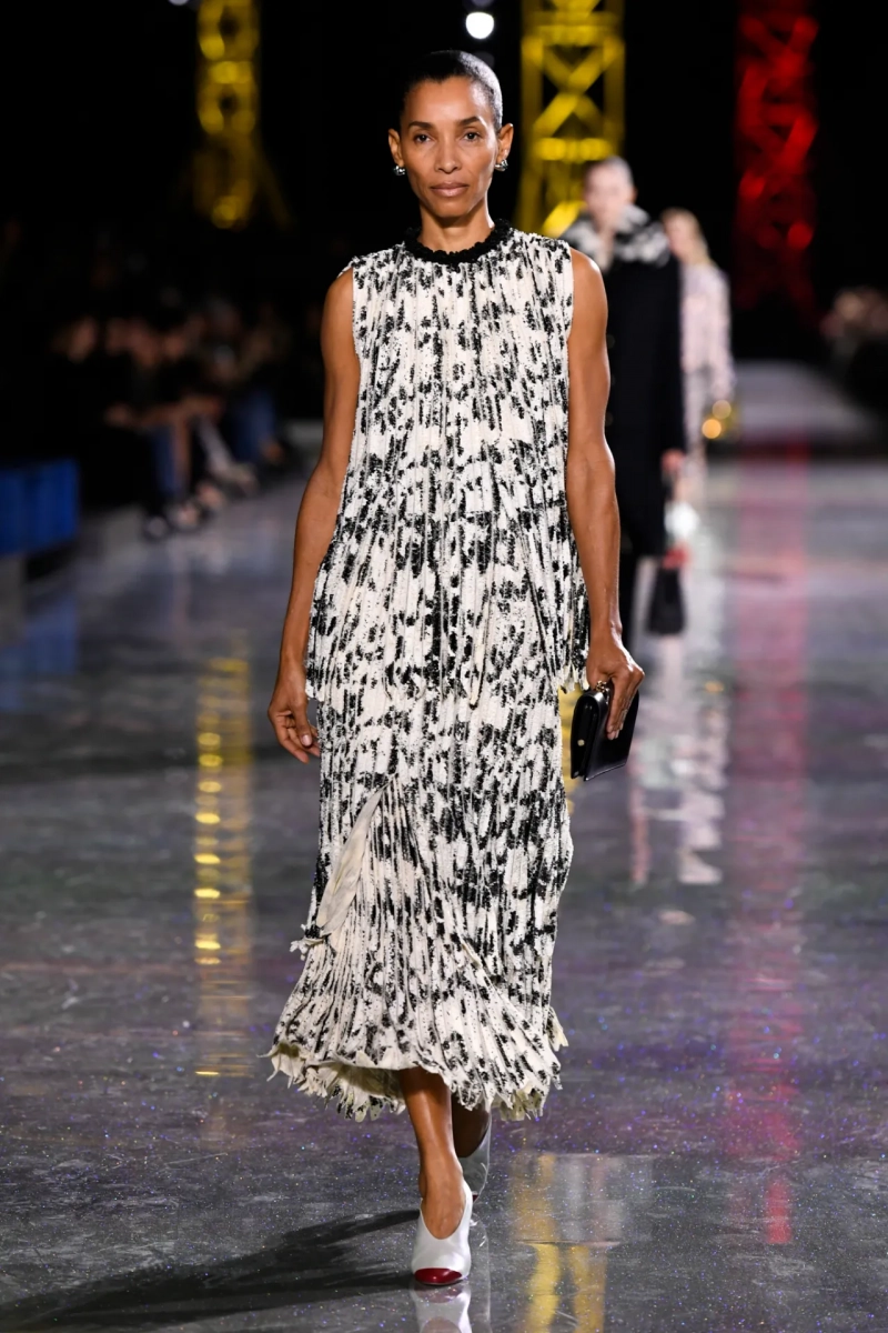 Постепенно показ переходит к более фантазийным вещам — переливающимся платьям из принтованной кольчуги, твиду trompe-l’oeil — ткани, которая лишь имитирует классический твид, — и материалам с металлическим блеском. Блази обращается к силуэту 1920-х с заниженной талией. В этом можно увидеть ответ на укороченные Bar-жакеты Джонатана Андерсона для Dior — только здесь пропорция движется в противоположную сторону, вытягивая силуэт вниз.
