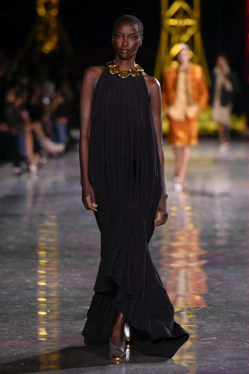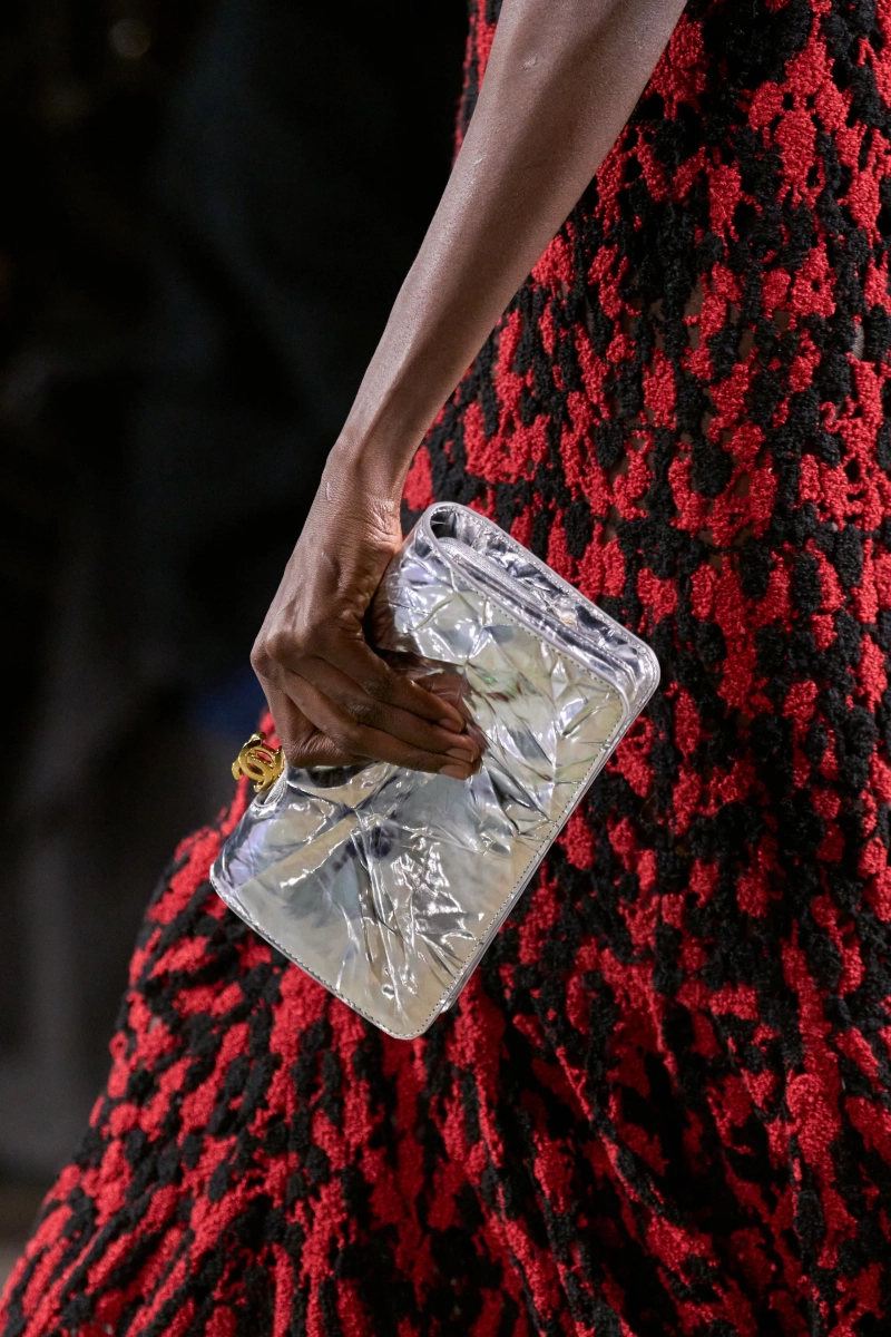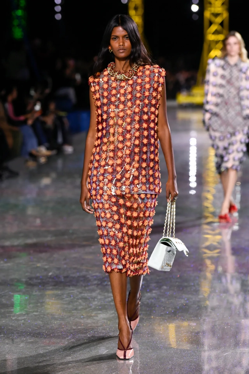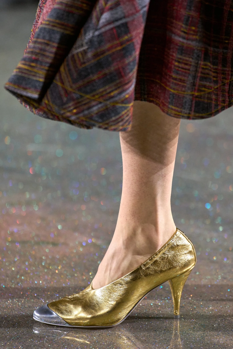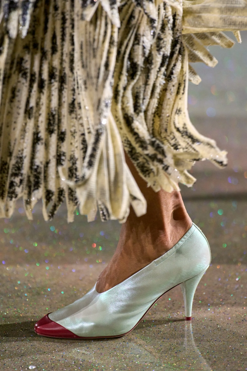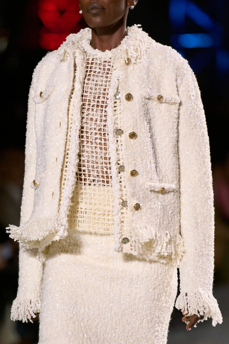 Постепенно показ переходит к более фантазийным вещам — переливающимся платьям из принтованной кольчуги, твиду trompe-l’oeil — ткани, которая лишь имитирует классический твид, — и материалам с металлическим блеском. Блази обращается к силуэту 1920-х с заниженной талией. В этом можно увидеть ответ на укороченные Bar-жакеты Джонатана Андерсона для Dior — только здесь пропорция движется в противоположную сторону, вытягивая силуэт вниз.