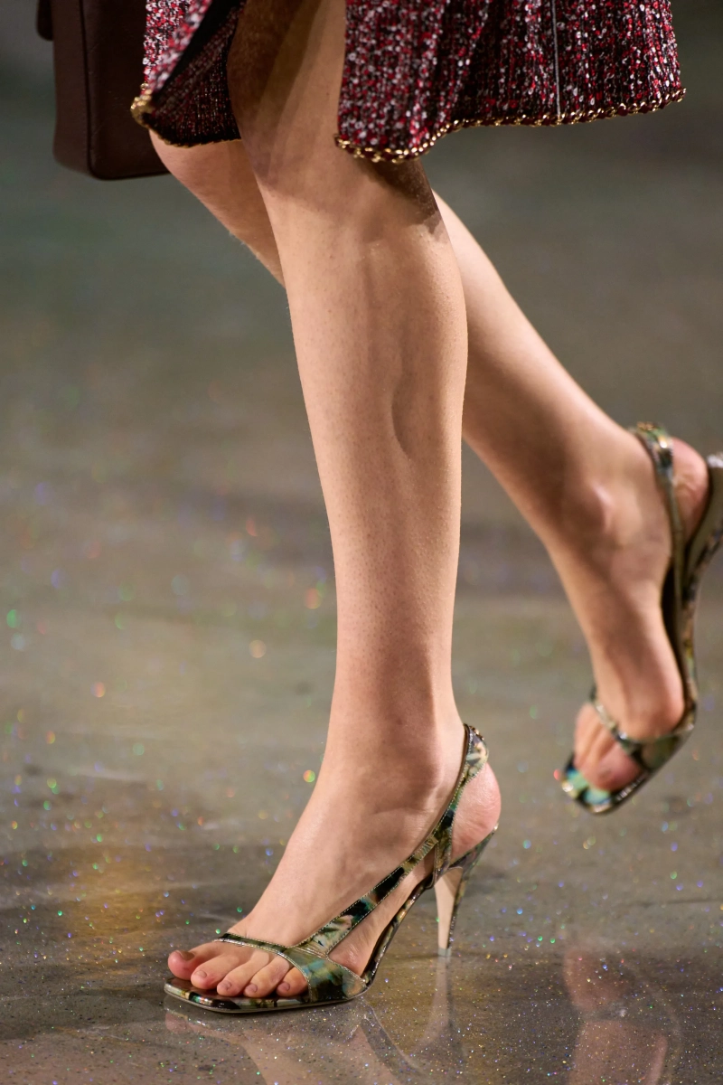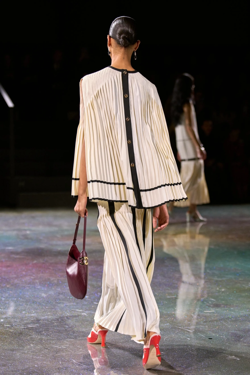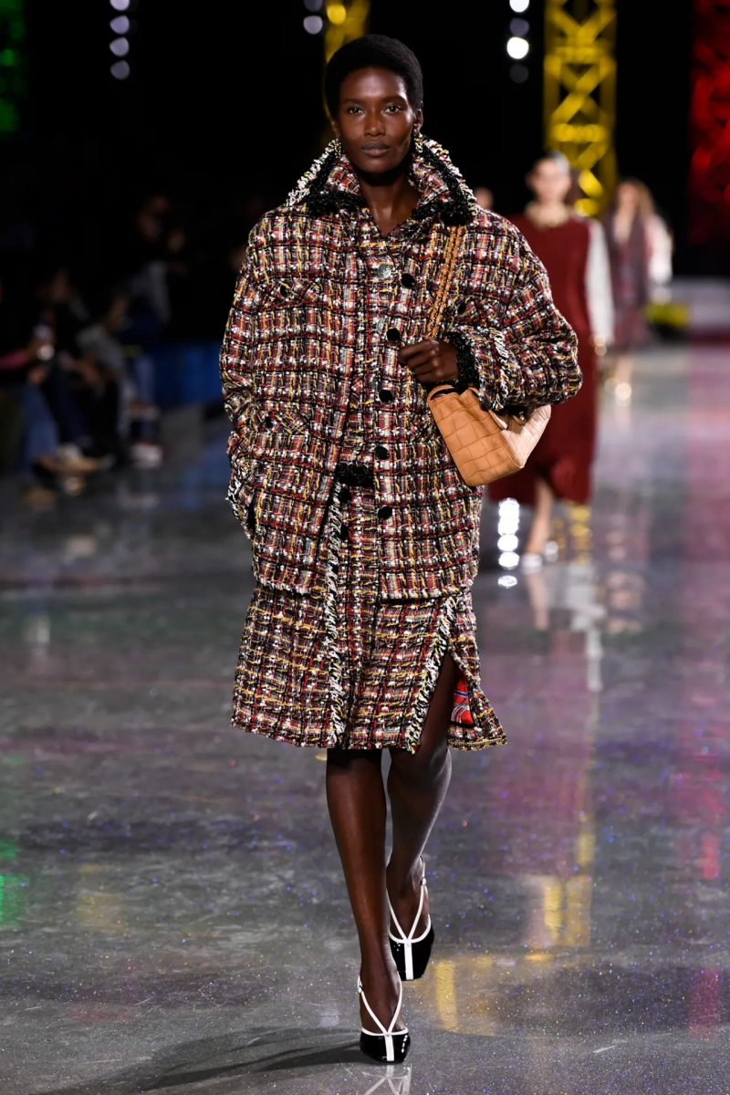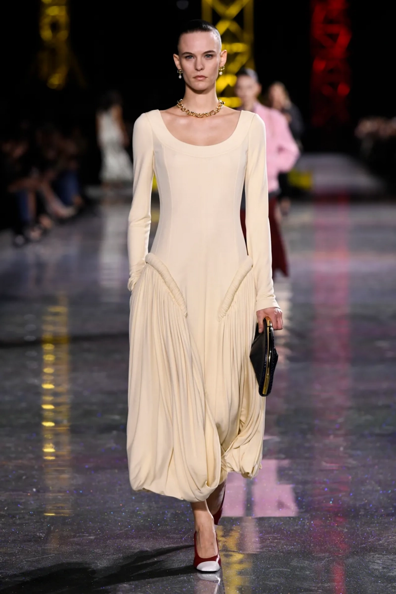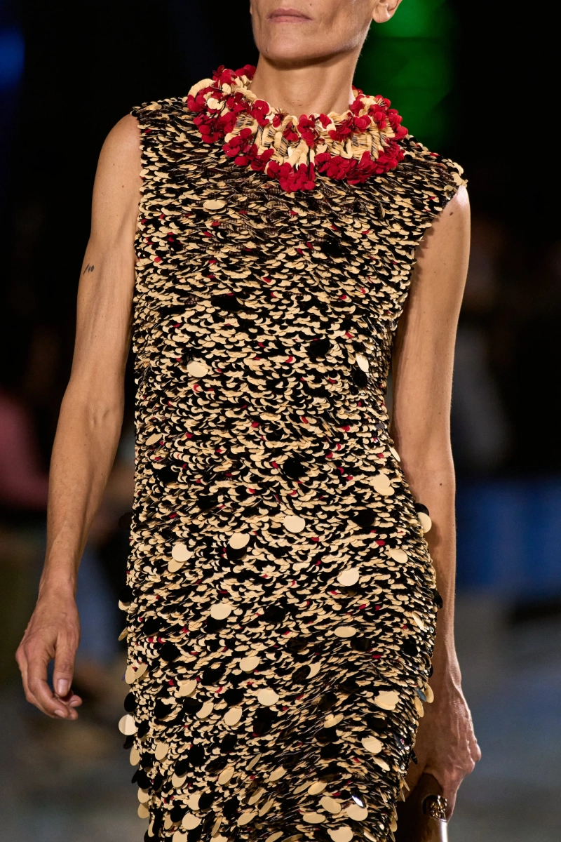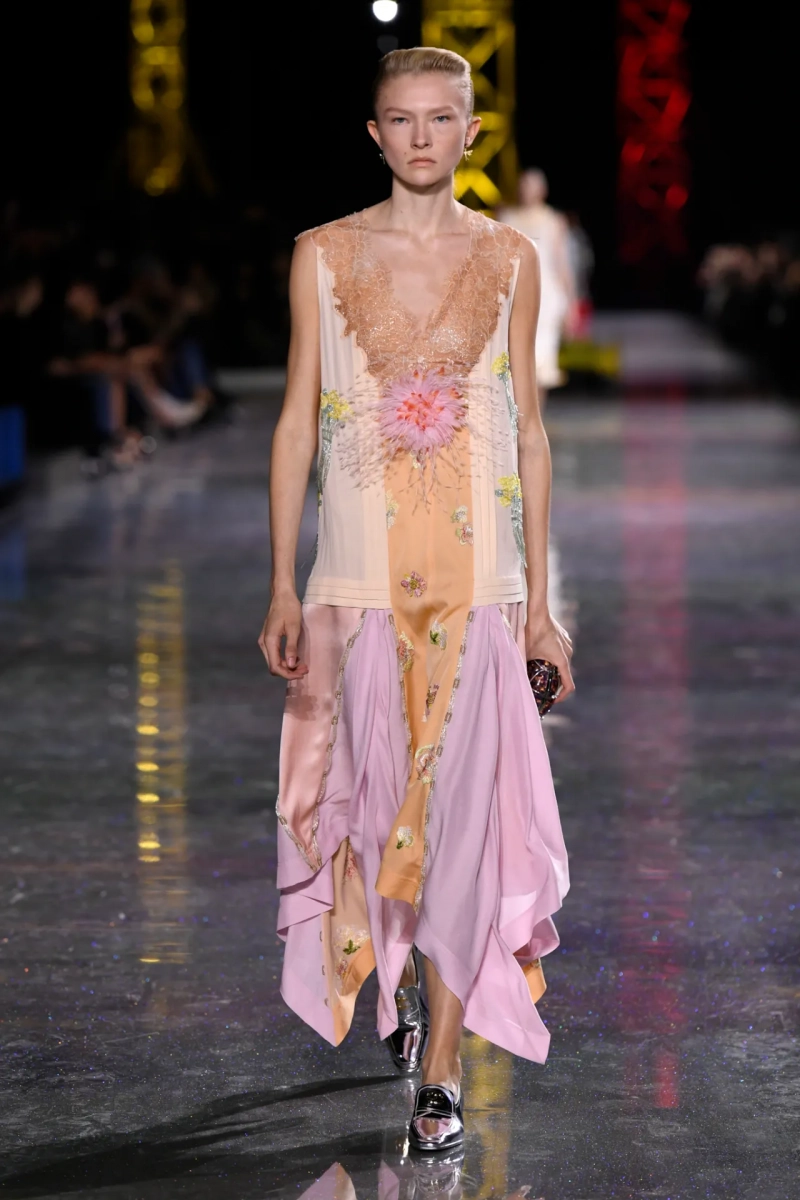 Постепенно показ переходит к более фантазийным вещам — переливающимся платьям из принтованной кольчуги, твиду trompe-l’oeil — ткани, которая лишь имитирует классический твид, — и материалам с металлическим блеском. Блази обращается к силуэту 1920-х с заниженной талией. В этом можно увидеть ответ на укороченные Bar-жакеты Джонатана Андерсона для Dior — только здесь пропорция движется в противоположную сторону, вытягивая силуэт вниз.