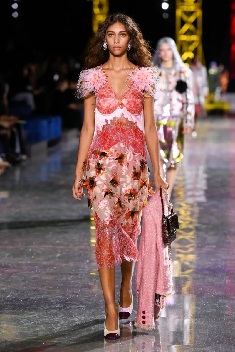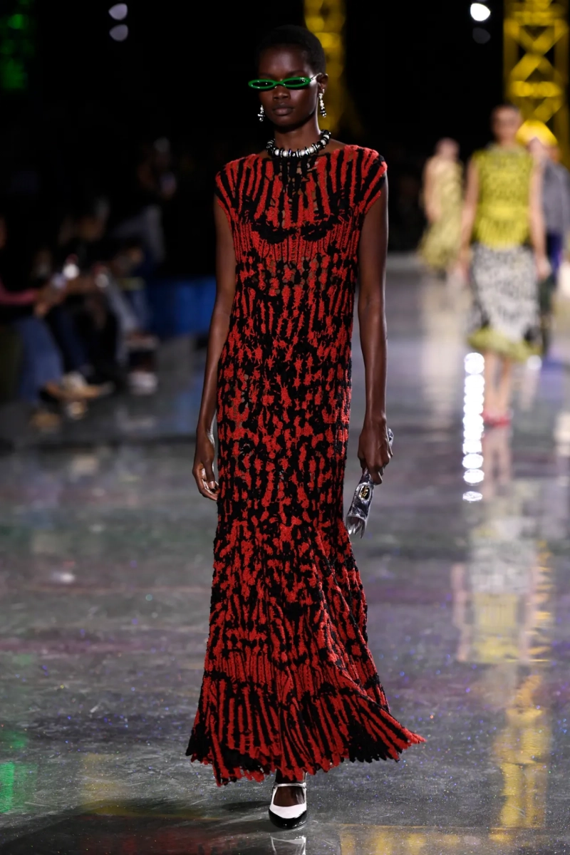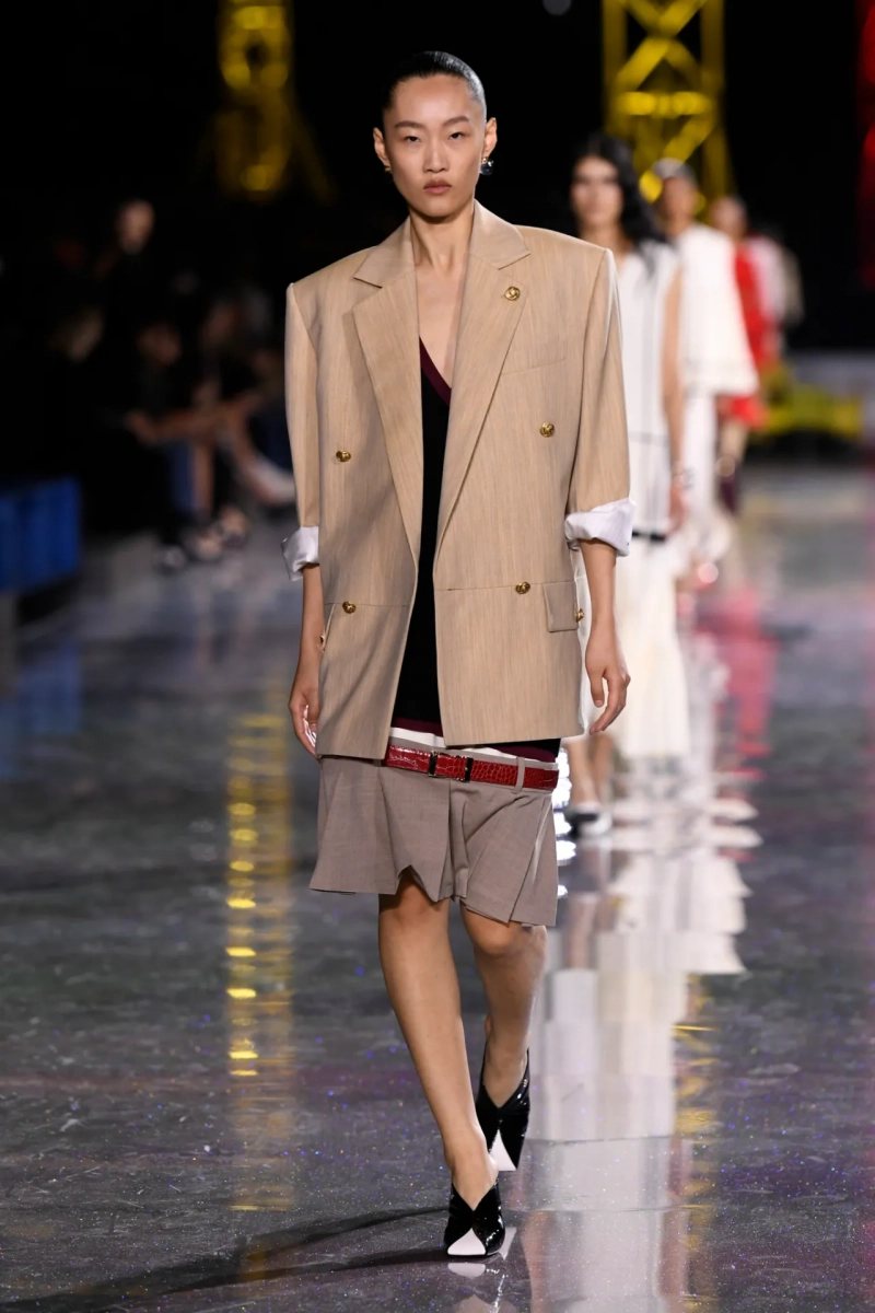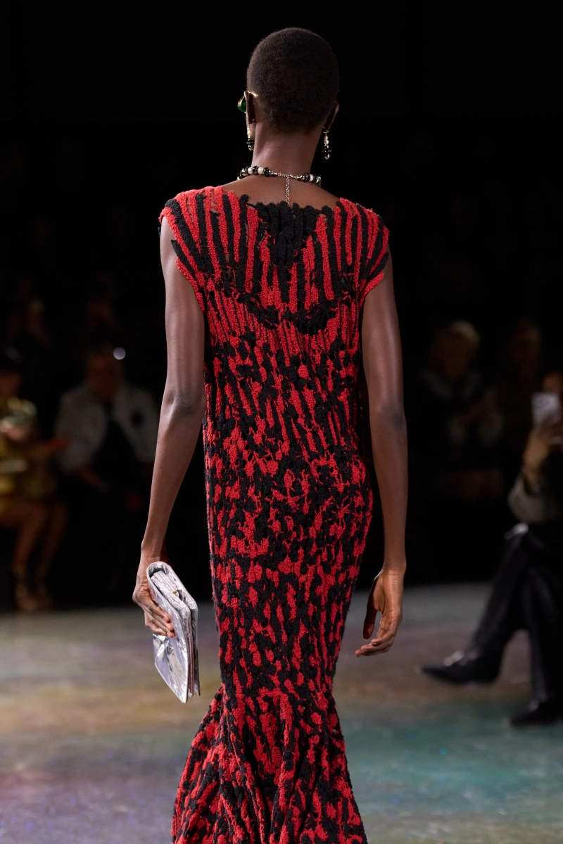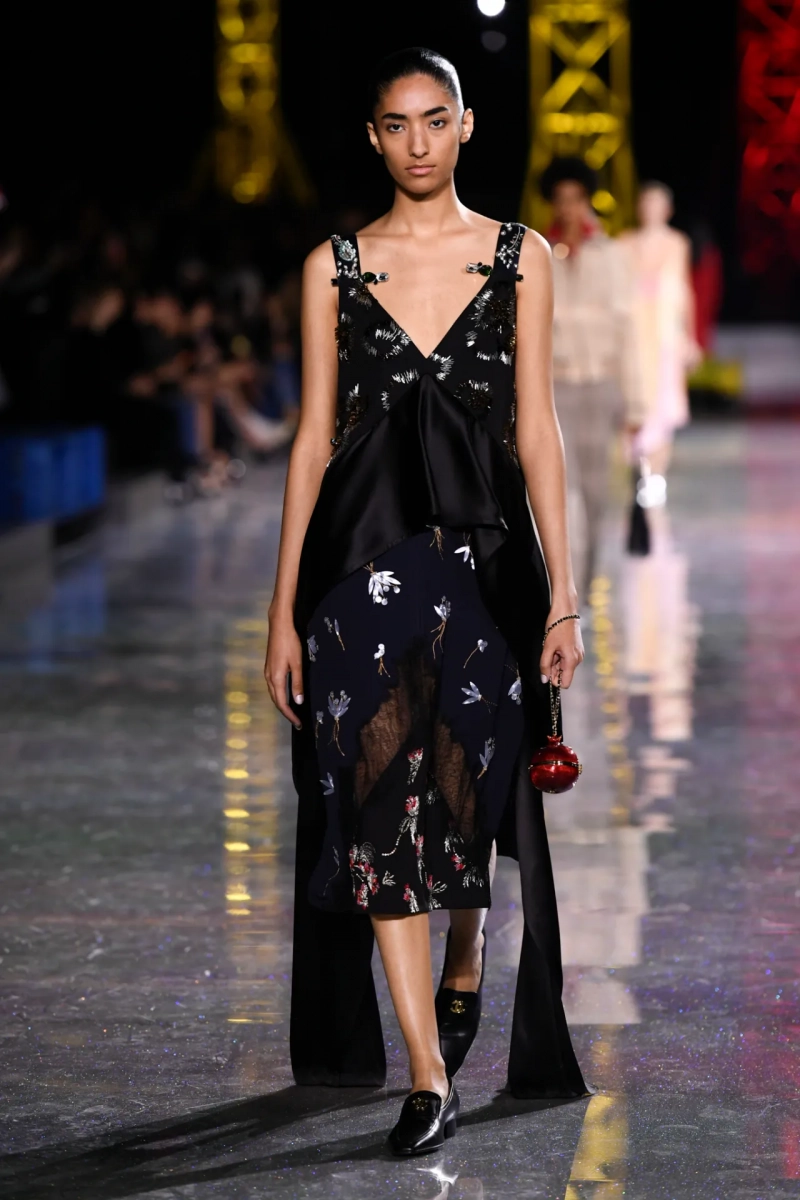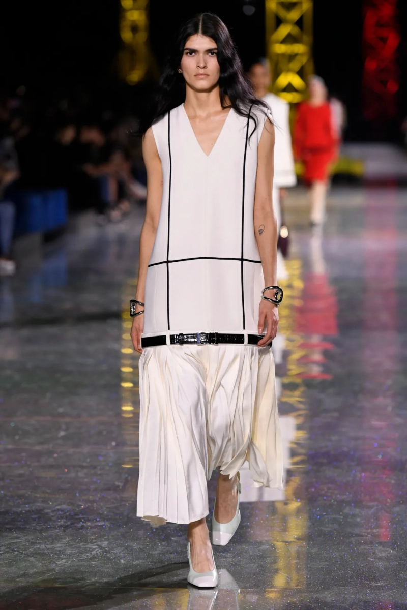 Постепенно показ переходит к более фантазийным вещам — переливающимся платьям из принтованной кольчуги, твиду trompe-l’oeil — ткани, которая лишь имитирует классический твид, — и материалам с металлическим блеском. Блази обращается к силуэту 1920-х с заниженной талией. В этом можно увидеть ответ на укороченные Bar-жакеты Джонатана Андерсона для Dior — только здесь пропорция движется в противоположную сторону, вытягивая силуэт вниз.