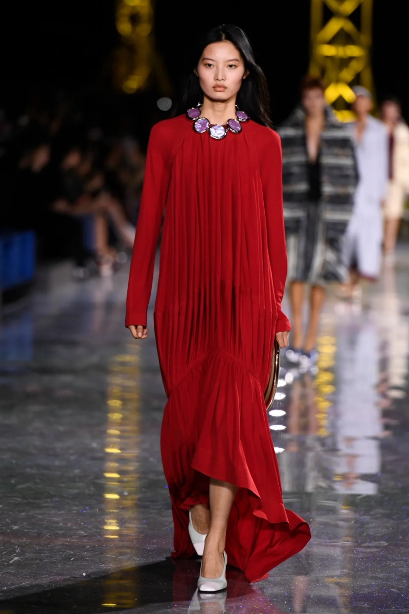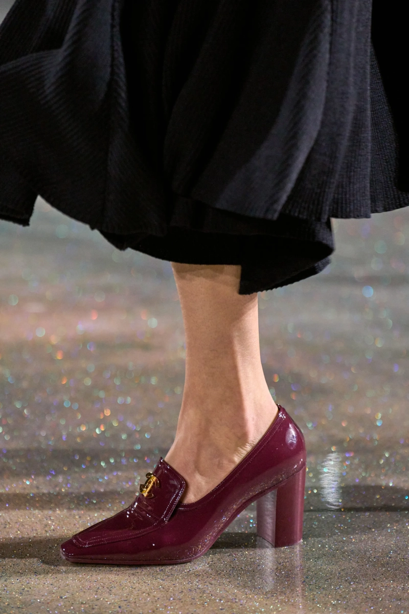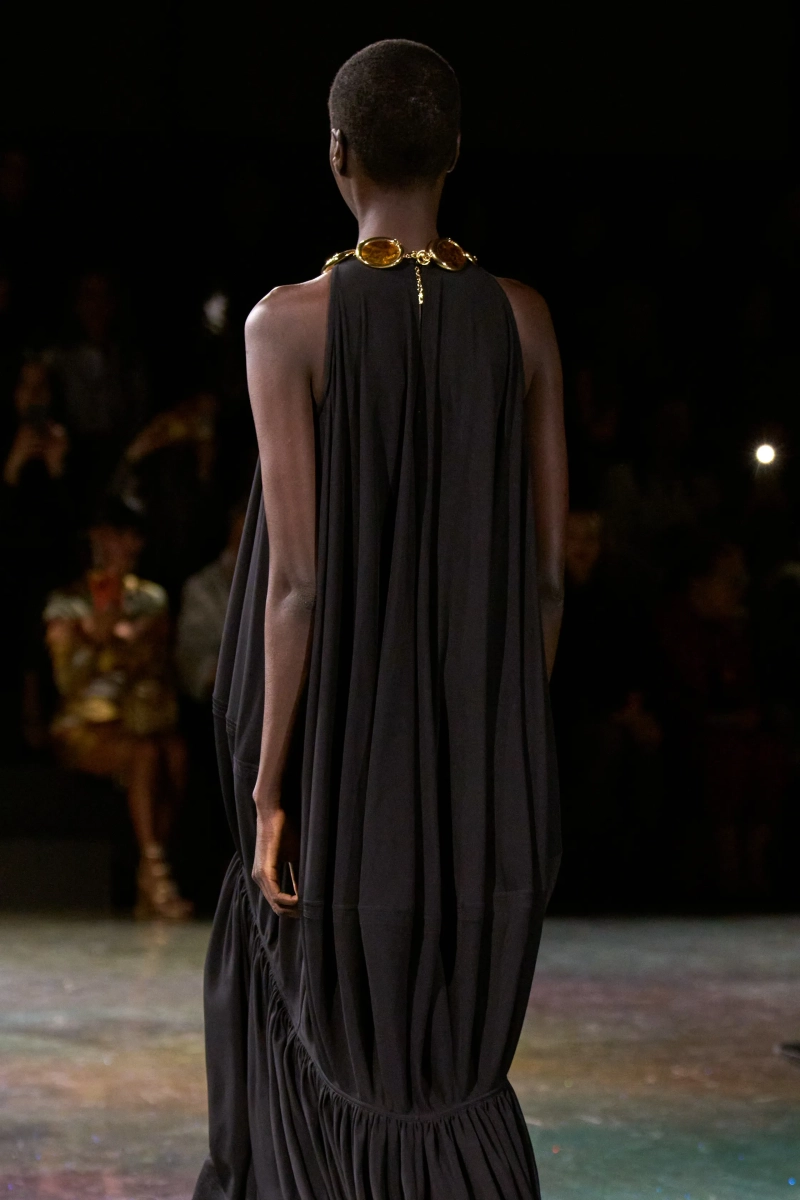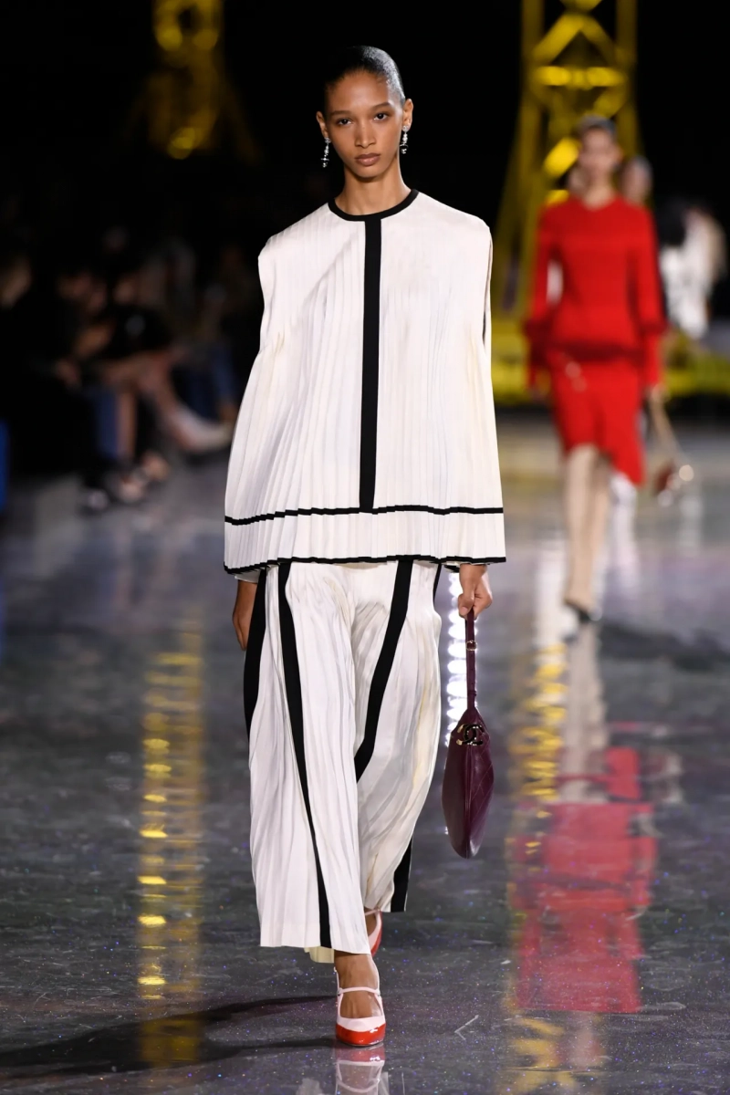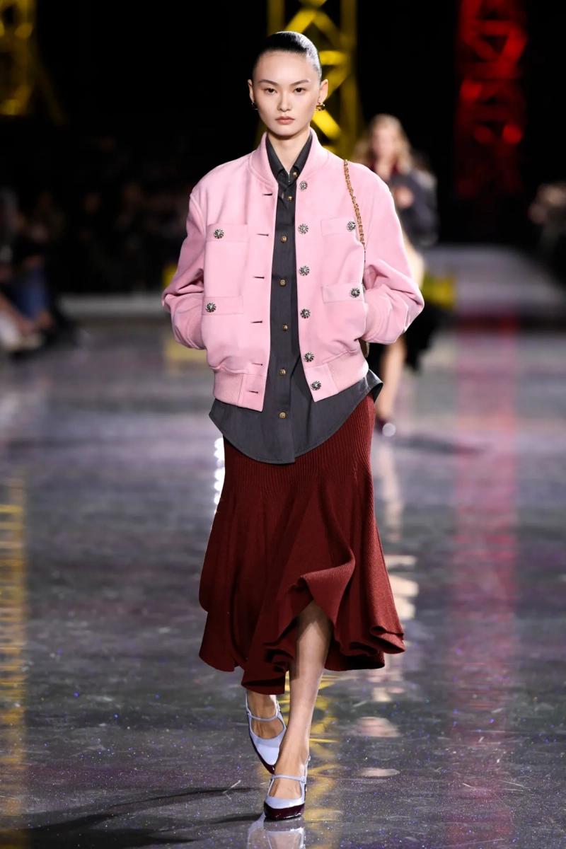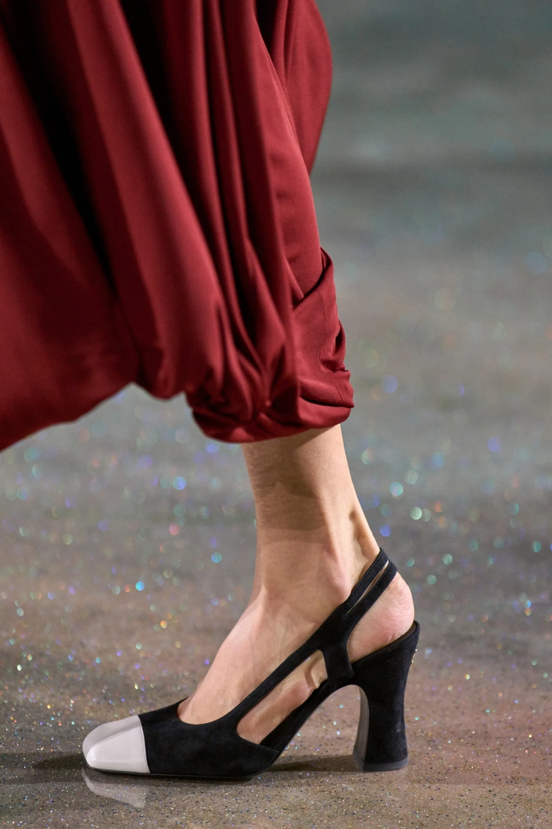 Постепенно показ переходит к более фантазийным вещам — переливающимся платьям из принтованной кольчуги, твиду trompe-l’oeil — ткани, которая лишь имитирует классический твид, — и материалам с металлическим блеском. Блази обращается к силуэту 1920-х с заниженной талией. В этом можно увидеть ответ на укороченные Bar-жакеты Джонатана Андерсона для Dior — только здесь пропорция движется в противоположную сторону, вытягивая силуэт вниз.