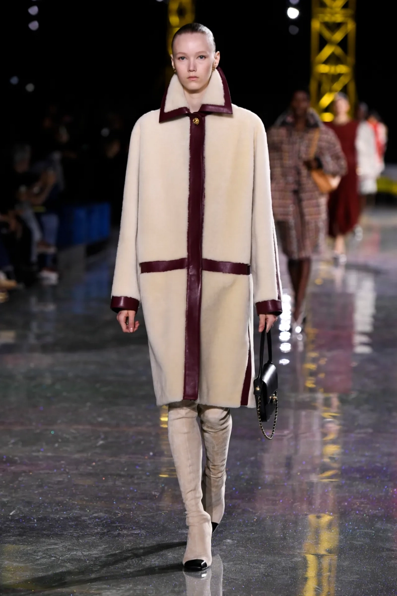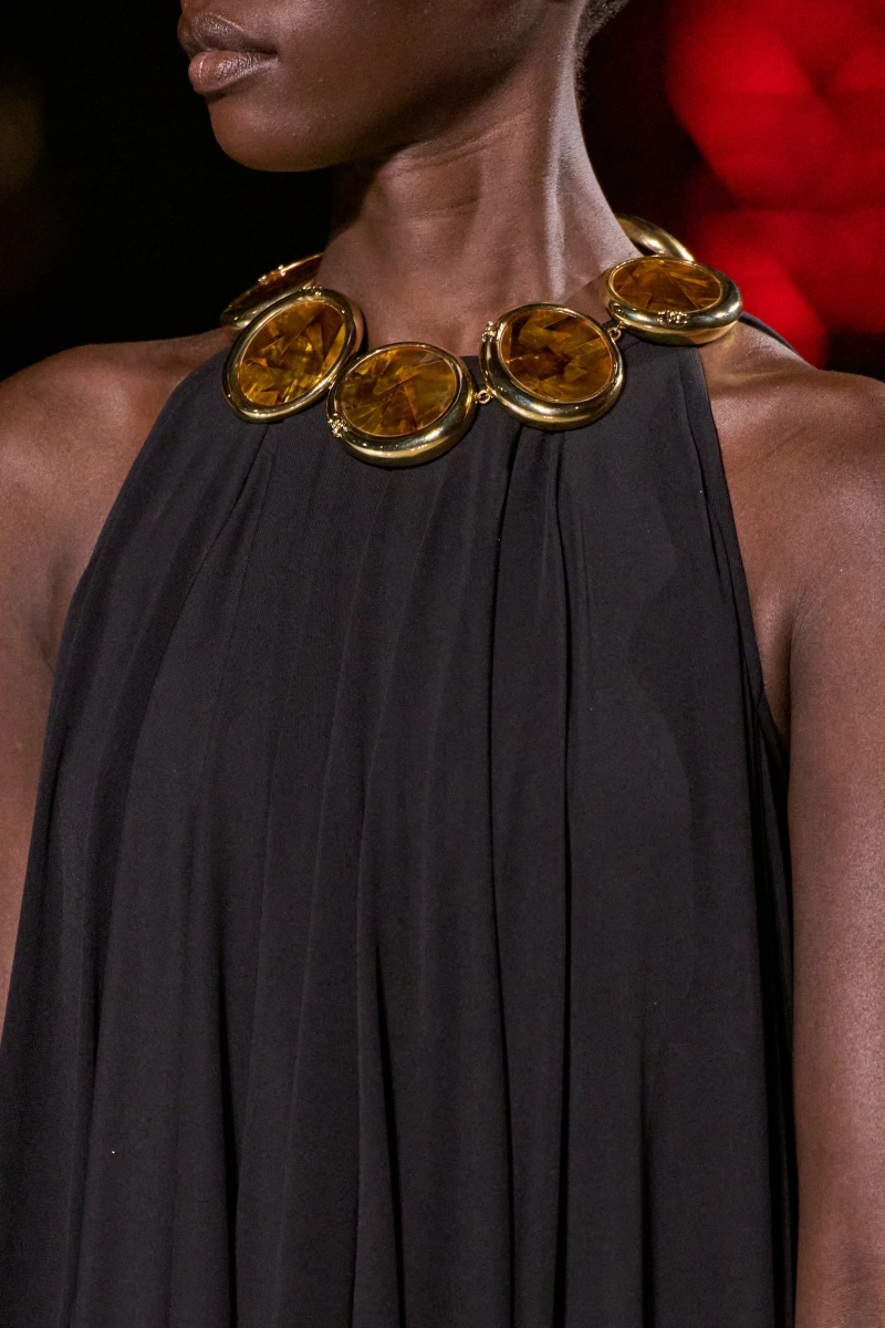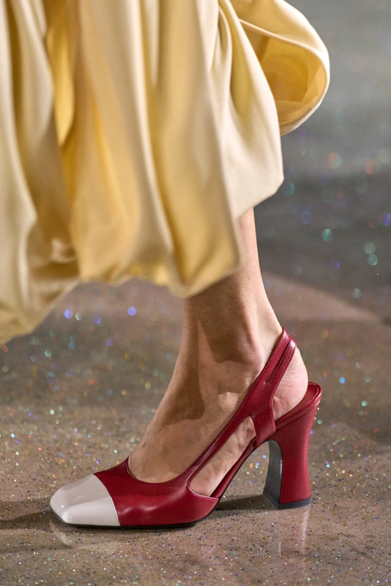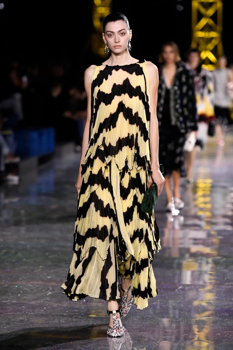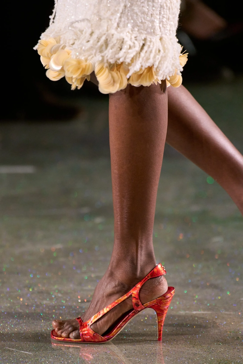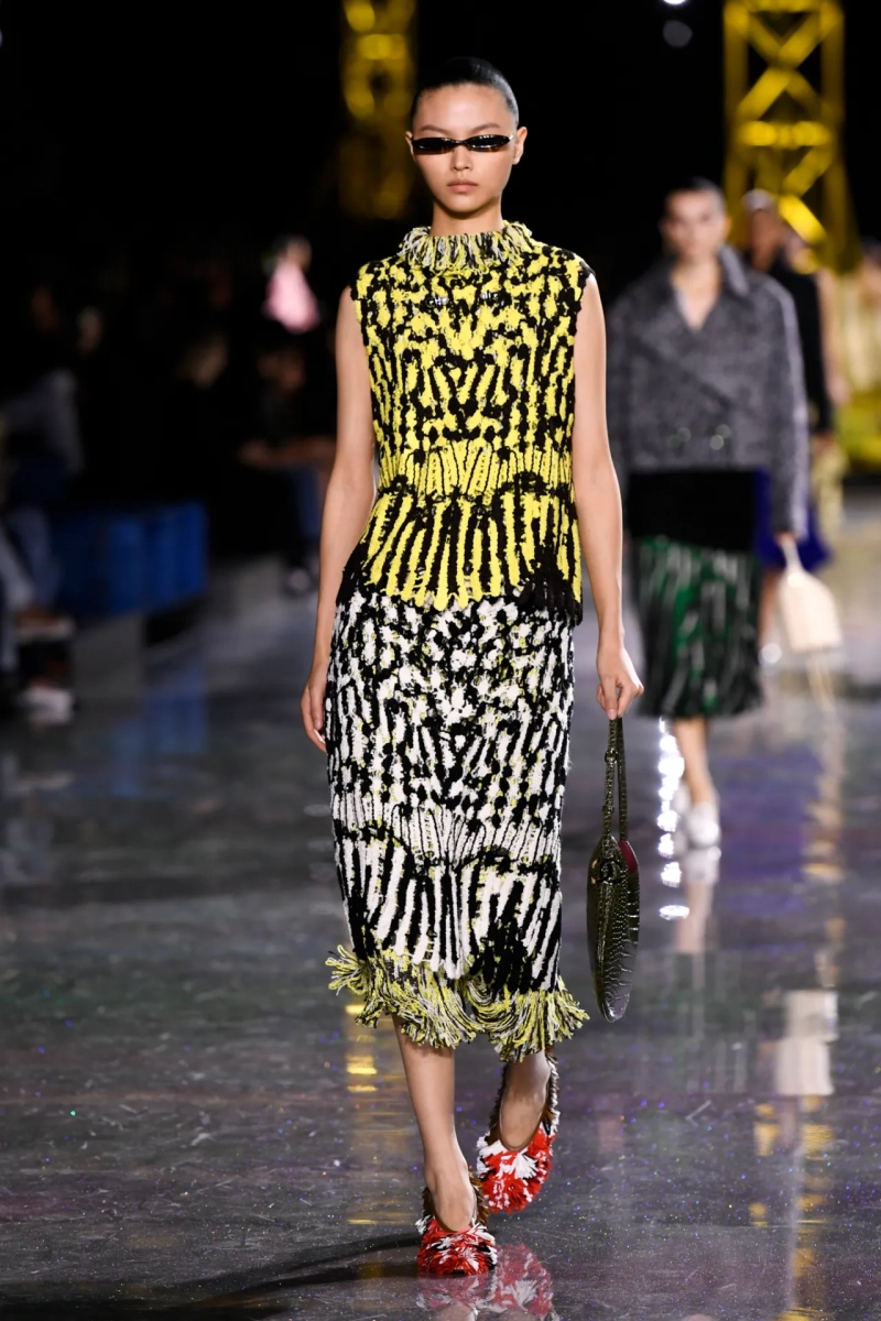 Постепенно показ переходит к более фантазийным вещам — переливающимся платьям из принтованной кольчуги, твиду trompe-l’oeil — ткани, которая лишь имитирует классический твид, — и материалам с металлическим блеском. Блази обращается к силуэту 1920-х с заниженной талией. В этом можно увидеть ответ на укороченные Bar-жакеты Джонатана Андерсона для Dior — только здесь пропорция движется в противоположную сторону, вытягивая силуэт вниз.