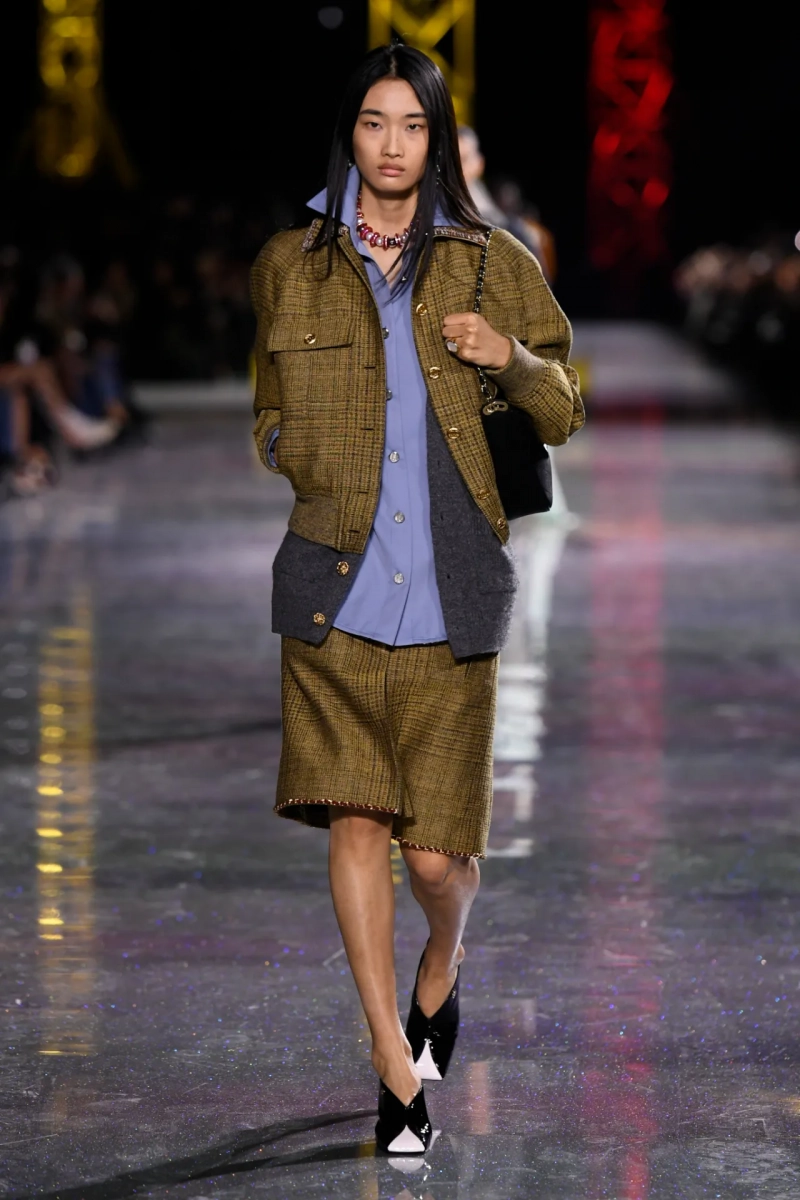 Эта метафора стала сценарием показа. Он начинается с самой простой части гардероба Chanel: твидовых костюмов с рубашками и футболками, лаконичных шелковых комплектов, прямых брюк с укороченными куртками.