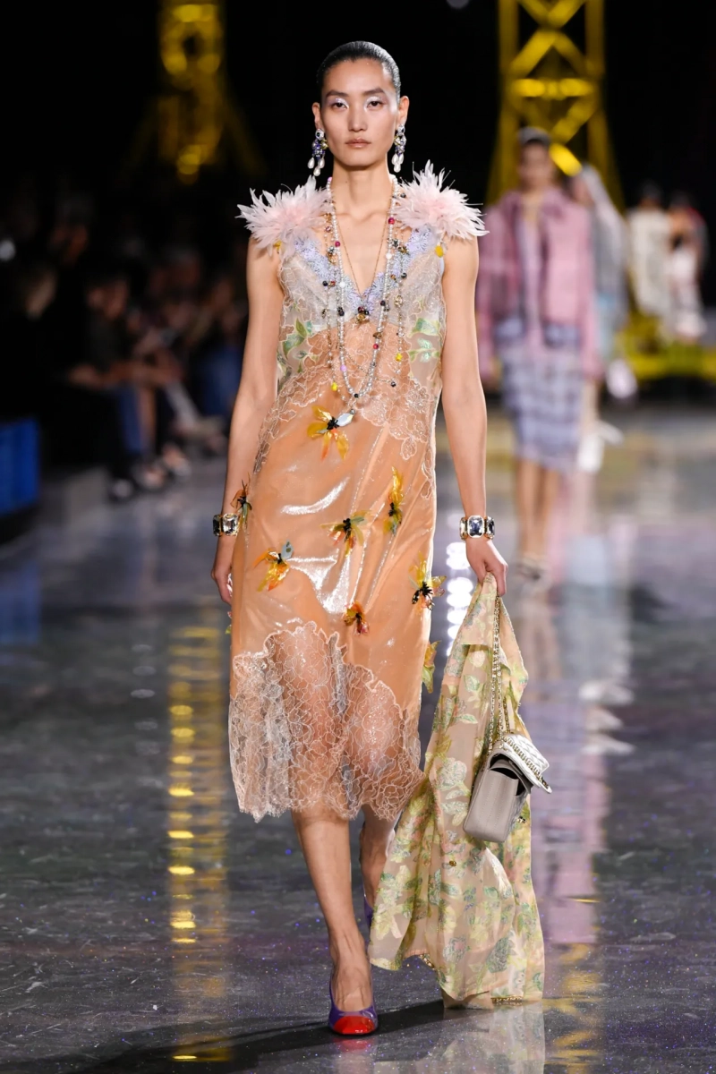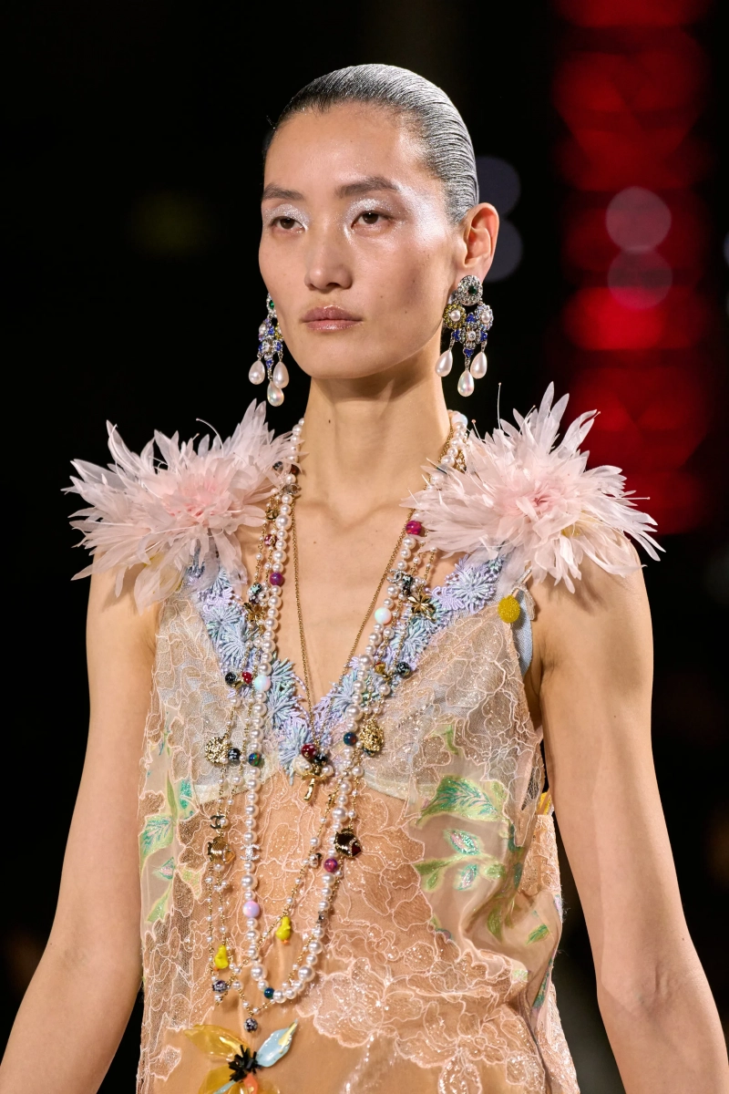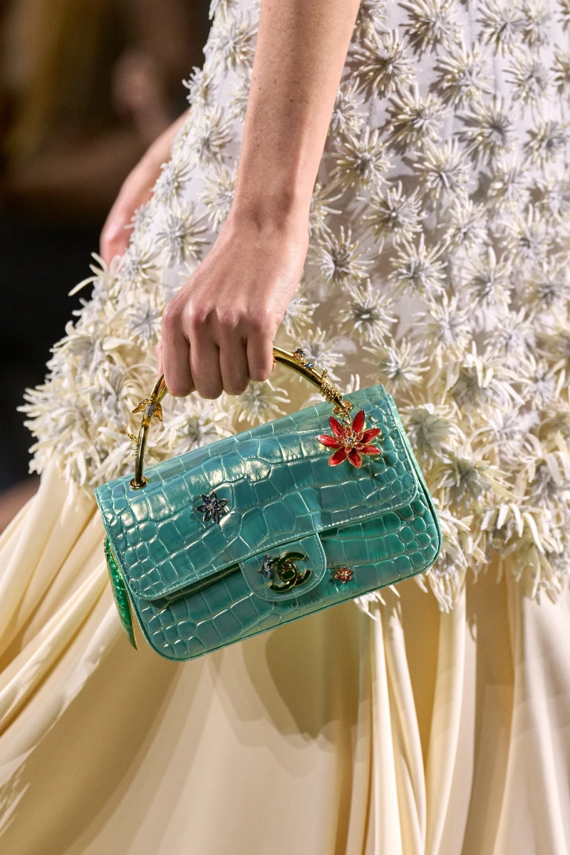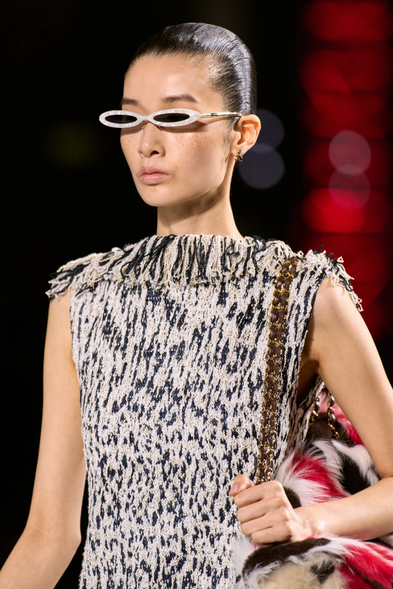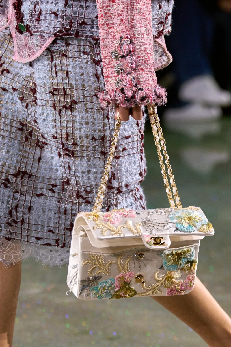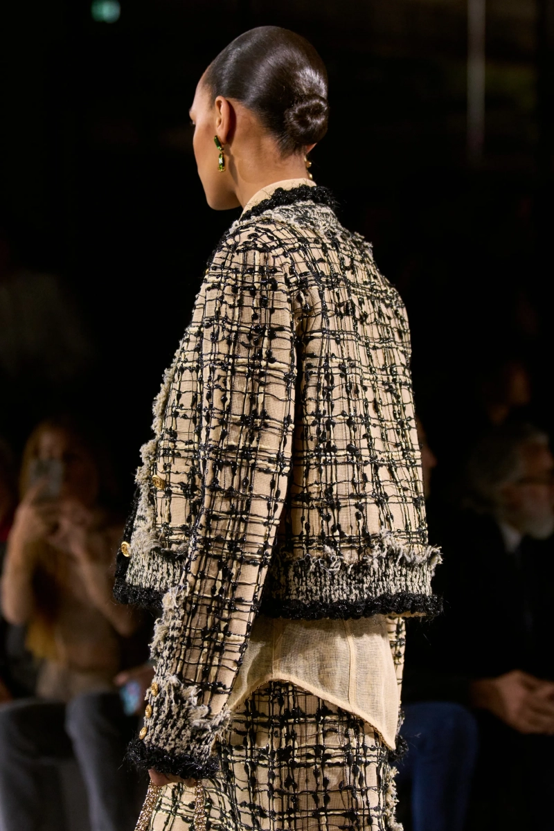 Отдельный разговор — ткани. Ателье Chanel демонстрируют виртуозную работу с материалом: твид распадается на пушистые нити, кружево покрывается сложной аппликацией, вышивка становится почти скульптурной. Среди этих фактур время от времени появляются маленькие насекомые — в вышивке и украшениях. Они продолжают метафору Габриэль о гусенице и бабочке: от плотного твида показ постепенно движется к почти невесомым вечерним платьям.