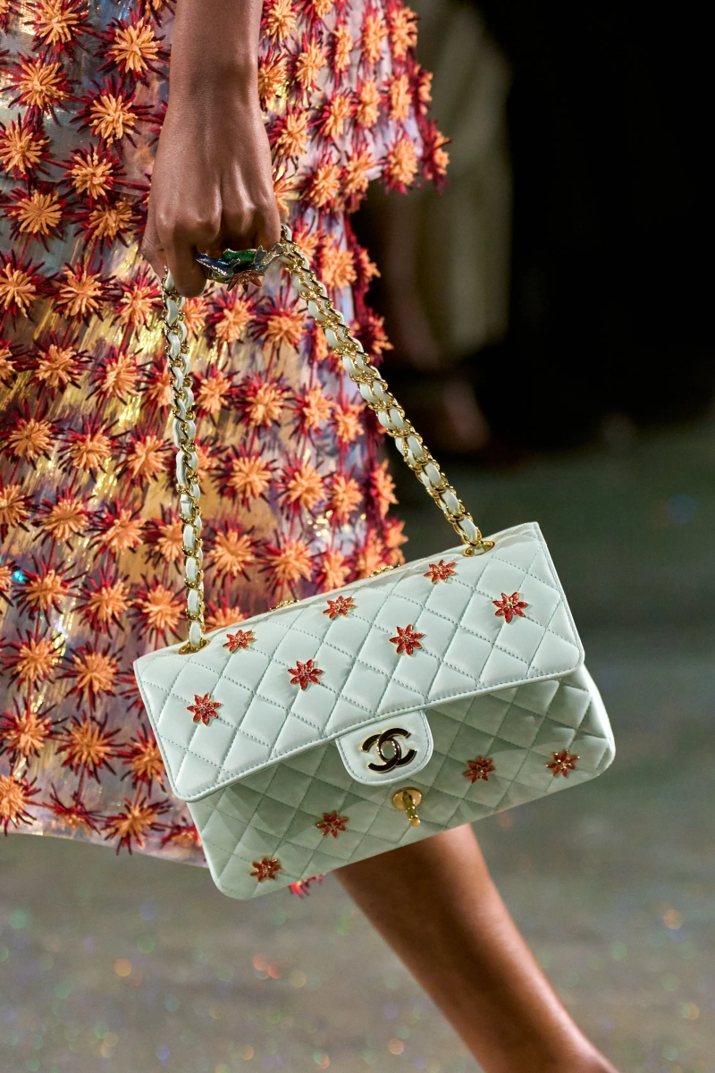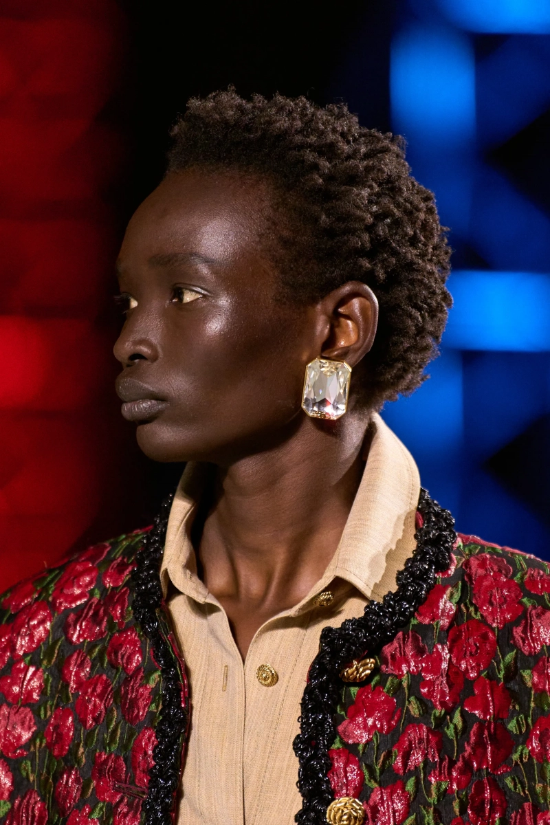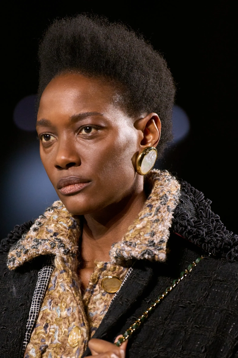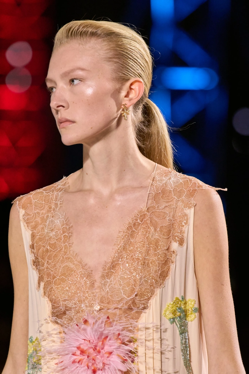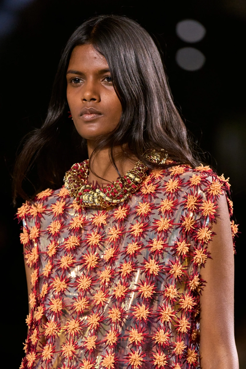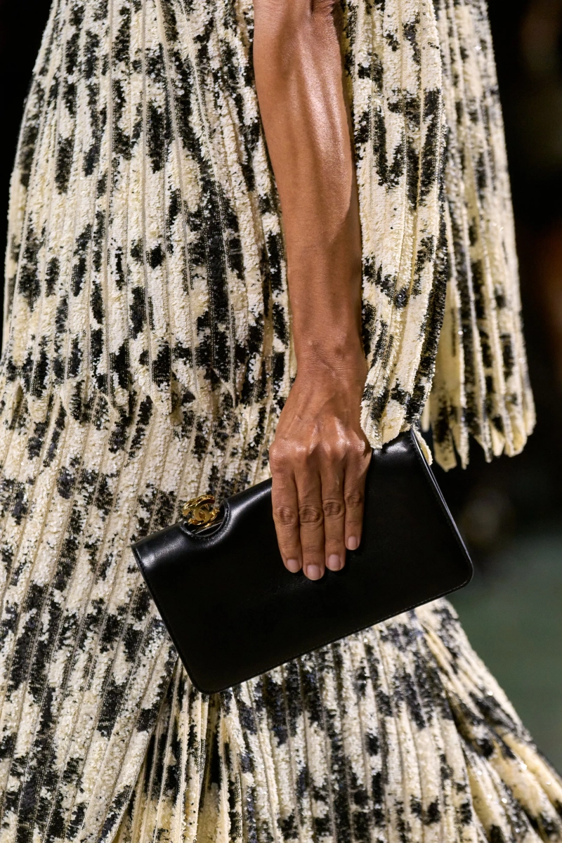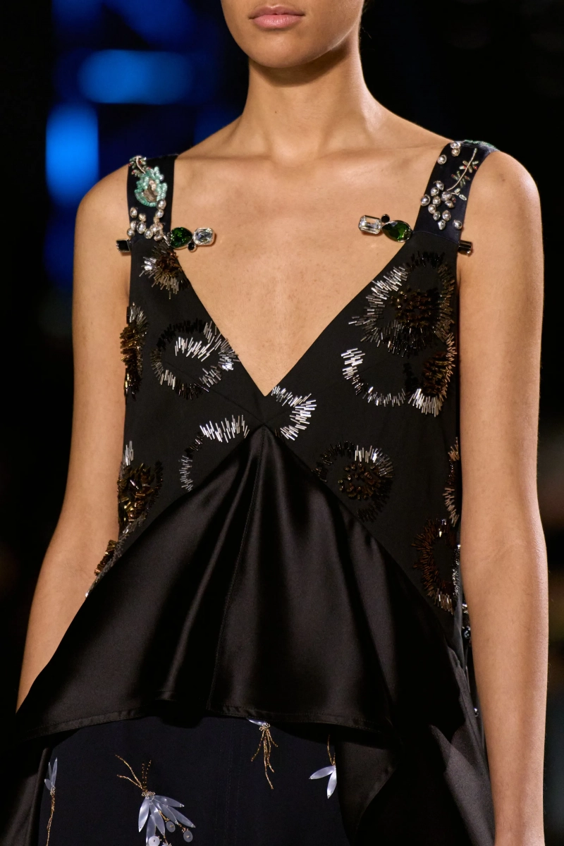 Отдельный разговор — ткани. Ателье Chanel демонстрируют виртуозную работу с материалом: твид распадается на пушистые нити, кружево покрывается сложной аппликацией, вышивка становится почти скульптурной. Среди этих фактур время от времени появляются маленькие насекомые — в вышивке и украшениях. Они продолжают метафору Габриэль о гусенице и бабочке: от плотного твида показ постепенно движется к почти невесомым вечерним платьям.