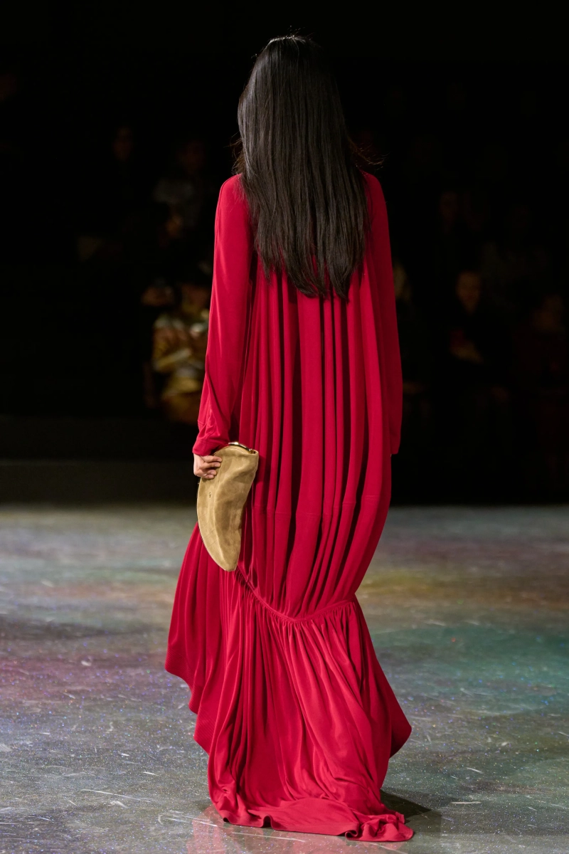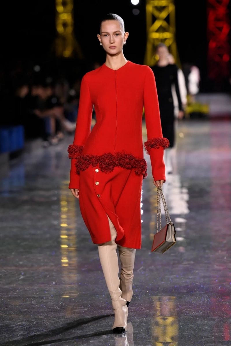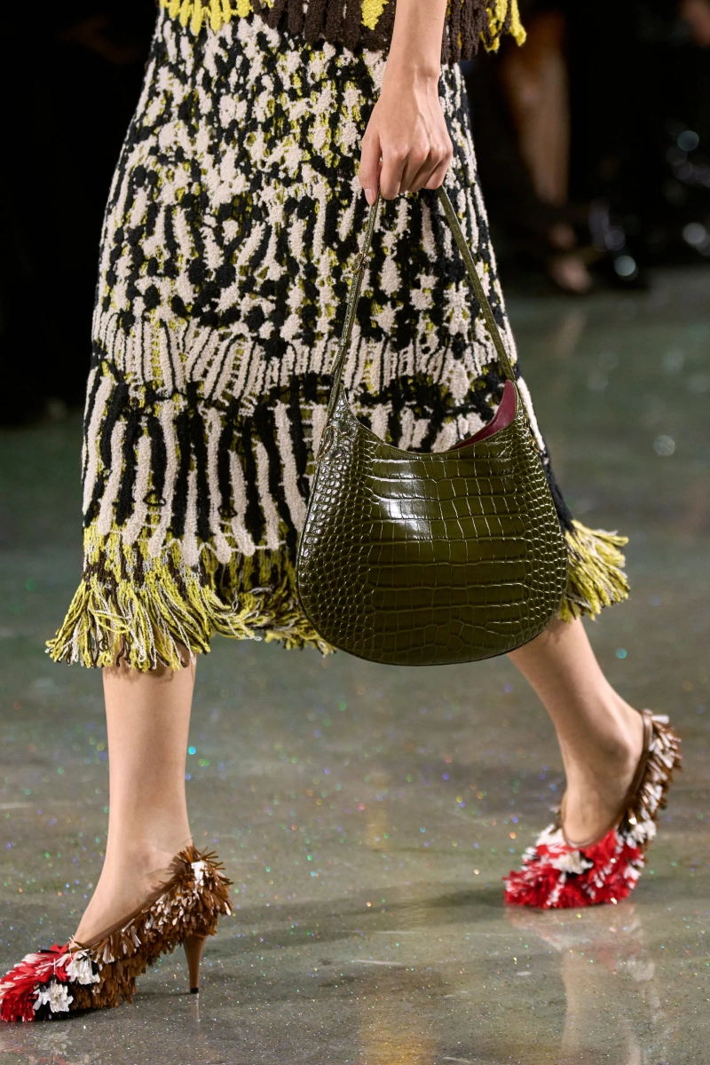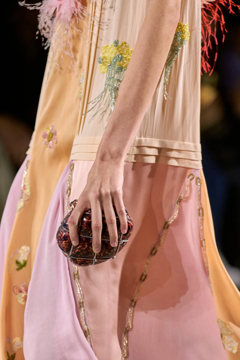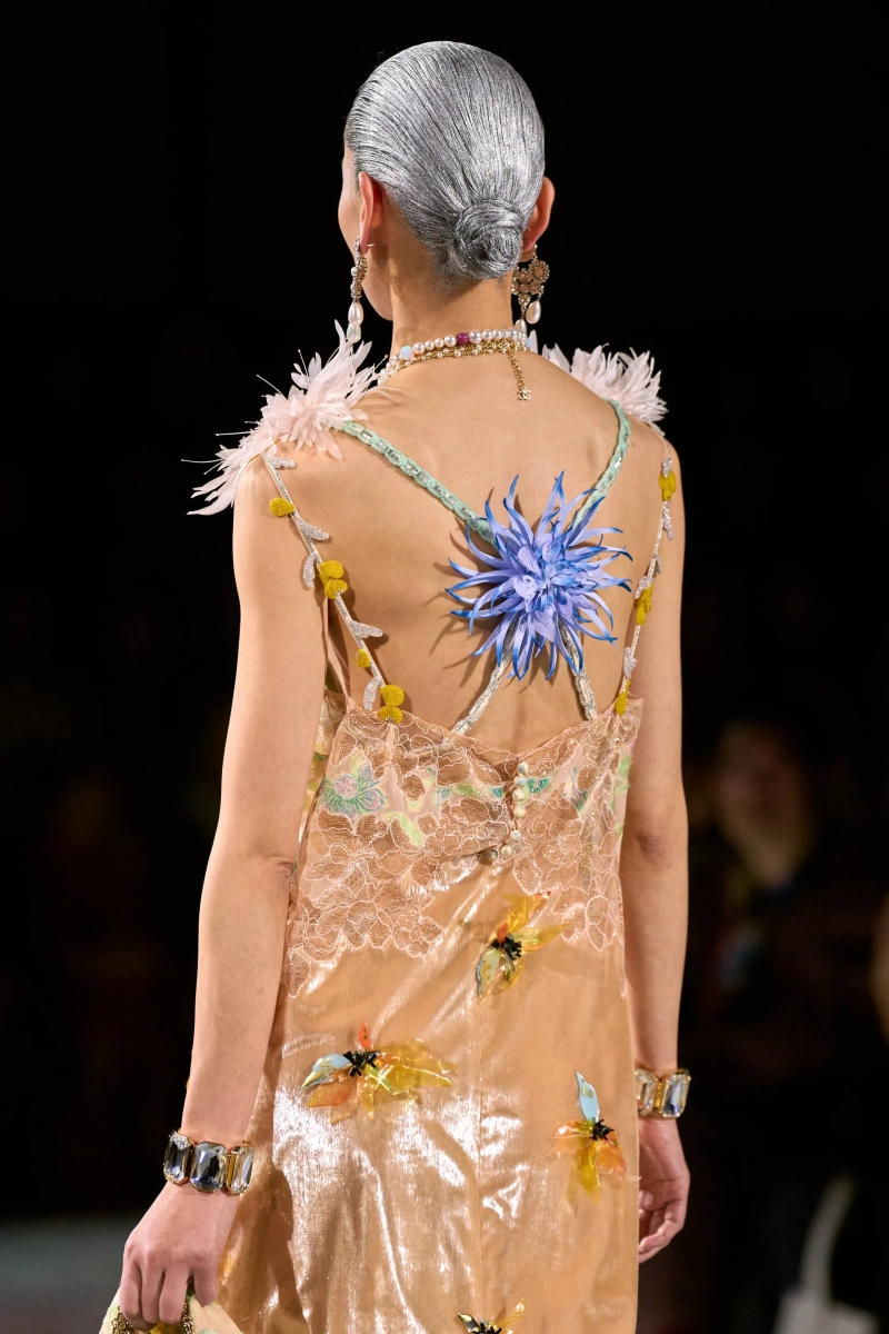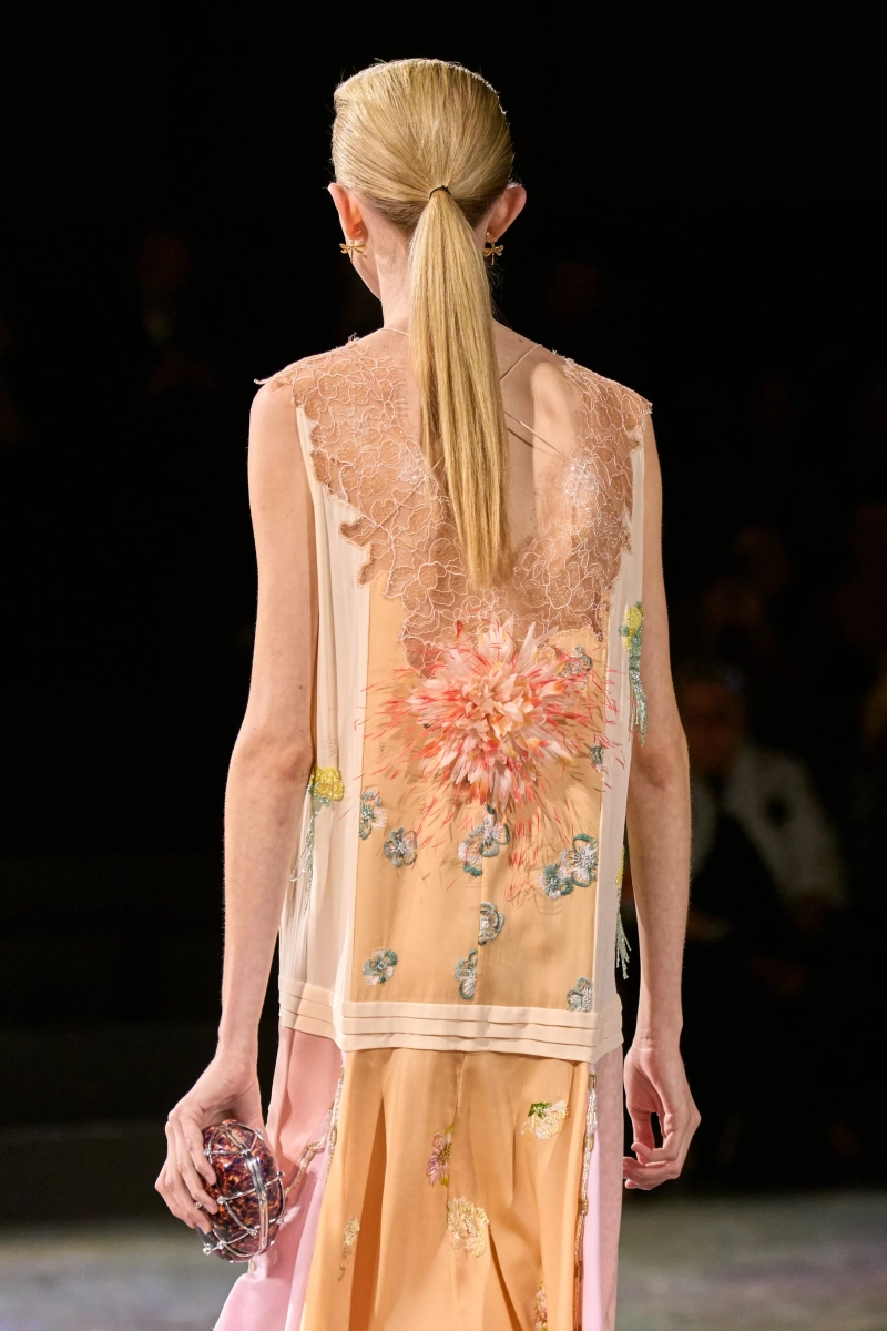В коллекции появляются мягкие платья с заниженной талией и объемно собранным подолом — будто ткань собирается в кокон. Рядом — твидовые жакеты с грубой декоративной кромкой, сетчатые юбки поверх тонких подкладок, сумки с цветочной вышивкой и ботфорты, плотно обтягивающие ногу.