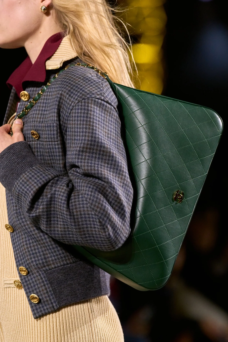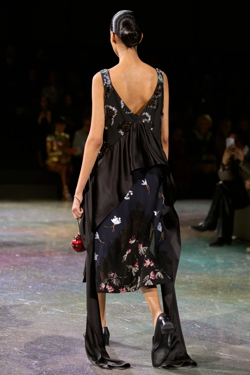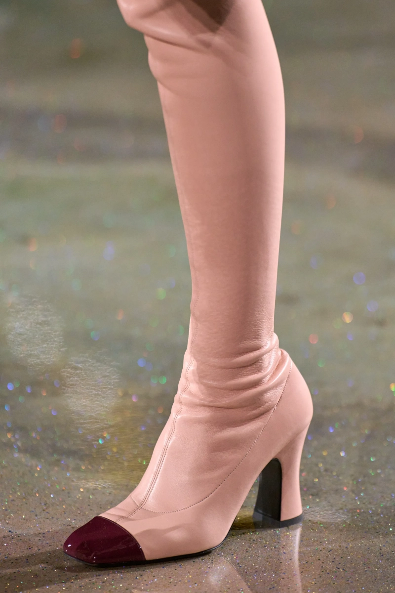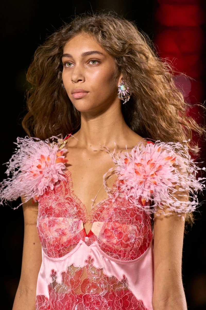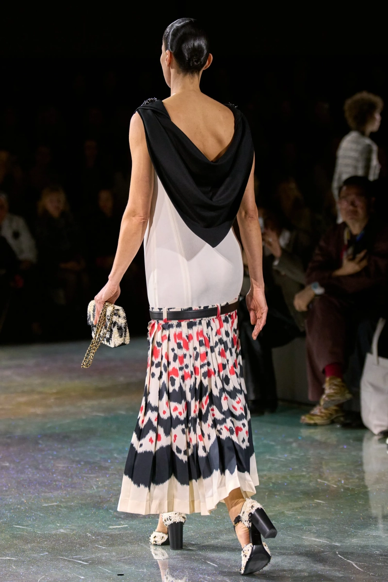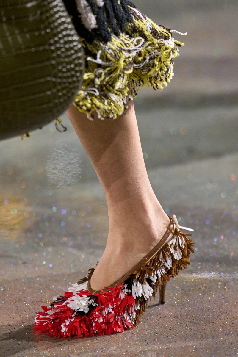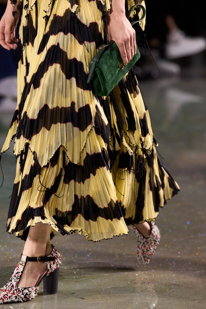 В коллекции появляются мягкие платья с заниженной талией и объемно собранным подолом — будто ткань собирается в кокон. Рядом — твидовые жакеты с грубой декоративной кромкой, сетчатые юбки поверх тонких подкладок, сумки с цветочной вышивкой и ботфорты, плотно обтягивающие ногу.