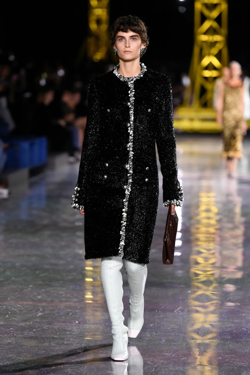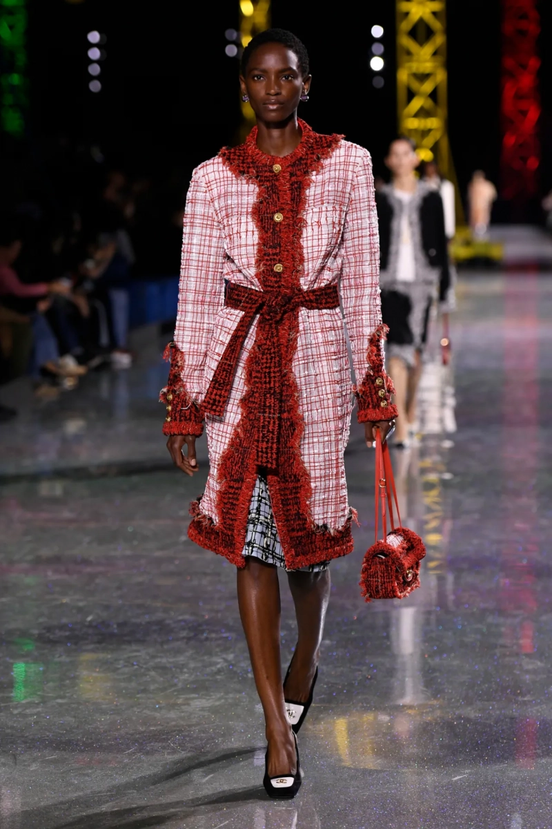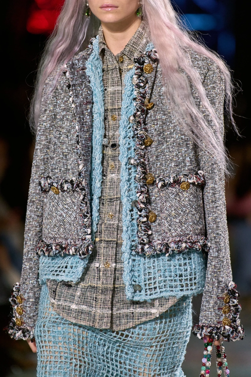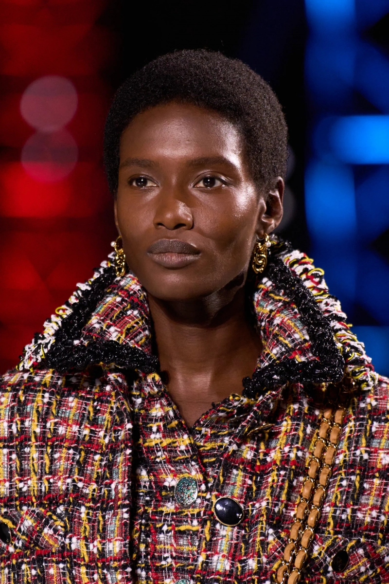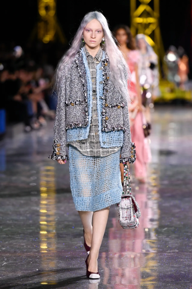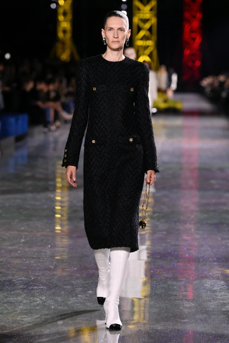 На этом фоне Блази представил свою вторую ready-to-wear коллекцию для Chanel. Grand Palais в этот вечер выглядел как строительная площадка: над подиумом поднимались краны, подсвеченные основными цветами.