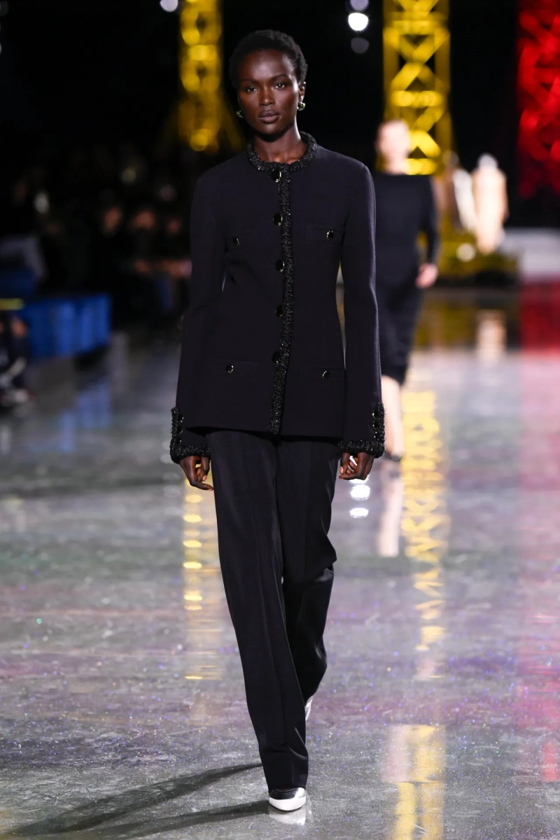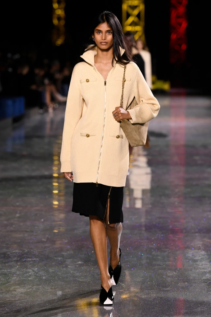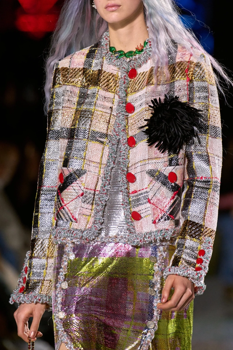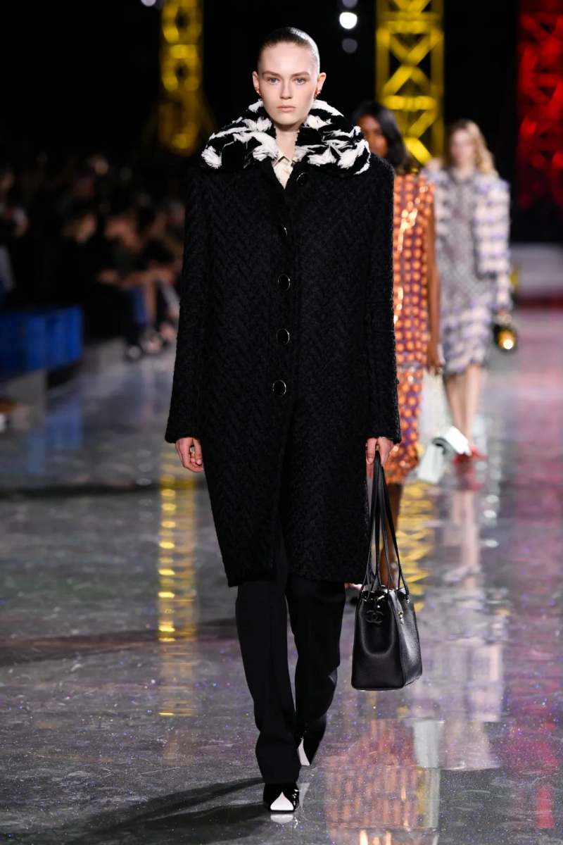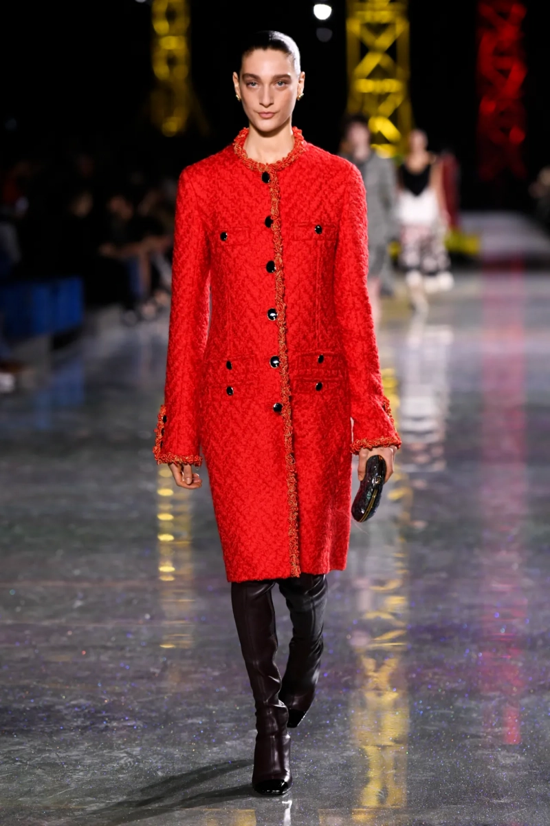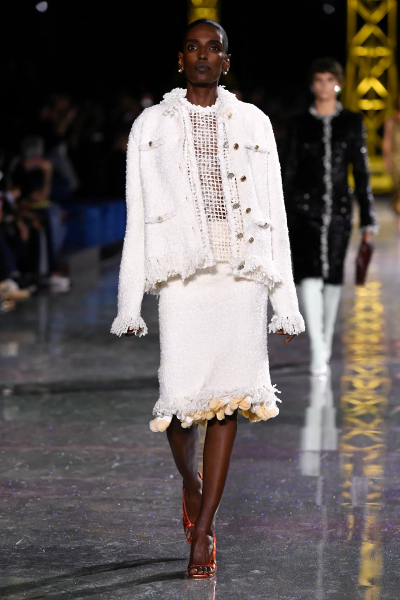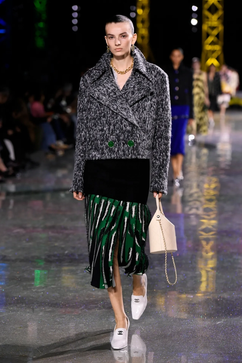 На этом фоне Блази представил свою вторую ready-to-wear коллекцию для Chanel. Grand Palais в этот вечер выглядел как строительная площадка: над подиумом поднимались краны, подсвеченные основными цветами.