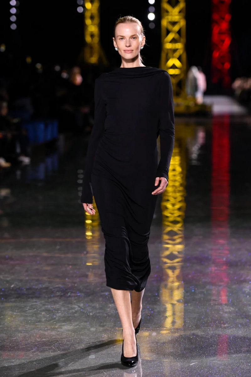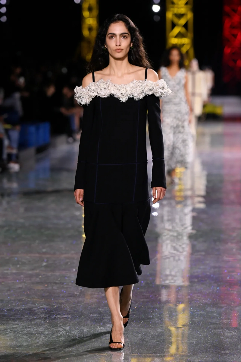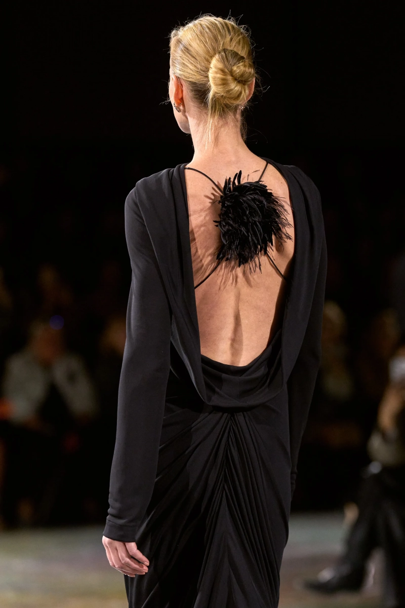 Финальное слово Блази оставляет самой Шанель. На подиуме вновь появляется маленькое черное платье — из текучего джерси, почти аскетичное спереди и с глубоко открытой спиной. Между лопатками — подвешенная камелия.