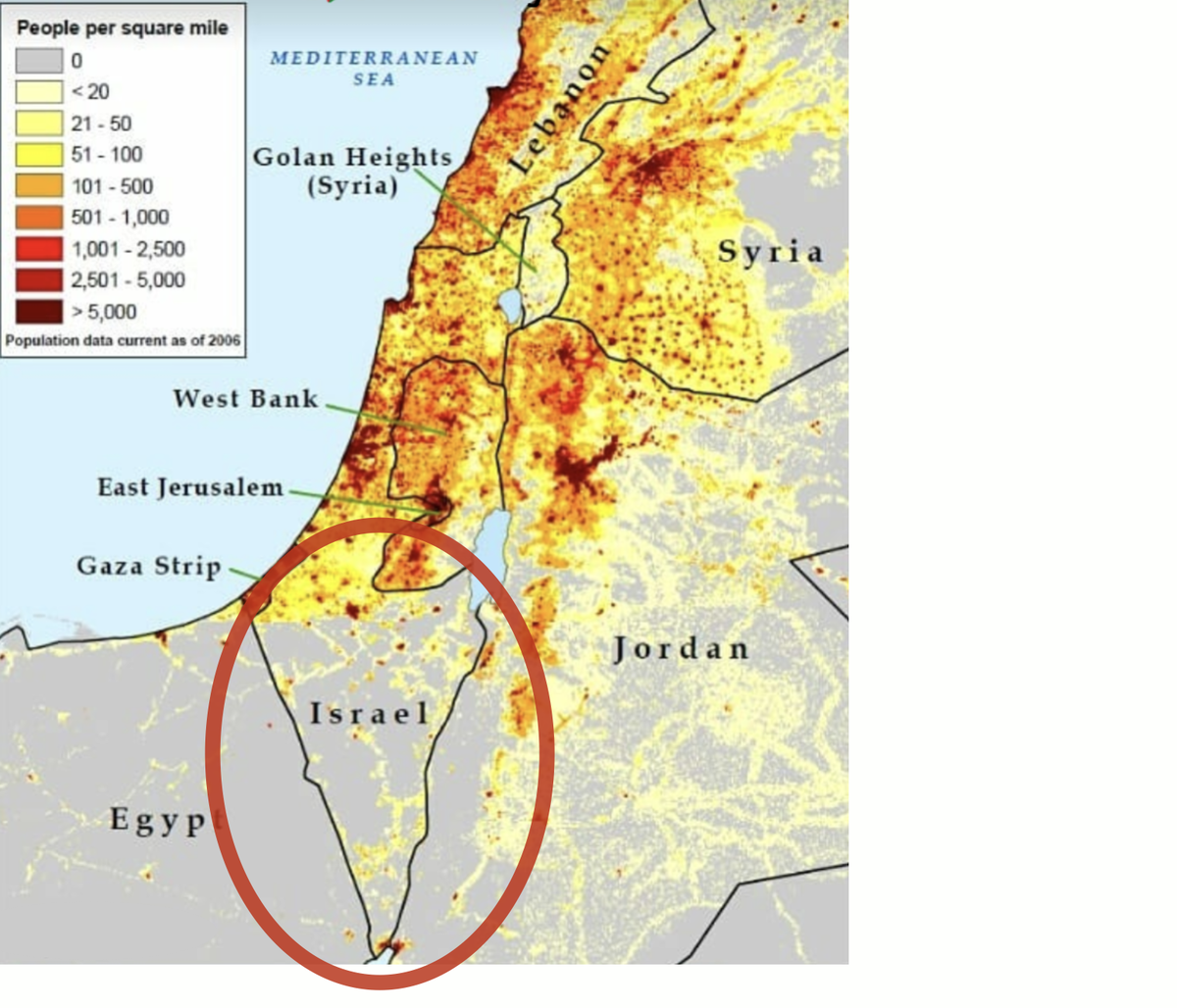 Если взглянуть на карту плотности населения, то будет хорошо заметно, что юг Израиля очень слабо заселен. Там расположена