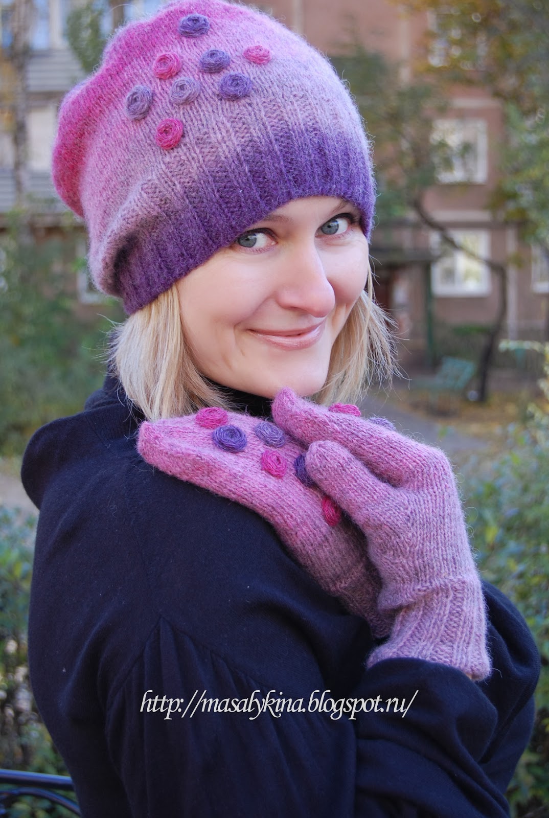 Помните мой Зеленый комплект , который мне пришлось отдать...? Горевала я не долго поэтому поводу, всего пару-тройку дней. В замен ему на днях был связан новый, но другого цвета. Никогда не могла бы подумать, что такие оттенки мне к лицу)) Нитки Кауни 8/1 Pink-lila, спицы №2,5 и 3, вес шапки 65 грамм , вес варежек 50грамм. Вязалось в 3 нити от одного клубка. Все таки кауни не устает меня удивлять, была бы еще она помягче, цены бы ей не было)). Из-за большого скопления в доме разных шапочек, беретиков и тому подобных вещиц, было решено отправить этот "Ягодный смузи" продаваться в МОЙ МАГАЗИН . А на Ravelry у меня тоже есть картиночки этого комплекта.