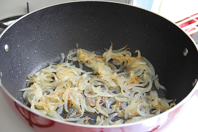Лук нарезать полукольцами и обжарить в одной столовой ложке сливочного масла +( херес если используется) до прозрачности.