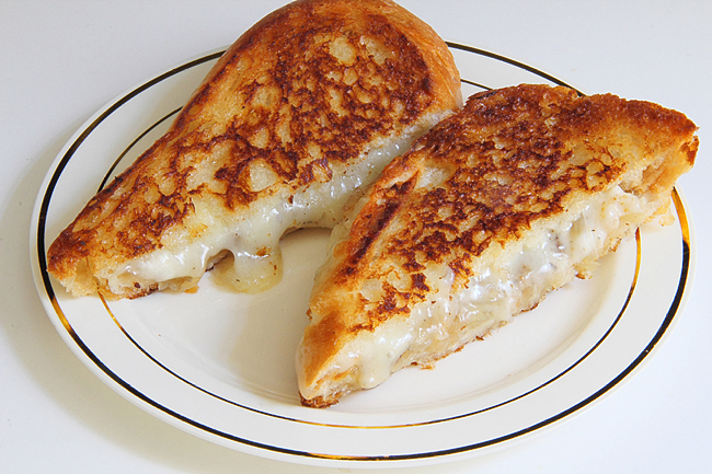 Вкуснейший горячий бутерброд со сладким жареным луком и расплавленным острым сыром...