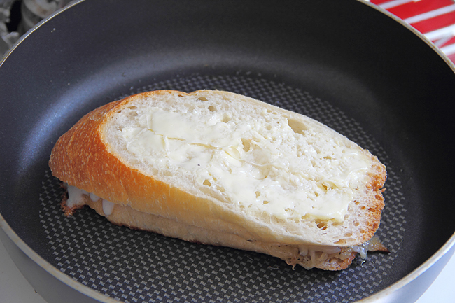 Намазать одну сторону бутерброда сливочным маслом и отправить на сухую разогретую сковороду.