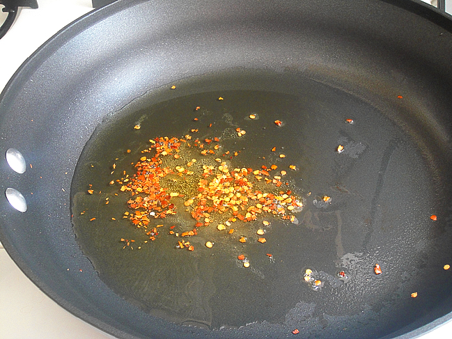 Разогреть в сковороде пару ложек оливкового масла, добавить немного горького перца и обжарить баклажаны до мягкости.