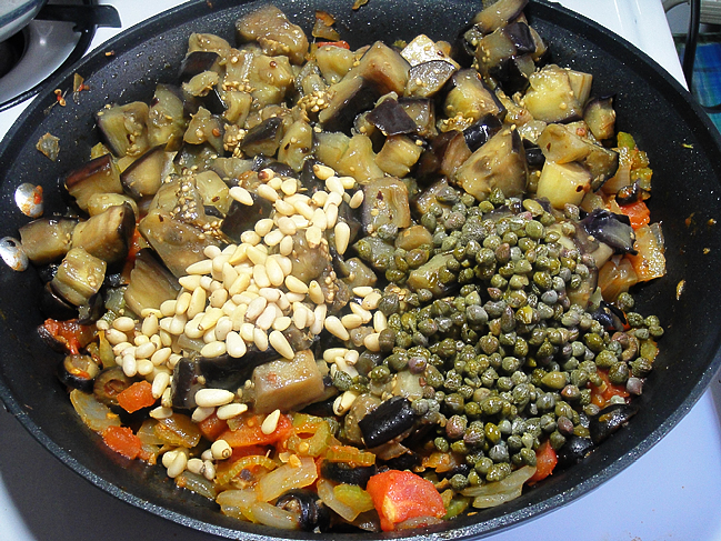 Вернуть в сковороду обжаренные кусочки баклажанов, добавить каперсы и кедровые орешки.
