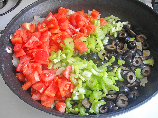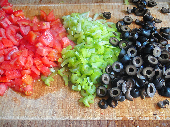 Нарезать помидоры (предварительно очищенные от кожицы) , сельдерей и оливки.