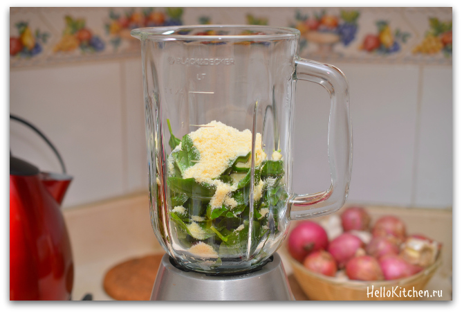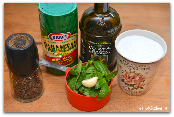 1. Взбиваем в блендере базилик, Пармезан и чеснок. В конце добавляем оливковое масло, снова взбиваем. Кто хочет, может добавить сюда же горсть кедровых орешков.