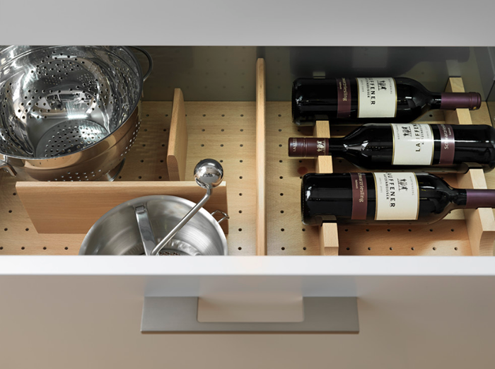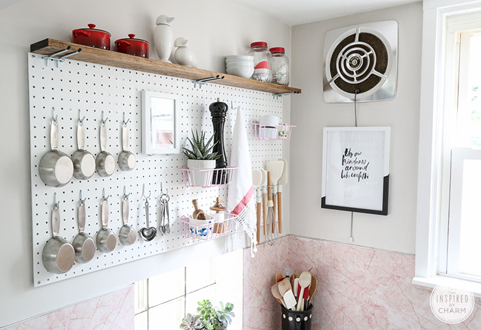 Одна из самых подходящих комнат для применения перфорированных панелей - это, конечно же, кухня, где обычно хранится огромное количество всякой мелочи, которую хочется держать в одном месте и в идеале на расстоянии вытянутой руки. Для этого сгодится любой пустующий простенок недалеко от мойки или плиты, куда можно прикрепить металлический лист в мелкую дырочку с крючками для разной утвари и посуды. Кстати, очень круто на кухне смотрятся деревянные перфорированные панели с крупными отверстиями и колышками, ими можно заменить верхние шкафчики.