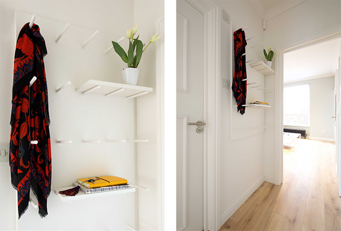 Также перфорированные панели - полезный инструмент в условиях небольшого пространства и проходных зон. Они занимают гораздо меньше места нежели шкаф, да и разместить аксессуары получится более компактно, чем в случае с открытыми полками или крючками.
