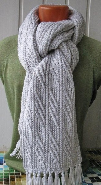 Шарф связан из нежной светло серой, почти белой пряжи меринос 70% + акрил 30%. Отчасти, благодаря качеству пряжи, отчасти, благодаря вязке - английская резинка заплетённая в жгуты ( рисунок двухсторонний) - шарф получился очень тёплый, нежный и мягкий, приятный к телу и уютный. В него можно закутаться и в 2, и в 3 оборота- длина позволяет (18 Х 226 см + кисти 8 см.)