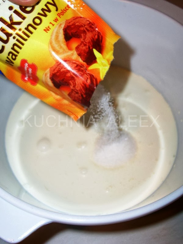 Влить сливки в блюдо, добавить ванильный сахар. Взбивать до загустения