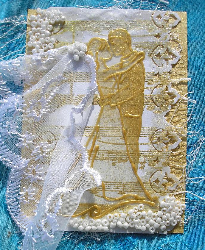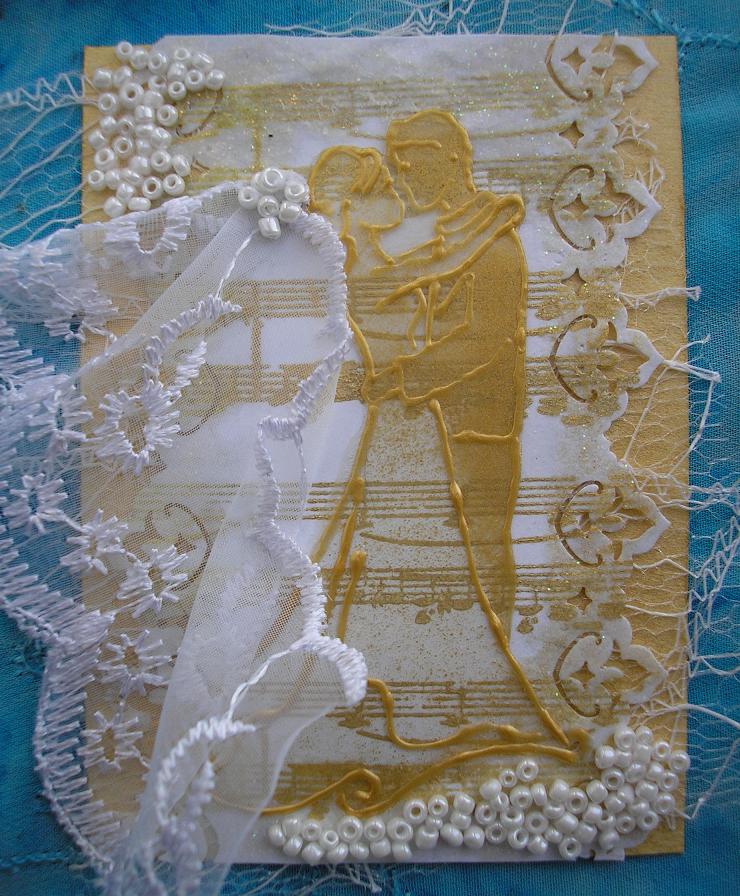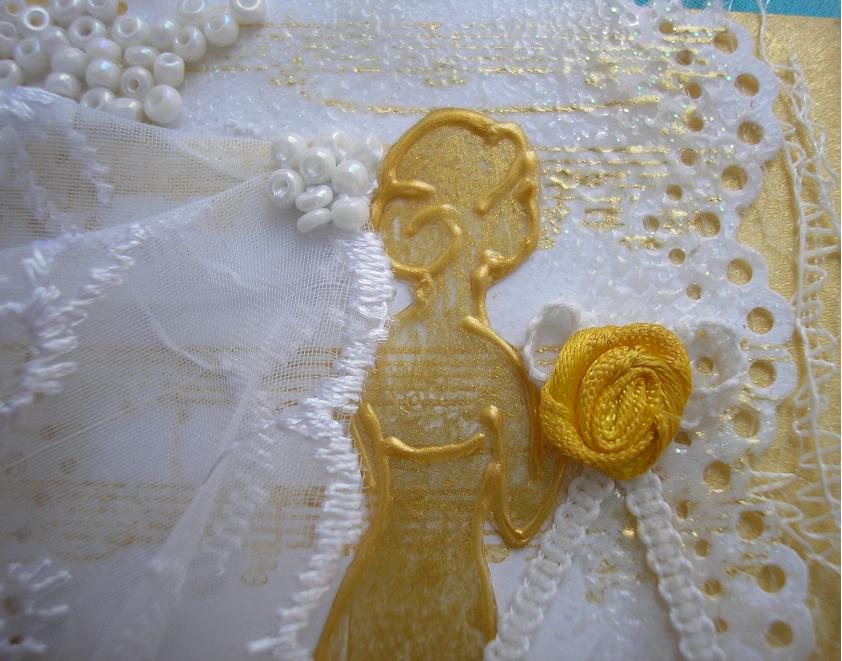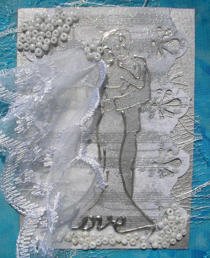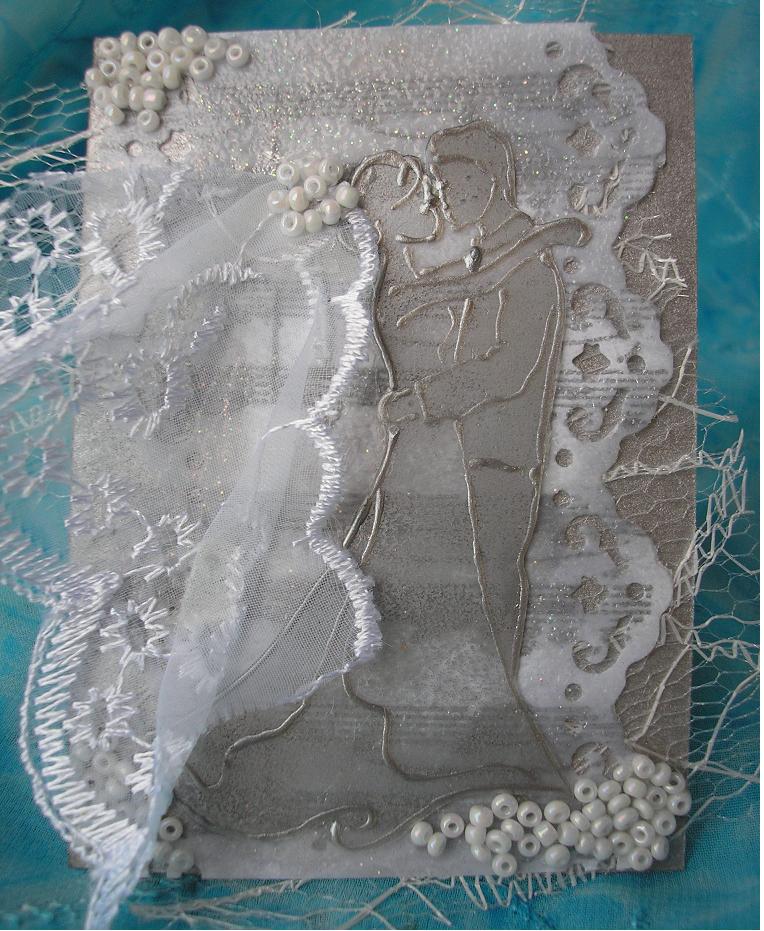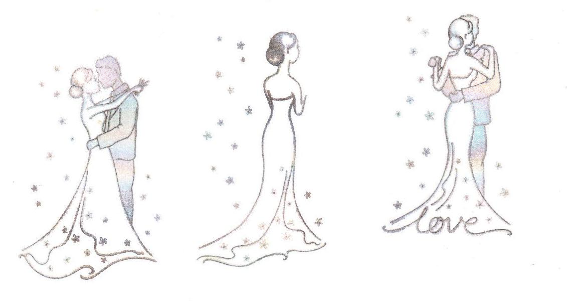 Думала я долго-долго, вариантов было как всегда много. Но очень мне хотелось передать торжественность, праздничность этого свадебного мероприятия и красоту свадебной пары, легкость и невесомость нежного облака - невесты. А еще у меня с давних пор лежат распечатанные свадебные картинки - контуры невесты и пары.
