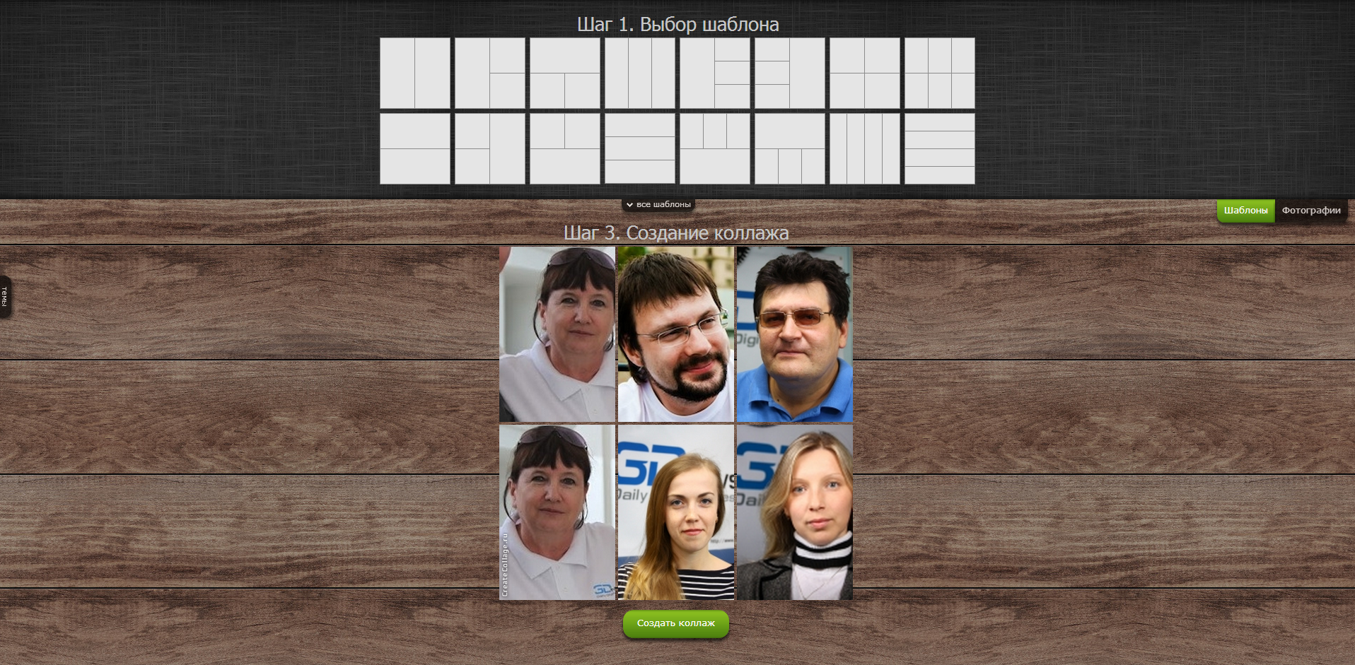 Очень простой сервис, который дает возможность быстро сгенерировать коллаж, состоящий из небольшого числа фотографий, по заданному шаблону. Максимальное число элементов в коллаже — шесть. Никаких настроек у сервиса нет. В общем, это идеальный вариант для ситуации, когда нужно сделать коллаж быстро, например для создания «корпоративного» фото. Если конечный результат вас не устроил, можно вернуться на этап выбора шаблона и подобрать другой вариант размещения фотоснимков. При этом загружать изображения повторно не придется.