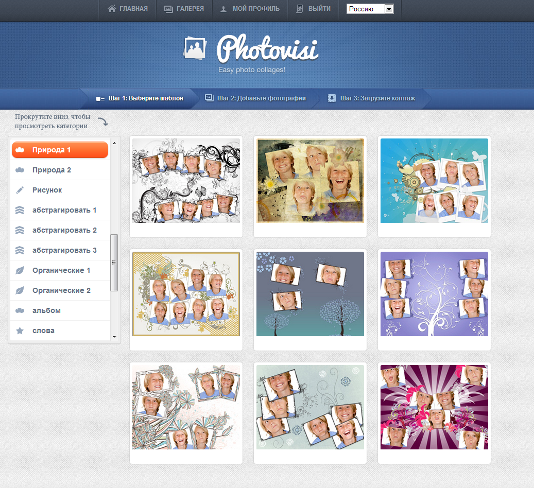 Генератор коллажей Photovisi сделан по принципу пошагового мастера. Создание рисунка из подборки изображений происходит в три этапа. На первом шаге пользователь выбирает шаблон из библиотеки сервиса. Набор различных вариантов оформлений коллажа достаточно разнообразен, так что выбрать есть из чего. Кроме того все дизайнерские шаблоны отсортированы по категориям: «Праздники», «Природа», «Рисунок», «Эффекты» и так далее.