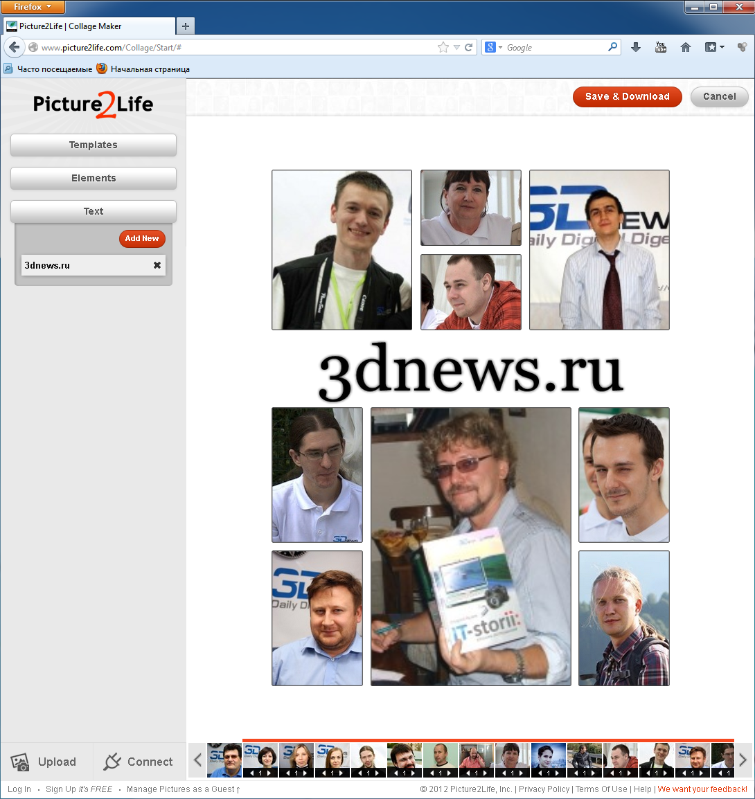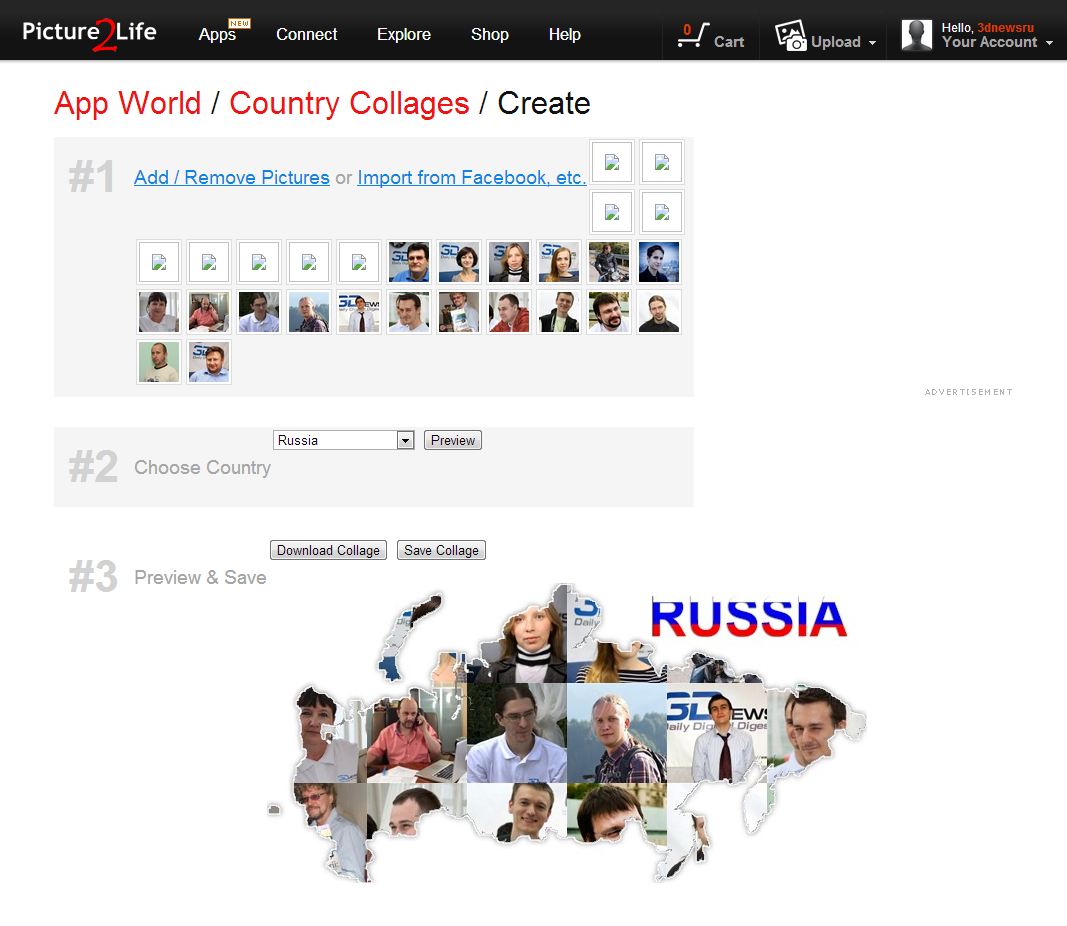 Стоит обратить внимание на шаблон Country Collages, доступный для незарегистрированных пользователей сервиса. Он реализует популярную идею дизайна коллажа, когда группа картинок, например, фотографии людей, в случайном порядке заполняют область, по форме повторяющую географические очертания какой-нибудь страны. Интересно, что список стран неполный, хотя Россия в нем есть. Для зарегистрированных участников сервиса picture2life данный инструмент неактуален — доступны соответствующие шаблоны в библиотеке.