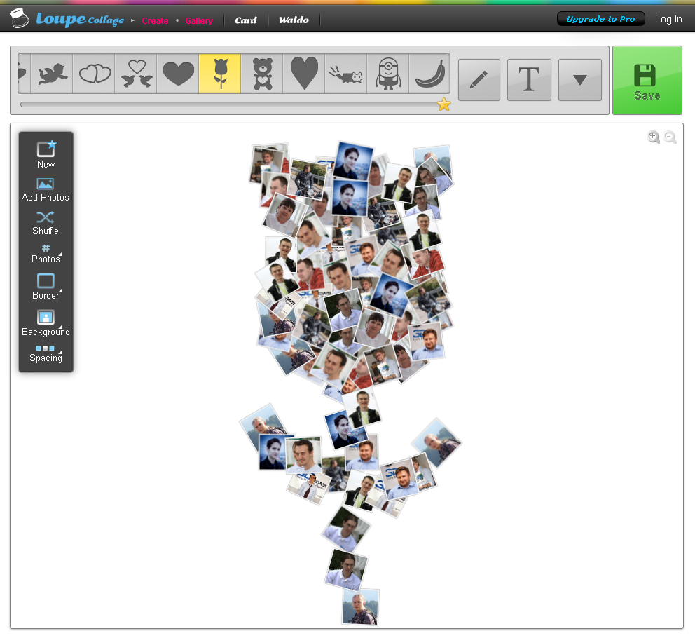 Все коллажи, создаваемые с помощью данного сервиса, строятся по одному и тому же принципу — они заполняют несложную векторную форму, образуя узнаваемую фигуру, например профиль слона, цветок, сердечко и так далее. Процесс генерирования конечного изображения анимирован и выглядит довольно красиво — огромное число уменьшенных фотографий в окне редактора коллажей начинают «сыпаться», образуя нужную фигуру.