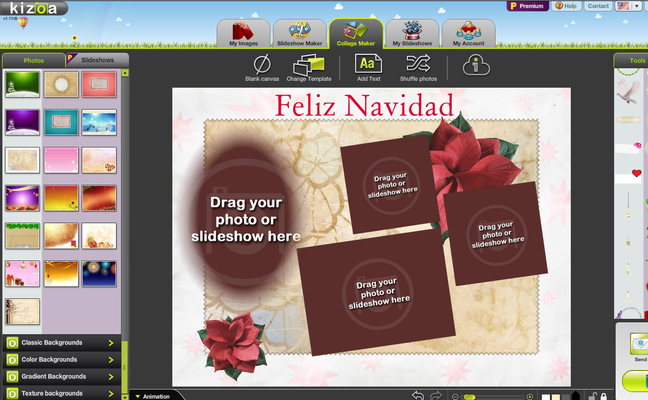 Недостаток шаблонов с лихвой компенсируется большим выбором фоновых изображений и возможностью быстрого создания собственного коллажа. Достаточно загрузить картинки для коллажа, выбрать нужный фон и начать просто перетаскивать их на него. Программа в случайном порядке будет поворачивать их, помогая составить коллаж.