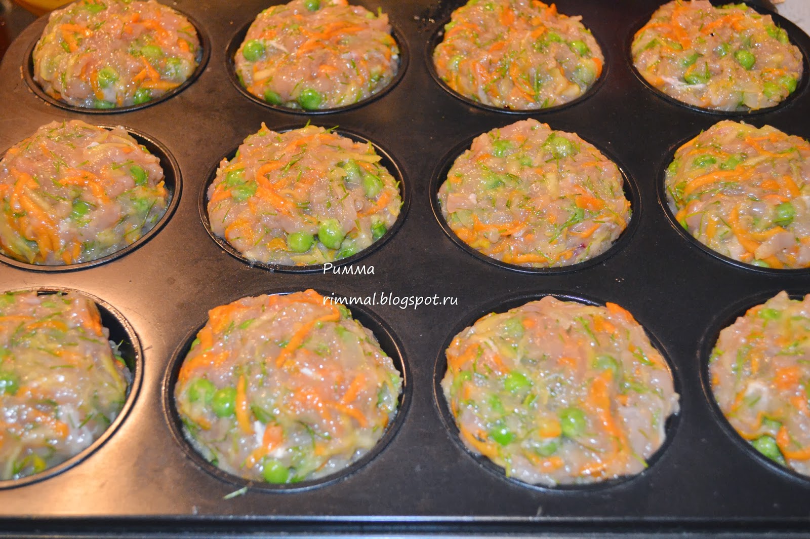 Формы для маффинов смажьте растительным маслом, сформуйте из фарша шарики и разложите их в формочки. Выпекайте при температуре 200 градусов в течение 40-45 минут, пока чуть не подрумянится верх. Помните, что будет выделяться сок, поэтому поставьте в низ поддон с водой.