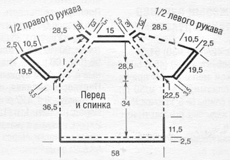 Для скосов рукава убавить с обеих сторон в каждом 2-м р. 2 раза по 1 п. и в каждом 4-м р. 6 раз по 1 п. (провязать после кромочной обе петли вместе протяжкой: снять 1 п. как лицевую, 1 лиц. п. и протянуть её через снятую петлю и провязать обе петли до кромочной вместе лицевой).