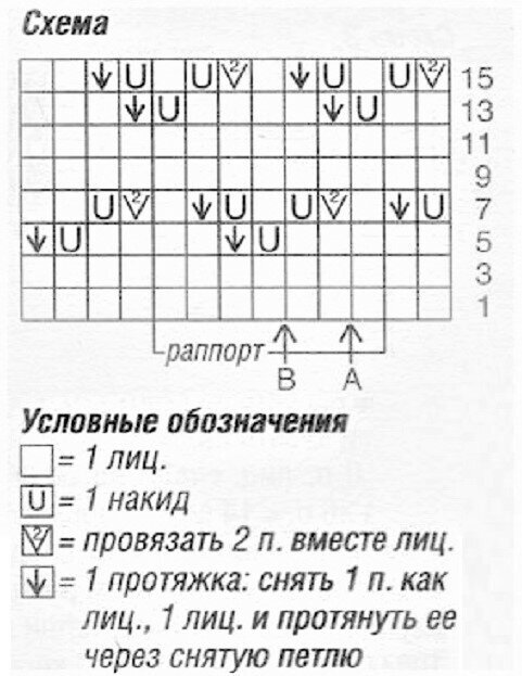 На схеме приведены только лицевые ряды. В изнаночных рядах все петли и накиды вязать изнаночными или соответственно в четных круговых рядах все петли и накиды вязать лицевыми.