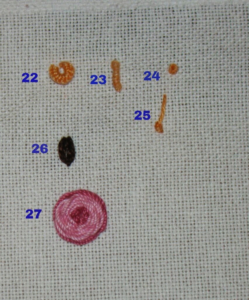 Теперь вышиваем полураскрытые бутоны (3 шт) и маленькие бутоны (5 шт). Все бутоны выполняем самой светлой ниткой из тех, что мы брали для основных роз.
