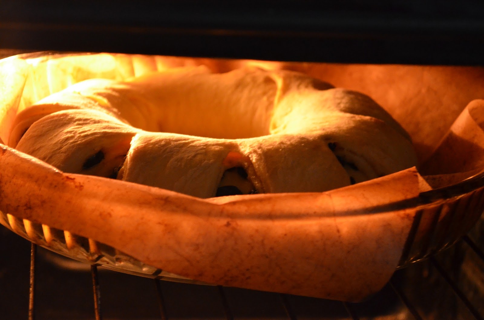 7. свернуть в рулет и соединить концы. Получается кольцо. Все края защипить. ножницами сделать надрезы по всему кругу, накрыть пищевой пленкой и оставить еще на 40 минут. Оно должно еще подняться.