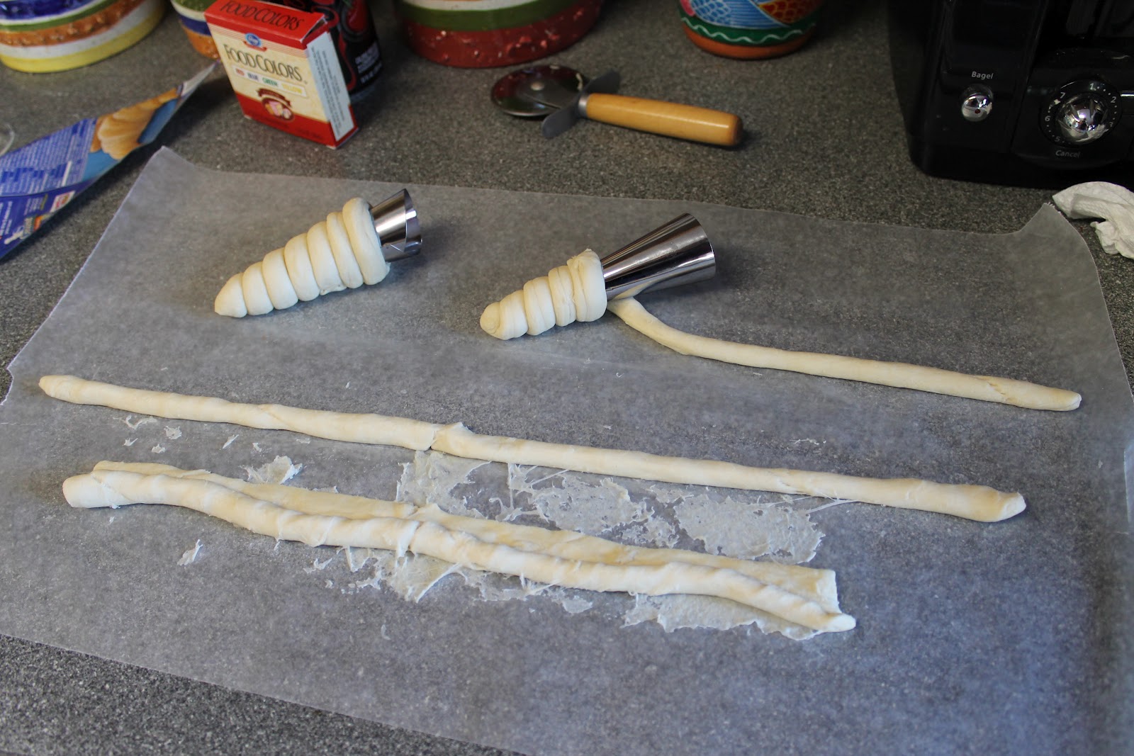 Затем разрезать тесто на шесть равных полос. Раскатать каждую полосу в тонкую змейку
