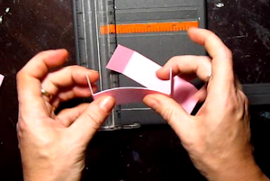 Шаг 8. Нам осталось вклеить две полосочки, на которых держится декор, создающий объем, внутрь. Наносим клей или скотч на отгибающиеся "хвостики"(которые по 1 дюйму) и вклеиваем их как показано на рисунке: спинка-к-спинке. Обязательно сложите открытку, чтобы было все ровненько!
